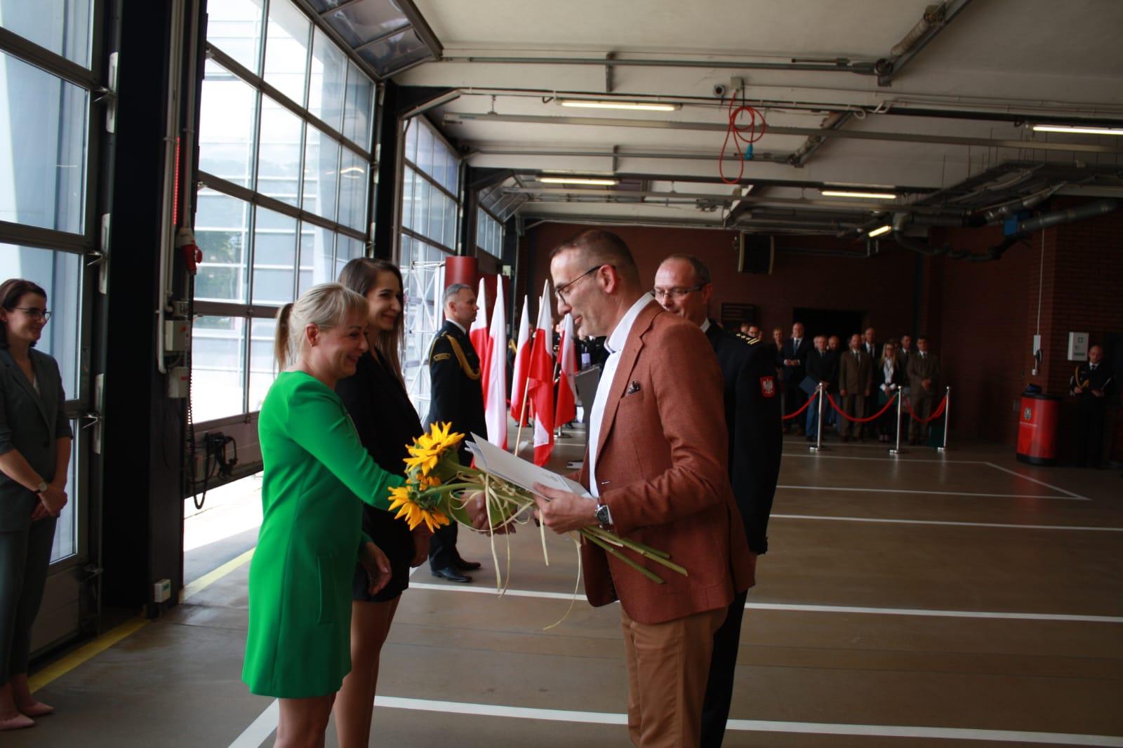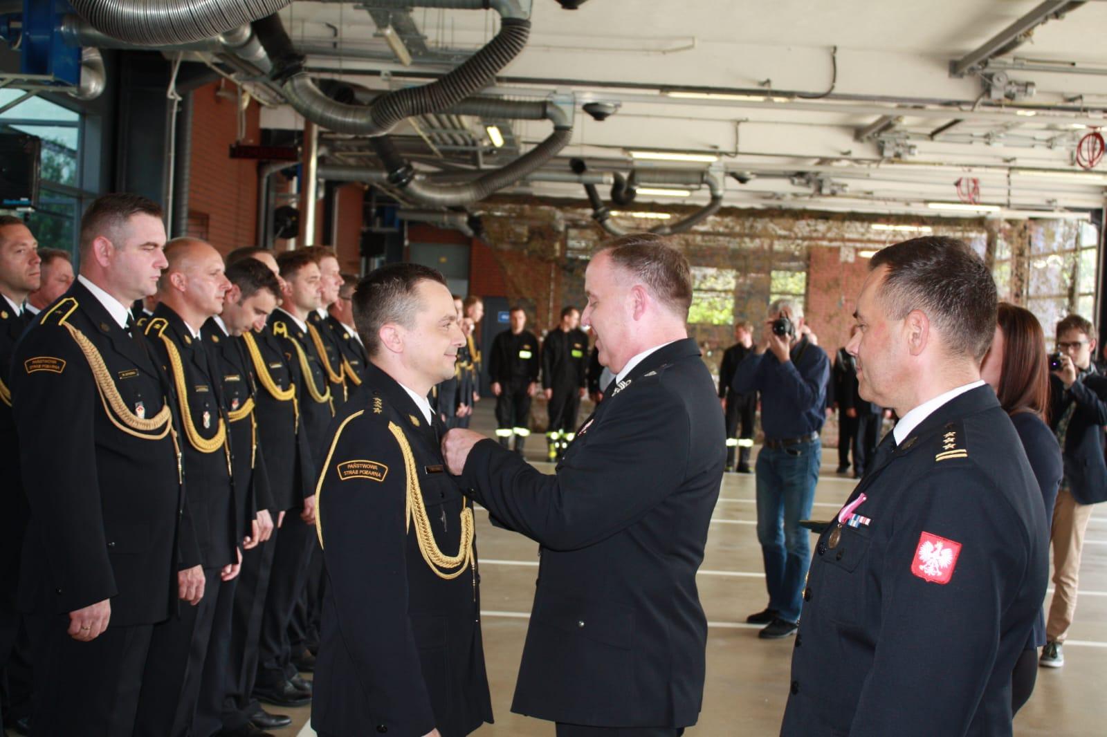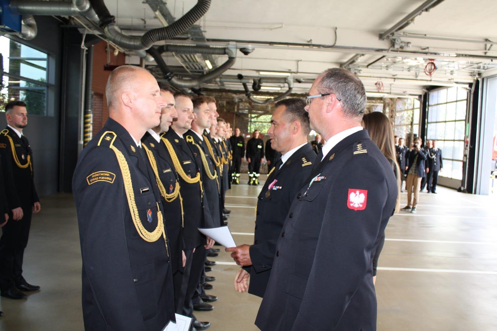 Następnie wręczono odznaczenia resortowe, wyróżnienia i awanse na wyższe stopnie służbowe. Podczas uroczystej zbiórki Starosta Powiatowy Mirosław Duży oraz Zastępca Burmistrza Mikołowa Mateusz Handel wręczyli nagrody dla wyróżniających się pracowników cywilnych i funkcjonariuszy komendy.