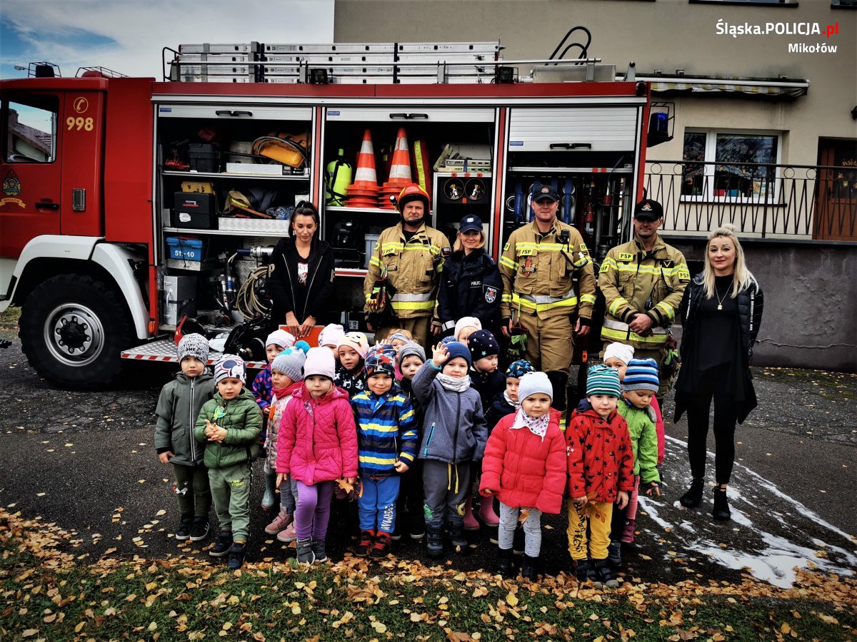 4 listopada 2021 roku w przedszkolu im. Przyjaciół Przyrody w Łaziskach Górnych odbyły się ćwiczenia ewakuacyjne na wypadek pożaru pod nadzorem strażaków Państwowej Straży Pożarnej w Mikołowie. Po zakończonych ćwiczeniach strażacy wspólnie z funkcjonariuszami Komendy Powiatowej Policji w Mikołowie przeprowadzili pogadankę na temat właściwych zachowań w sytuacji zagrożenia, zapoznali ich z zasadami bezpiecznej ewakuacji – szybkiej, zorganizowanej i pozbawionej elementów paniki. Maluchy mogły zobaczyć jak pracują strażacy i jakiego sprzętu używają podczas akcji. Policjanci przekazali najmłodszym odblaski namawiając ich do noszenia szczególnie jesienną porą. Dzięki przekazanym odblaskom mali mieszkańcy miasta mogą być wzorem do naśladowania w akcji "Świeć przykładem".