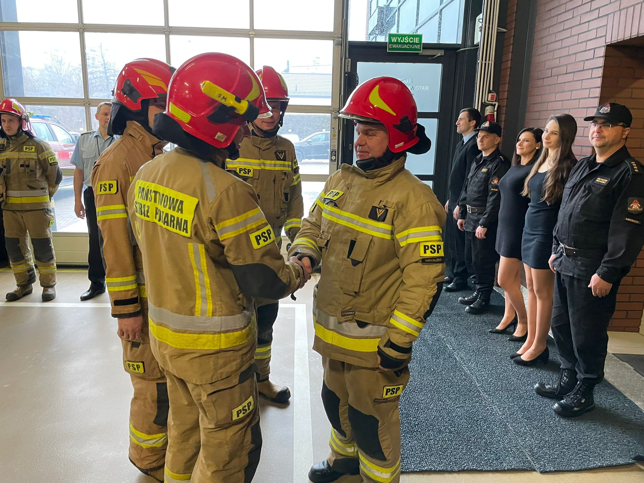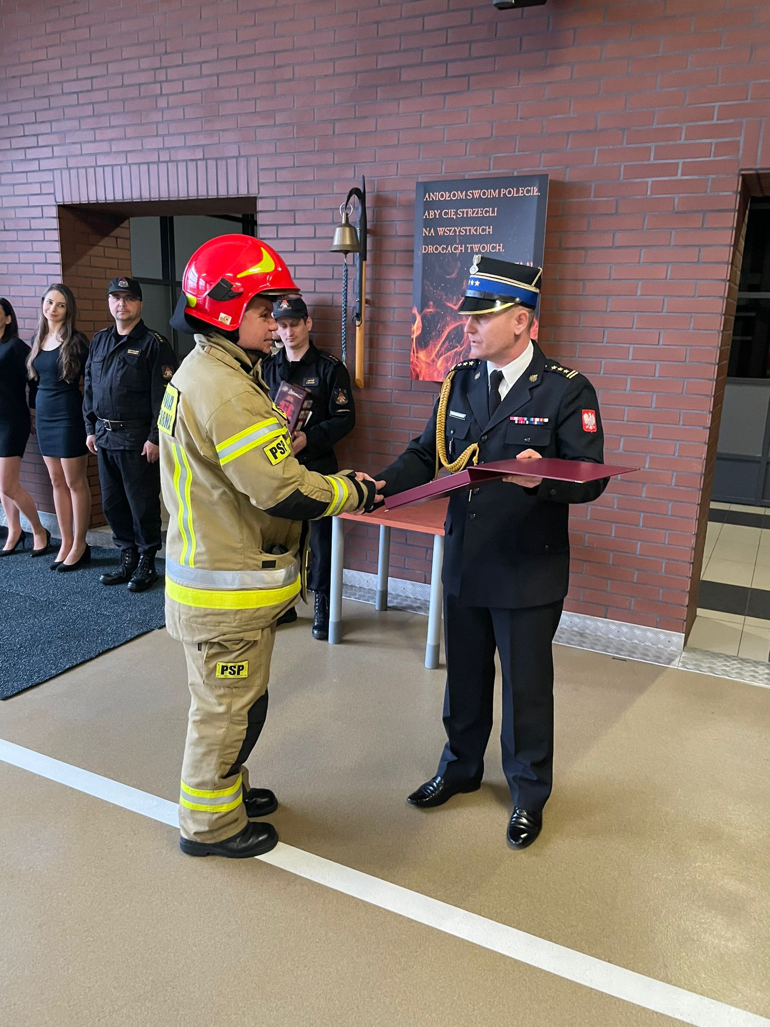 W dniu 24 lutego 2023 r. w Komendzie Powiatowej Państwowej Straży Pożarnej w Mikołowie miała miejsce uroczysta zmiana służby z okazji przejścia na zaopatrzenie emerytalne st. ogn. Marka Strzeleckiego wieloletniego pracownika tutejszej komendy. Podczas uroczystości Komendant Powiatowy PSP w Mikołowie st. bryg. Damian Krawczyk wręczył decyzję w związku z przejściem na zaopatrzenie emerytalne. W imieniu swoim oraz pracowników Komendy złożył podziękowania za wzorową postawę w służbie, wysokie poczucie obowiązku i zaangażowanie, życząc pomyślności i sukcesów w realizacji swoich planów na nowym etapie życia.