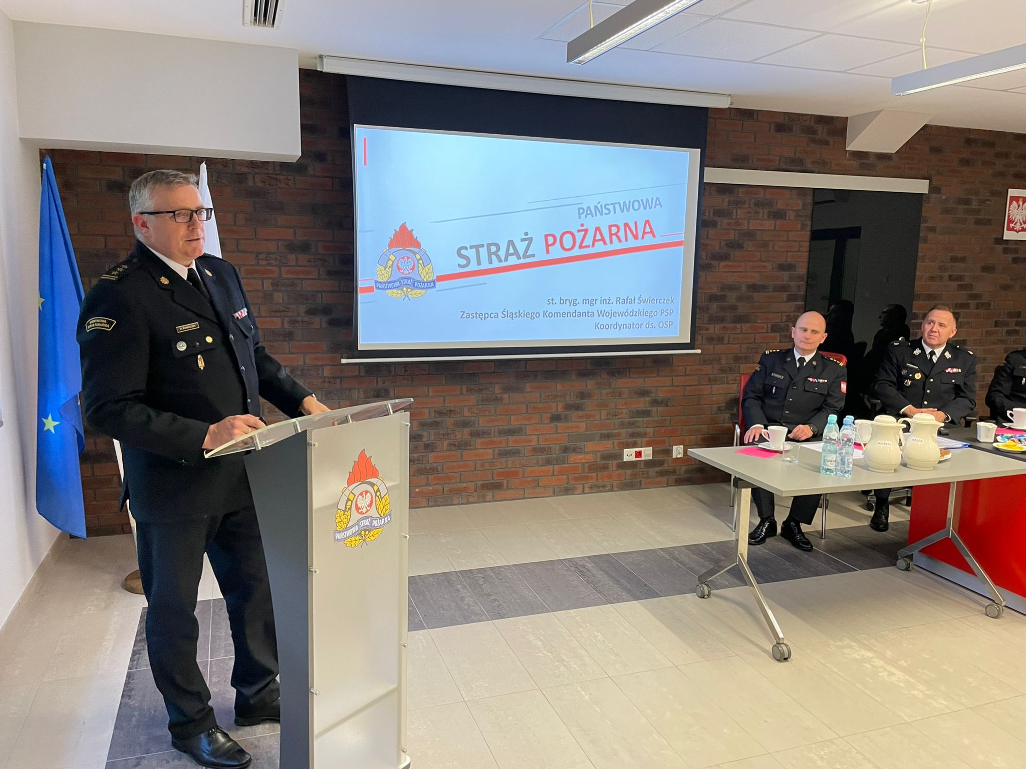 W dalszej części spotkania Zastępca Śląskiego Komendanta Wojewódzkiego PSP st. bryg. Rafał Świerczek przybliżył uczestnikom spotkania założenia oraz główne cele ustawy o Ochotniczych Strażach Pożarnych. Poruszył również stan realizacji ustawy w zakresie wypłat świadczeń ratowniczych oraz stanu przygotowań do realizacji szerokiego spektrum kursów dla druhów OSP. Podziękował również za działania, które jednostka OSP prowadziła podczas stanu epidemicznego oraz za okazaną szeroką pomoc dla uchodźców i strażaków z Ukrainy.