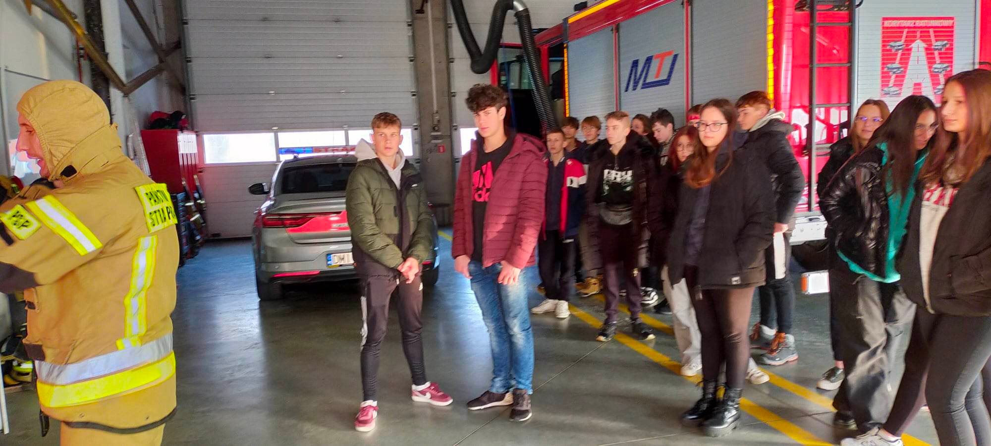 Swoją wizytę w Komendzie PSP młodzież rozpoczęła od zapoznania się z ścieżkami kariery strażackiej. Funkcjonariusze opowiedzieli o swoich doświadczeniach w przygotowaniu do służby, o możliwościach wyboru szkół i kursów, które umożliwiają podjęcie tej odpowiedzialnej pracy. Podkreślili, fakt, iż mimo odpowiedzialności i trudu jaki trzeba włożyć w przygotowania do zawodu praca spełnia ich oczekiwania, daje poczucie zadowolenia i spełnienia oraz możliwość realizacji pasji. Następnie młodzież miała możliwość obserwowania rozwoju pożaru i sposobów jego gaszenia. Omówiono ruch ciepła –przewodzenie, konwekcję i promieniowanie. Funkcjonariusz asp. Jędrzej Kaczmarek przygotował specjalny domek, na którym demonstrował fazy rozwoju pożaru. Uczniowie zobaczyli min. zjawisko rozgorzenia czy efekt backdraft, czyli zjawisko wstecznego ciągupłomieni. Podczas zajęć wykorzystali działanie kamery termowizyjnej i pirometru. Mamy nadzieję, że zajęcia zapadły w pamięć, a może również obudziły pragnienie wstąpienia w szeregi OSP lub PSP.