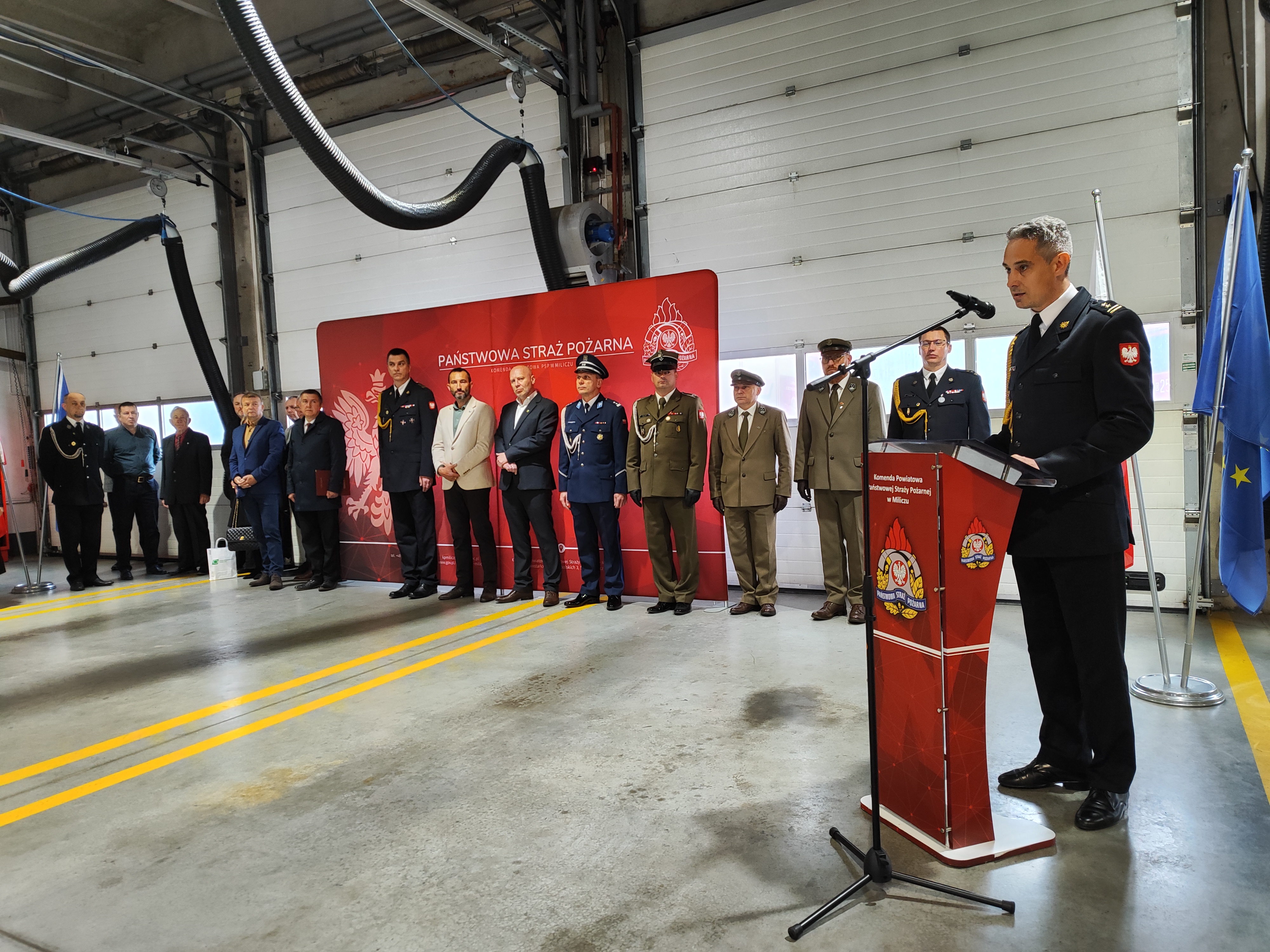 Następnie wprowadzono sztandar Komendy Powiatowej Państwowej Straży Pożarnej w Miliczu oraz odegrano hymn państwowy, po którym nastąpiło przywitanie zaproszonych gości, a byli to między innymi: