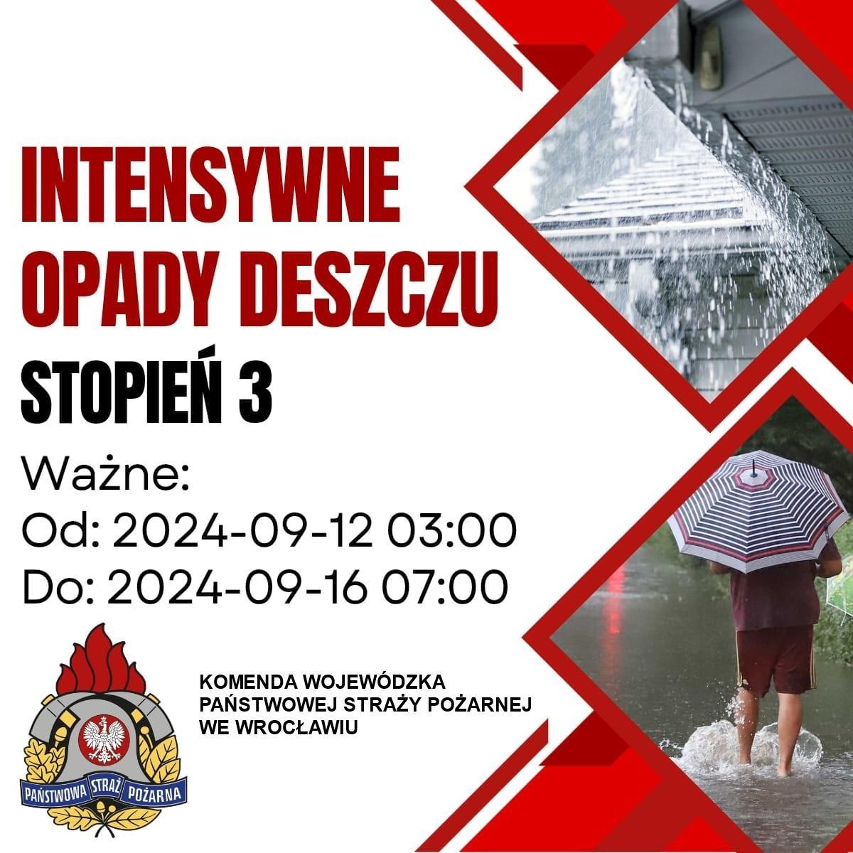 Instytut Meteorologii i Gospodarki Wodnej – Państwowy Instytut Badawczy we Wrocławiu wydał ostrzeżenie 3. stopnia dotyczące intensywnych opadów deszczu na terenie województwa dolnośląskiego. Ostrzeżenie obowiązuje w dniach od 12 do 16 września 2024 roku.