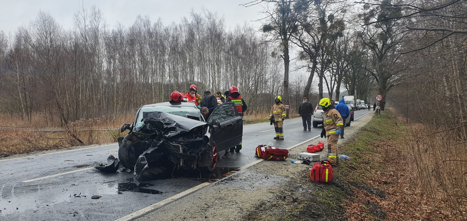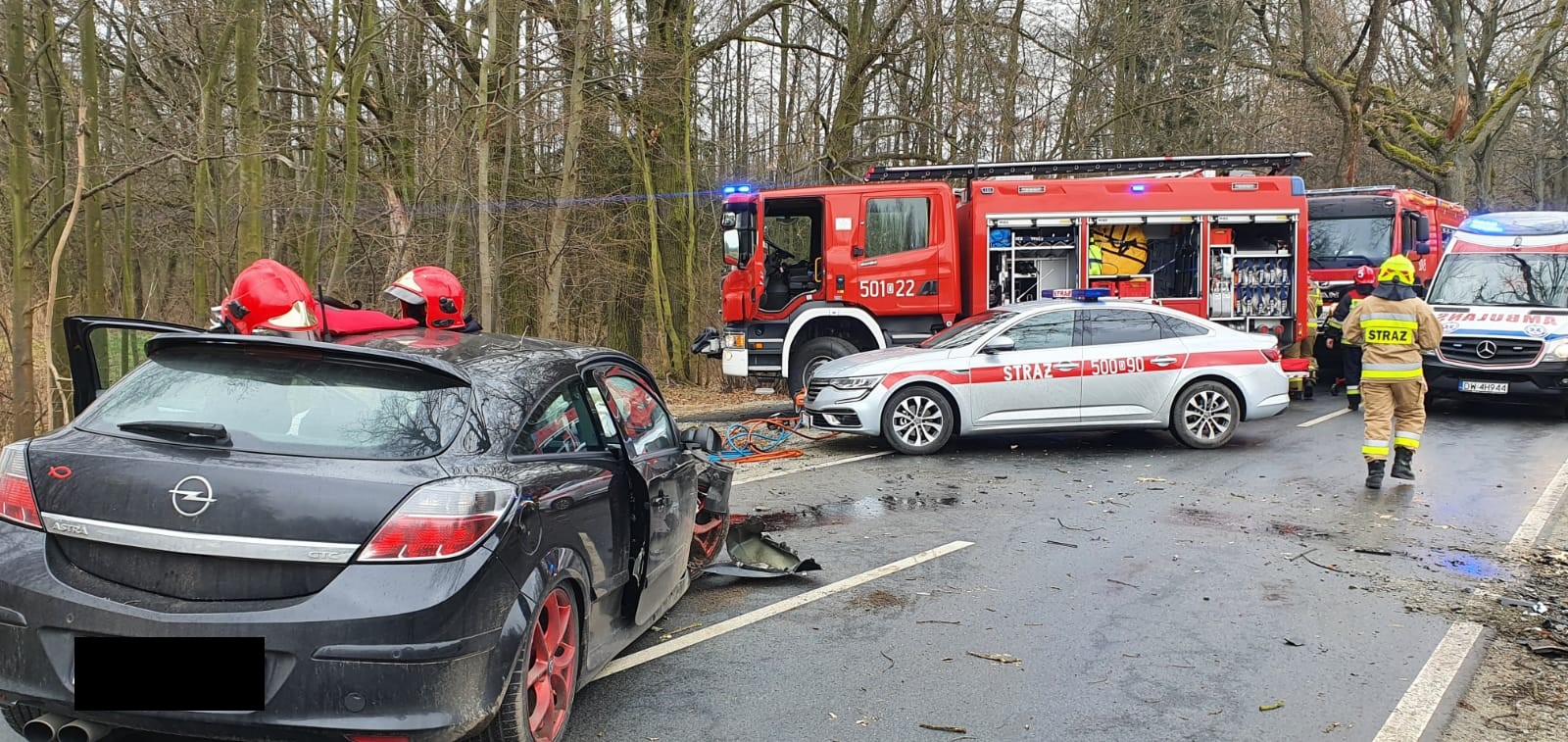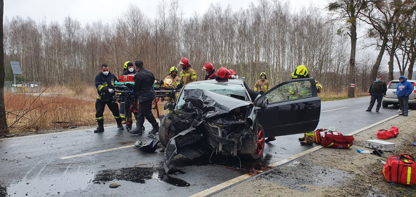 W zeszły wtorek kierowca samochodu osobowego stracił kontrolę nad pojazdem i uderzył w drzewo. Poszkodowane były dwie osoby zakleszczone w pojeździe. Jednostki straży pożarnej po przybyciu na miejsce zdarzenia zabezpieczyły teren akcji, przy użyciu sprzętu hydraulicznego wykonały dostęp do poszkodowanych i ewakuowały bezpiecznie z pojazdu a następnie przekazały zespołowi ratownictwa medycznego przybyłemu na miejsce. Jedną osobę poszkodowaną zabrało lotnicze pogotowie ratunkowe. Ponad to aby zabezpieczyć działania podano poduszkę piany ciężkiej pod komorę silnika aby zabezpieczyć wyciekające płyny. Strażacy we współpracy z Policją zorganizowali objazd na czas prowadzenia czynności dochodzeniowych przez wydział drogówki. W działaniach udział brały 2 zastępy PSP oraz 2 zastępy OSP.
