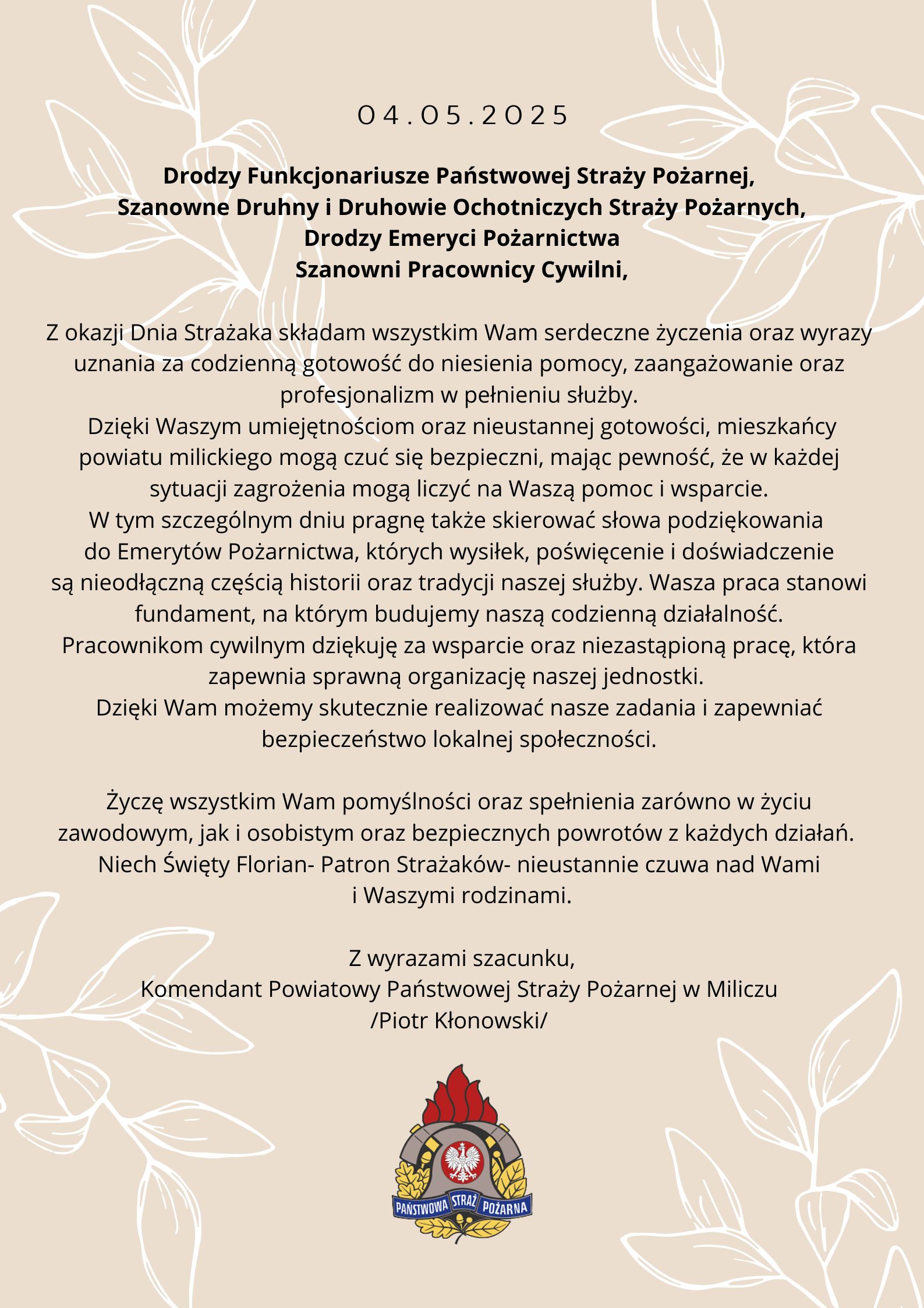 Życzenia Komendanta Powiatowego Państwowej Straży Pożarnej w Miliczu bryg. Piotra Kłonowskiego w okazji Dnia Strażaka 04.05.2025 Zdjęcia (1) Pokaż zdjęcie 1 z galerii.