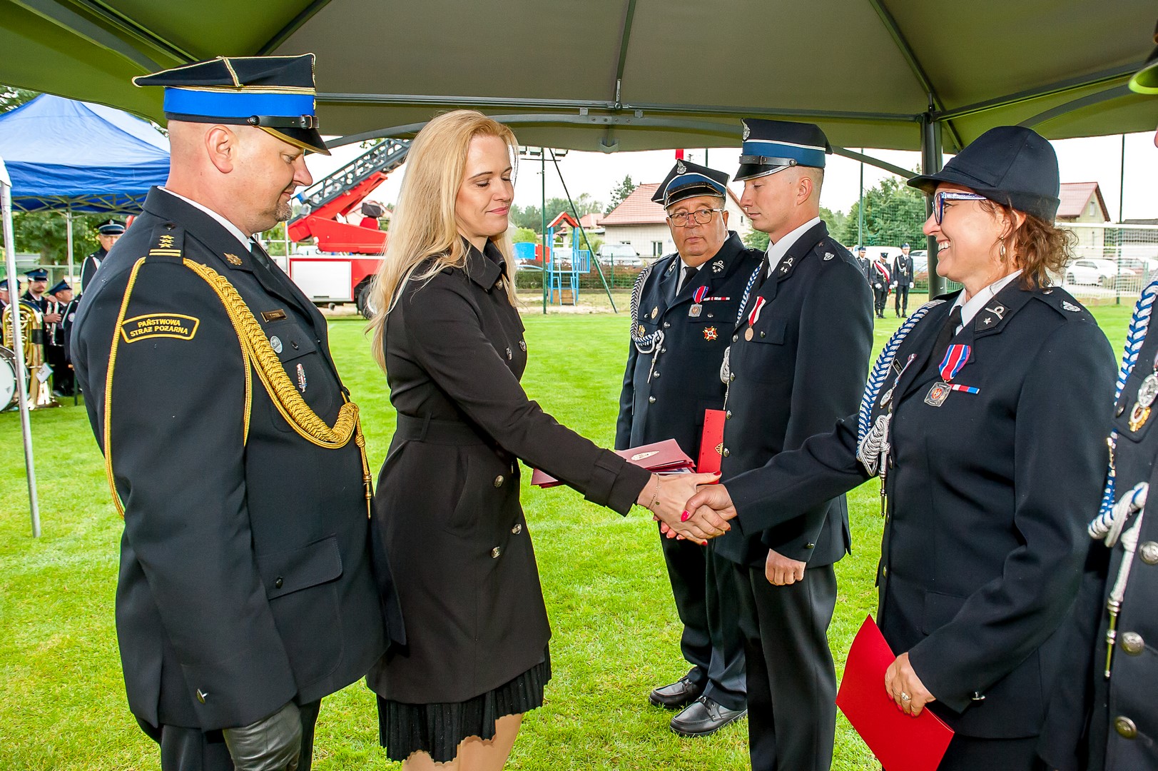 W uroczystości udział wzięli m.in.: Pan Daniel Milewski – poseł na Sejm RP, st. bryg. Tomasz Cybul Zastępca Mazowieckiego Komendanta Wojewódzkiego PSP, radni sejmiku województwa mazowieckiego Pani Joanna Bala oraz Pan Michał Góras, dh Antoni Jan Tarczyński Prezes Zarządu Oddziału Wojewódzkiego i Powiatowego ZOSP RP – starosta Miński, st. bryg. Krzysztof Komorowski Komendant Powiatowy PSP w Mińsku Mazowieckim, burmistrz Halinowa Pan Adam Ciszkowski wraz z przewodniczącym rady oraz przedstawiciele zaprzyjaźnionych firm i instytucji.