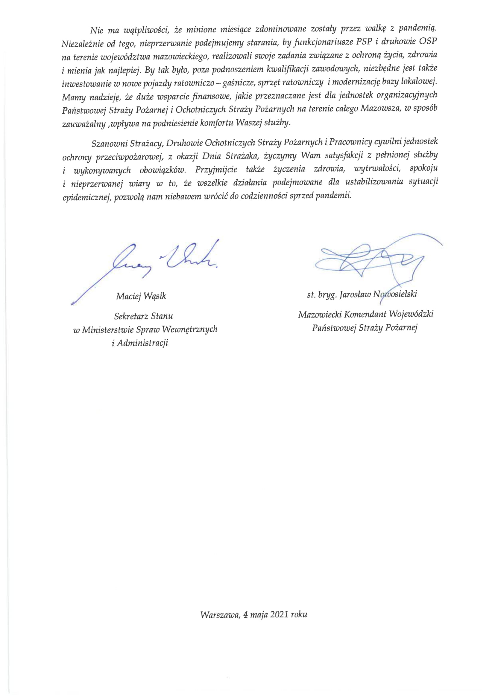 List Mazowieckiego Komendanta Wojewódzkiego Państwowej Strazy Pożarnej st. bryg. Jarosława Nowosielskiego oraz Sekretarza Stanu w Ministerstwie Sprawa Wewnętrznych i Administracji Pana Macieja Wąsika dla strażaków, pracowników ochrony przeciwpożarowej, druhów Ochotniczych Straży Pożarnych oraz sympatyków służby pożarniczej z okazji Dnia Strażaka w 2021 r.