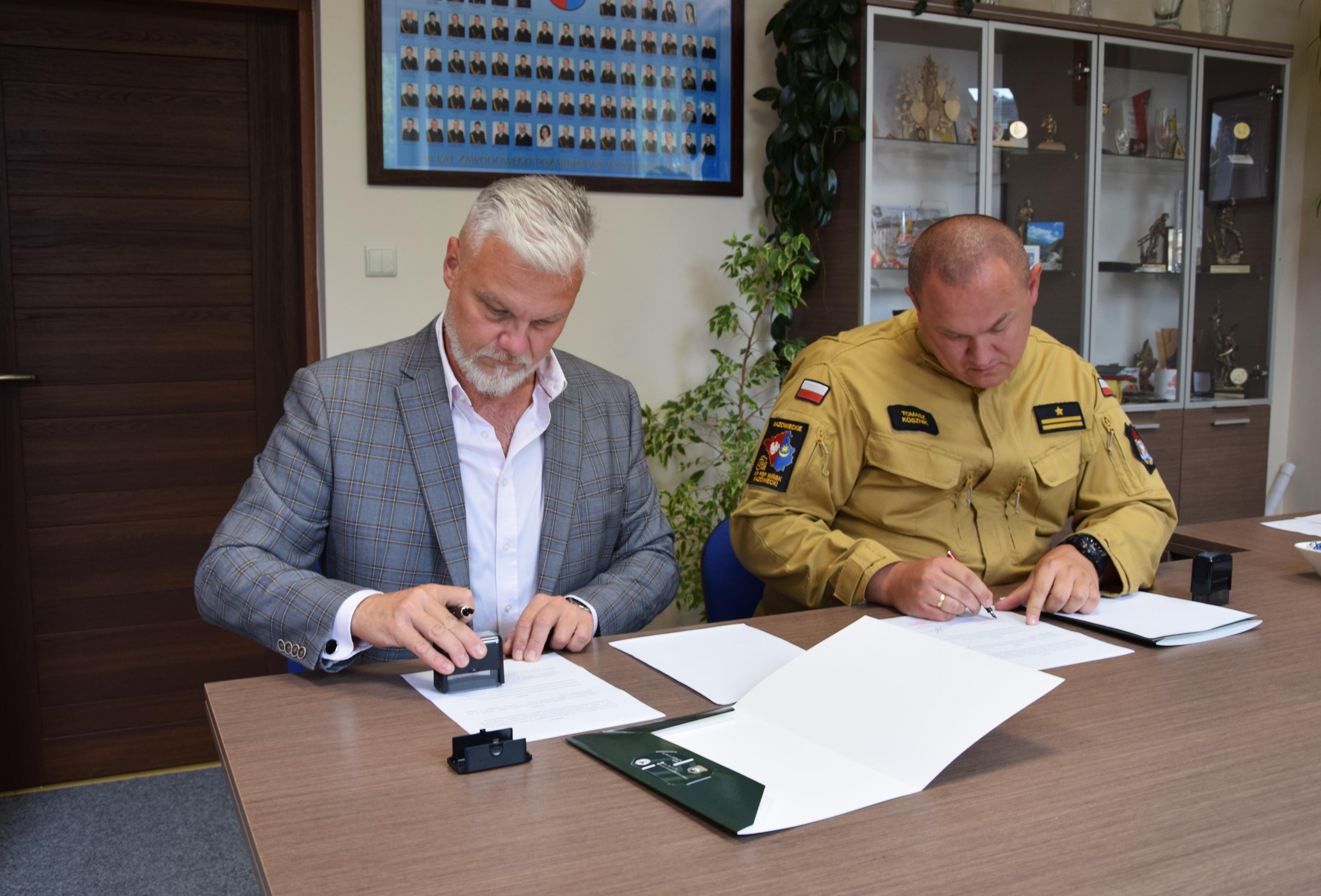 Komendant Powiatowy Państwowej Straży Pożarnej w Mińsku Mazowieckim, mł. bryg. Tomasz Kosznik, podpisał porozumienie o współpracy z I Liceum Ogólnokształcącym Płockiego Uniwersytetu Ludowego im. Cichociemnych Spadochroniarzy Armii Krajowej w Dębem Wielkim reprezentowanym przez Pana Mariusza Księżopolskiego - Dyrektora Szkoły.