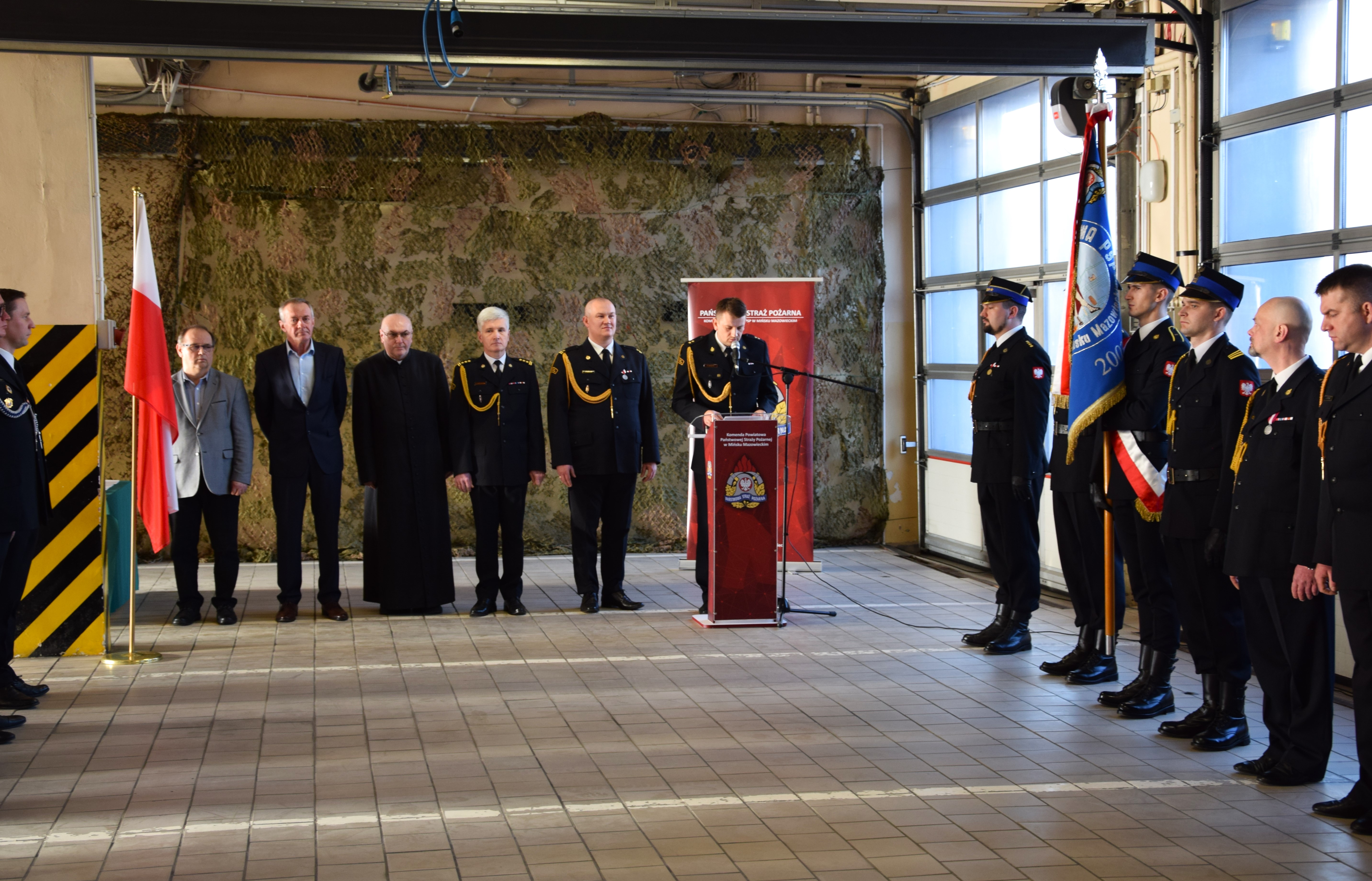 Uroczystość rozpoczęła się złożeniem meldunku przez dowódcę uroczystości, który przyjął p.o. Komendant Powiatowy PSP w Mińsku Mazowieckim - mł. bryg. Tomasz Kosznik. Następnie wprowadzony został sztandar oraz odegrano hymn narodowy.