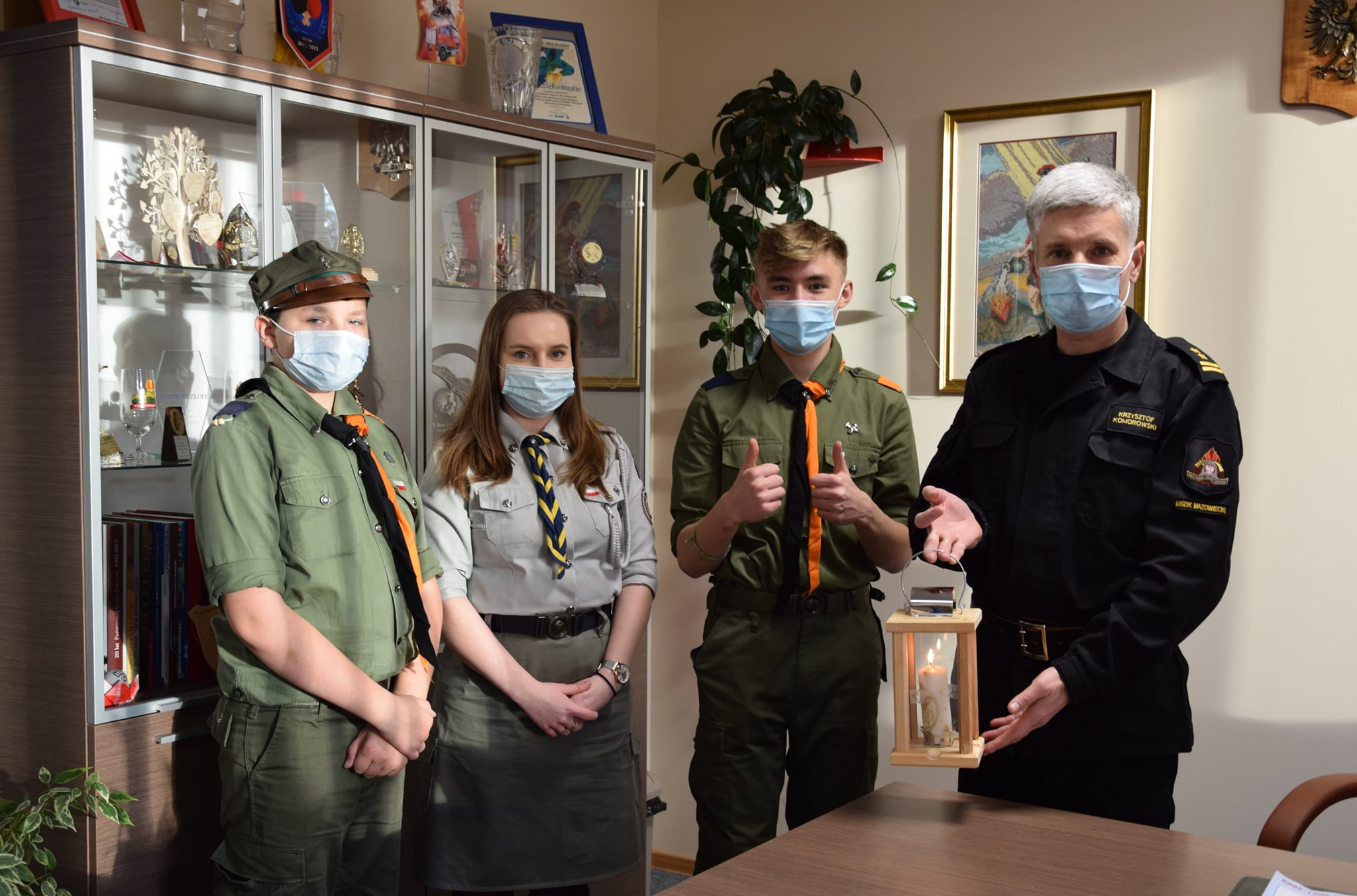 W dniu 20 grudnia 2021 r. z wizytą do tut. Komendy przyszli przedstawiciele Hufiec ZHP "Mazowsze" Mińsk Mazowiecki wraz z Panią Komendant pwd. Klaudią Brześkiewicz. Podczas spotkania harcerze przekazali na ręce Komendanta Powiatowego PSP w Mińsku Mazowieckim bryg. Krzysztofa Komorowskiego Betlejemskie Światło Pokoju wraz z serdecznymi życzeniami świątecznymi dla strażaków oraz pracowników cywilnych tut. Komendy. Dziękujemy
