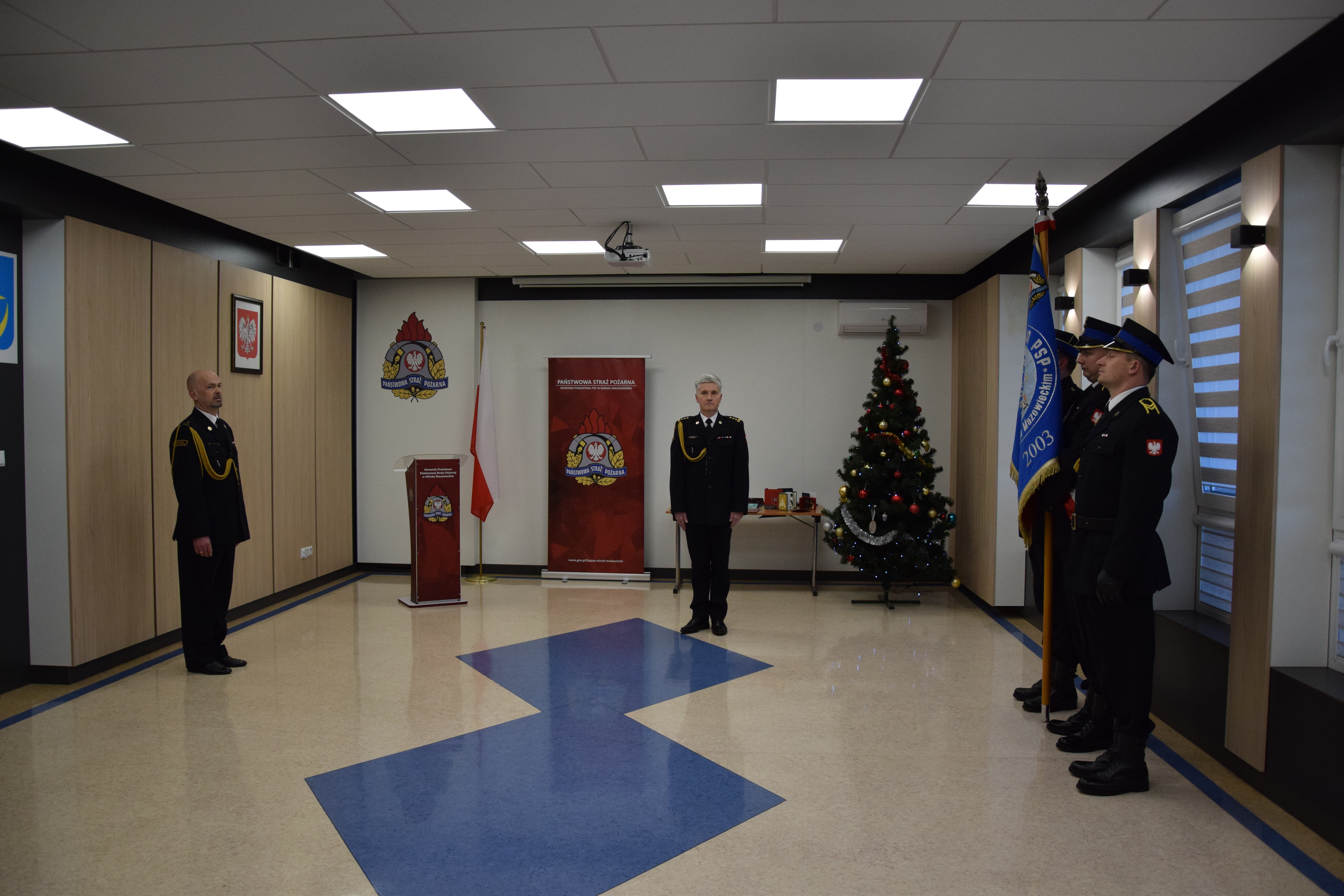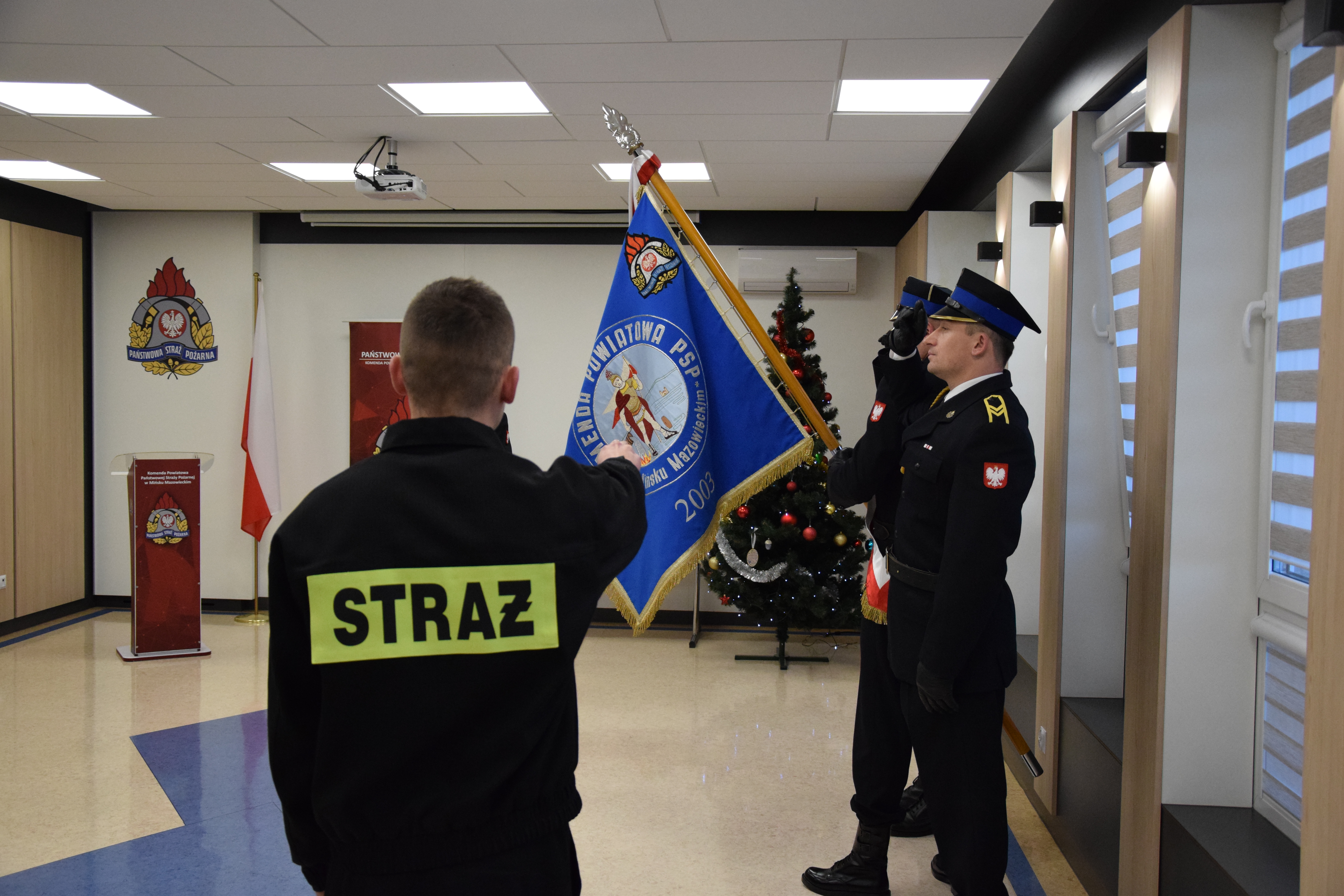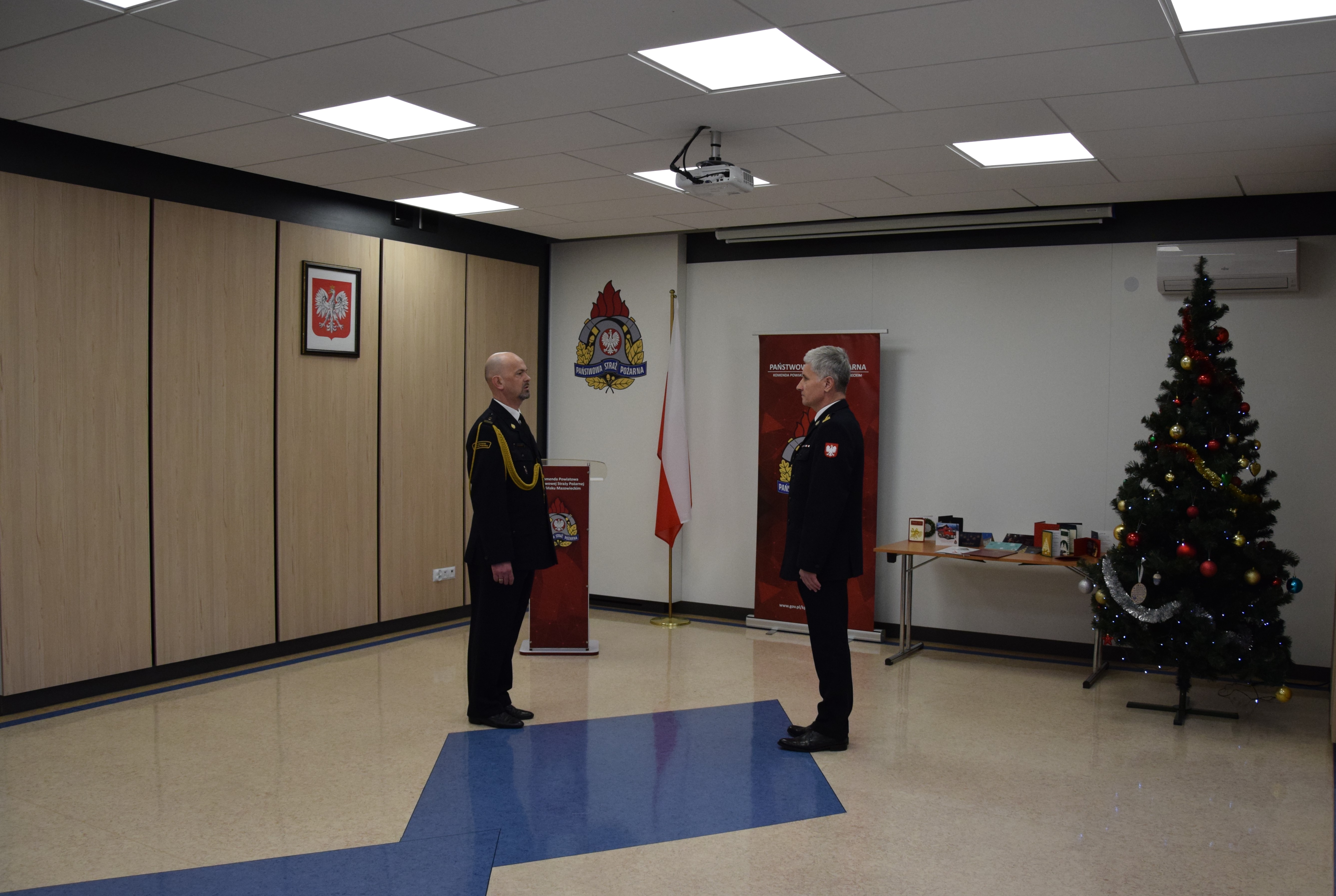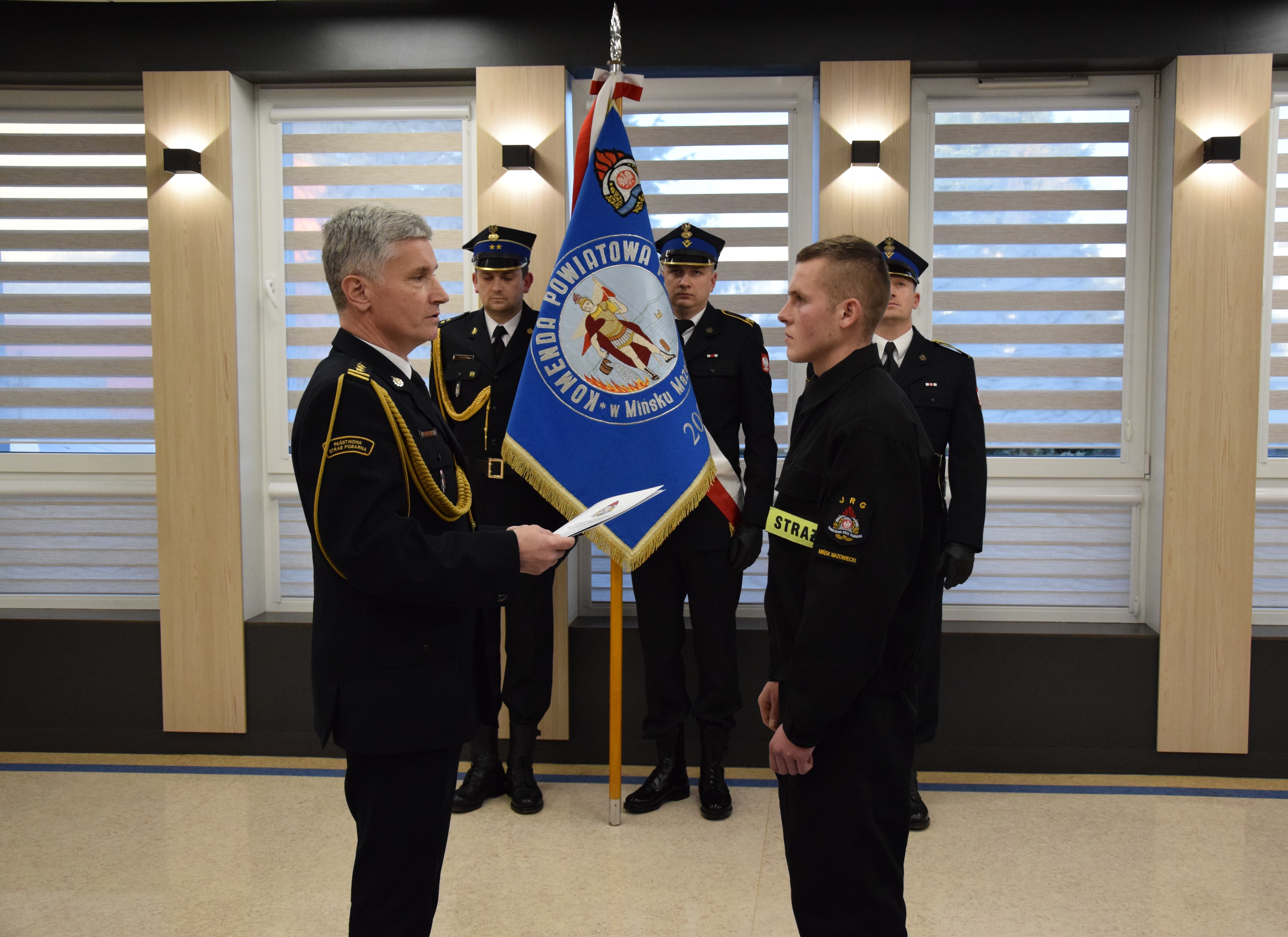 Uroczystość rozpoczęła się złożeniem meldunku Komendantowi Powiatowemu PSP w Mińsku Mazowieckim przez dowódcę Jednostki Ratowniczo-Gaśniczej. Następnie nowo przyjęty funkcjonariusz złożył Panu Komendantowi ślubowanie na Sztandar Komendy: