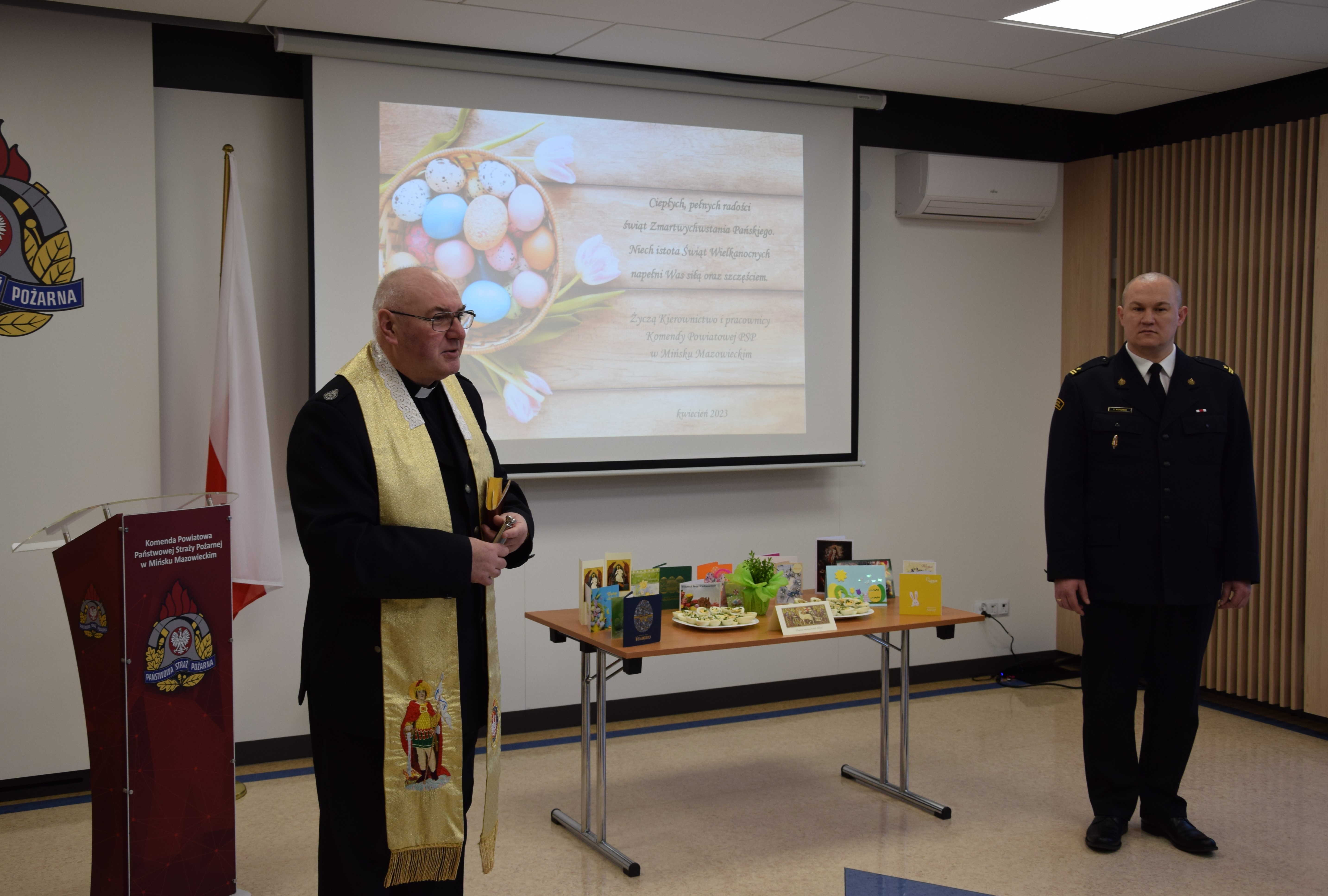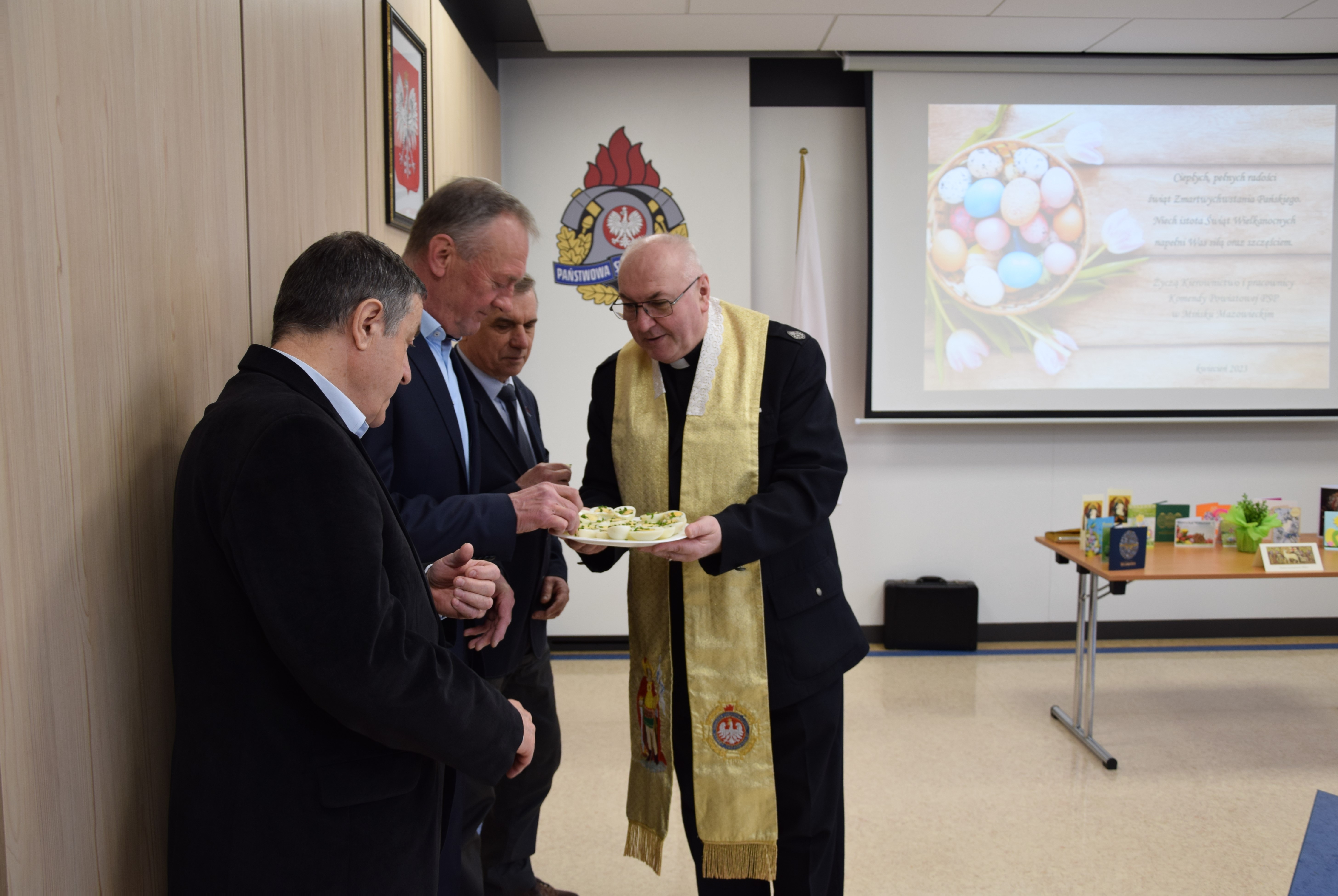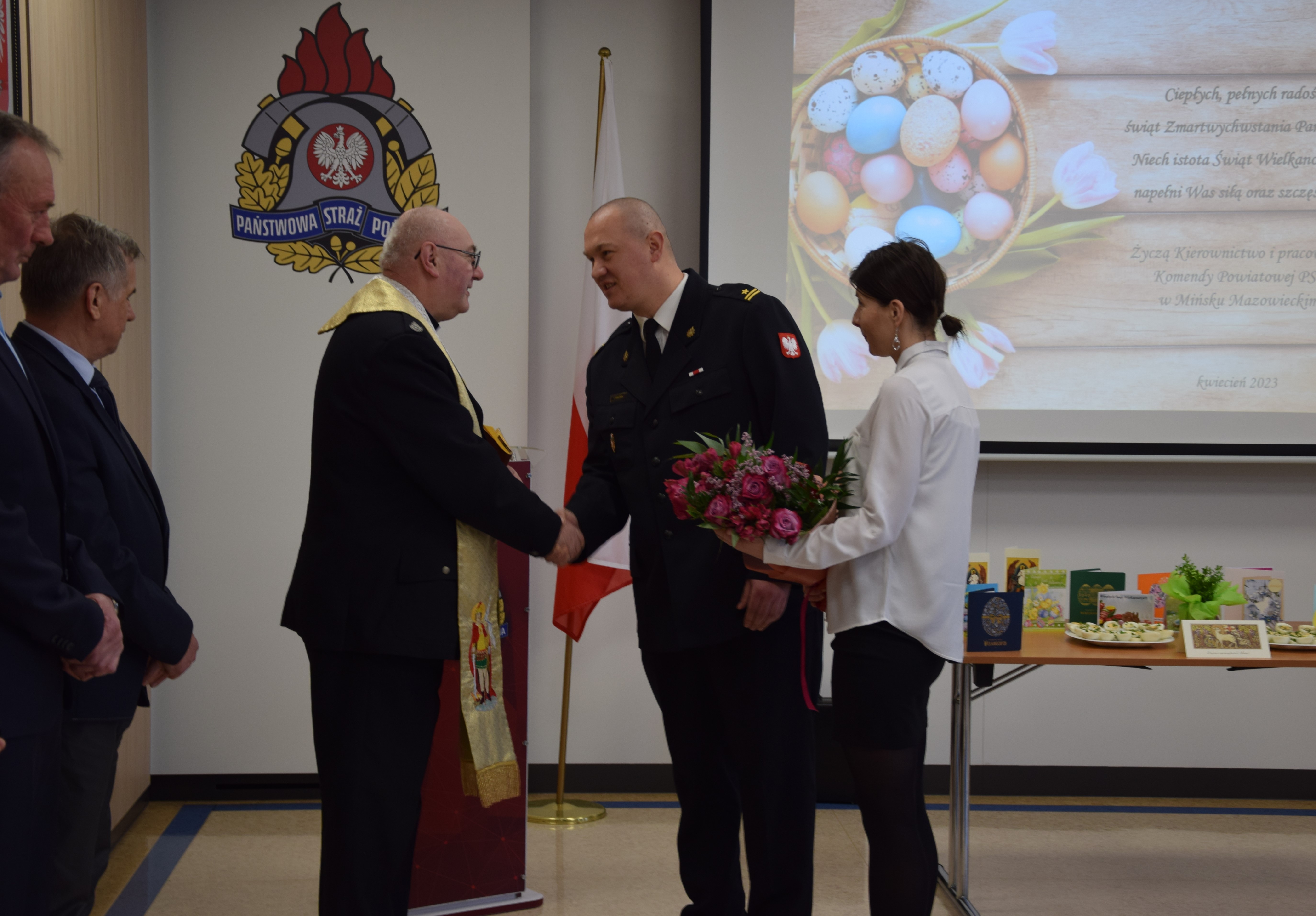 Podczas spotkania Zastępca Komendanta Powiatowego PSP w Mińsku Mazowieckim złożył wszystkim obencym serdeczne życzenia zdrowia i spokoju na nadchodzące święta Wielkanocy.