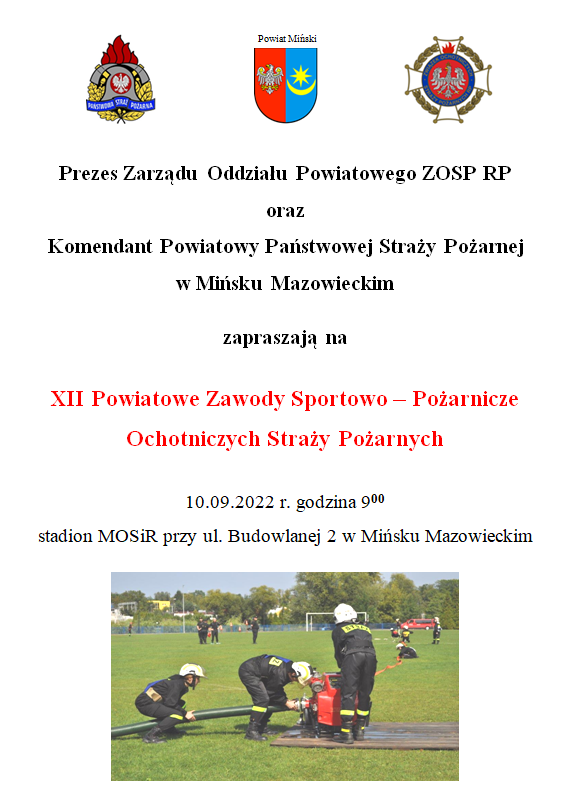 Prezes Zarządu Oddziału Powiatowego ZOSP RP oraz Komendant Powiatowy PSP w Mińsku Mazowieckim serdecznie zapraszają na XII Powiatowe Zawody Sportowo-Pożarnicze, które odbędą się 10 września 2022 roku, o godz. 9:00, na stadionie MOSiR przy ul. Budowlanej 2 w Mińsku Mazowieckim.