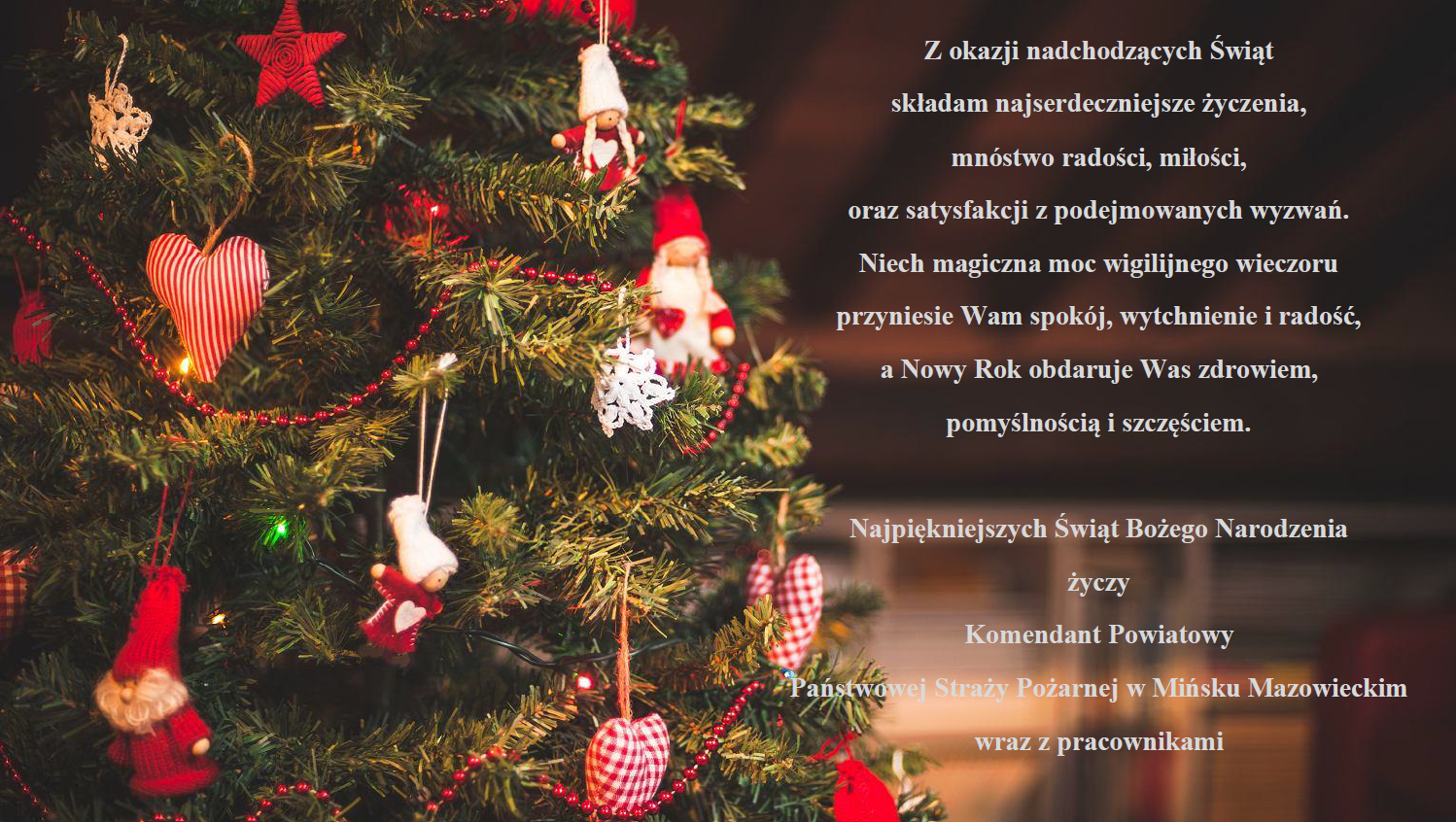 Kierownictwo, strażacy oraz pracownicy Komendy Powiatowej Państwowej Straży Pożarnej w Mińsku Mazowieckim pragną złożyć serdeczne życzenia ciepłych, radosnych i spokojnych Świąt Bożego Narodzenia oraz szczęśliwego Nowego Roku 2025.