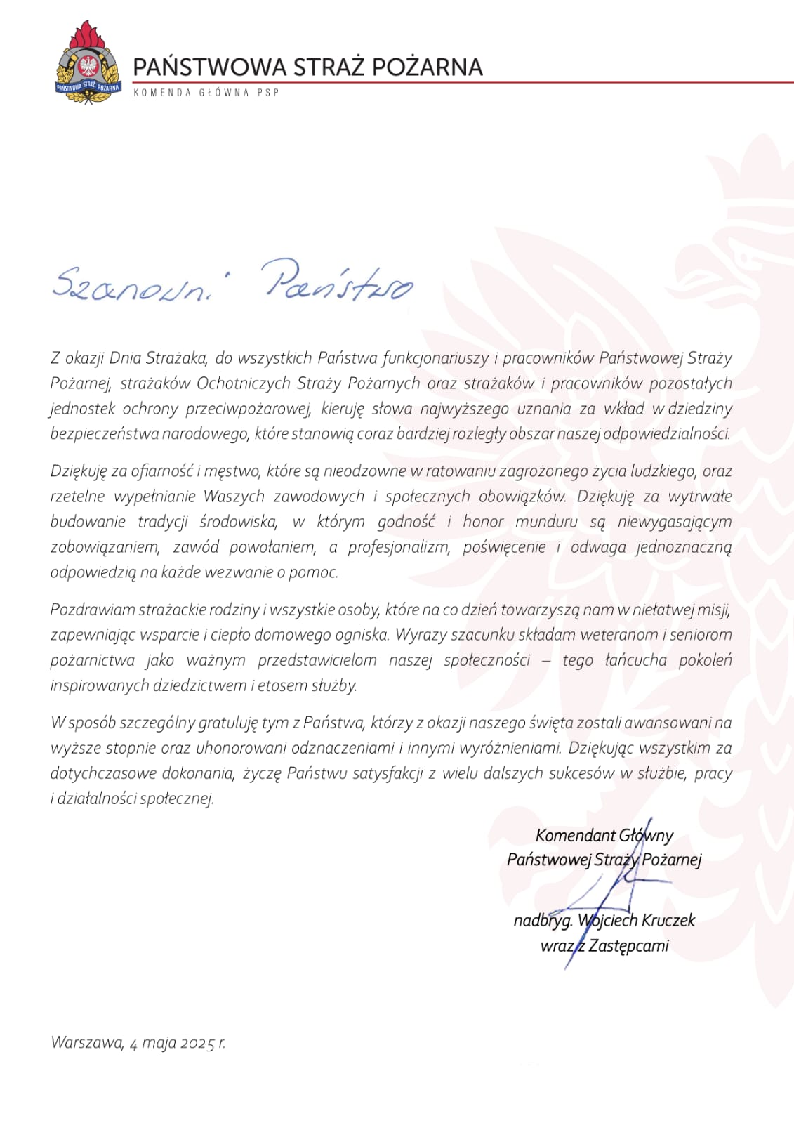 Życzenia Komendanta Głównego Państwowej Straży Pożarnej z okazji Dnia Strażaka 04.05.2025 Zdjęcia (1) Pokaż zdjęcie 1 z galerii.