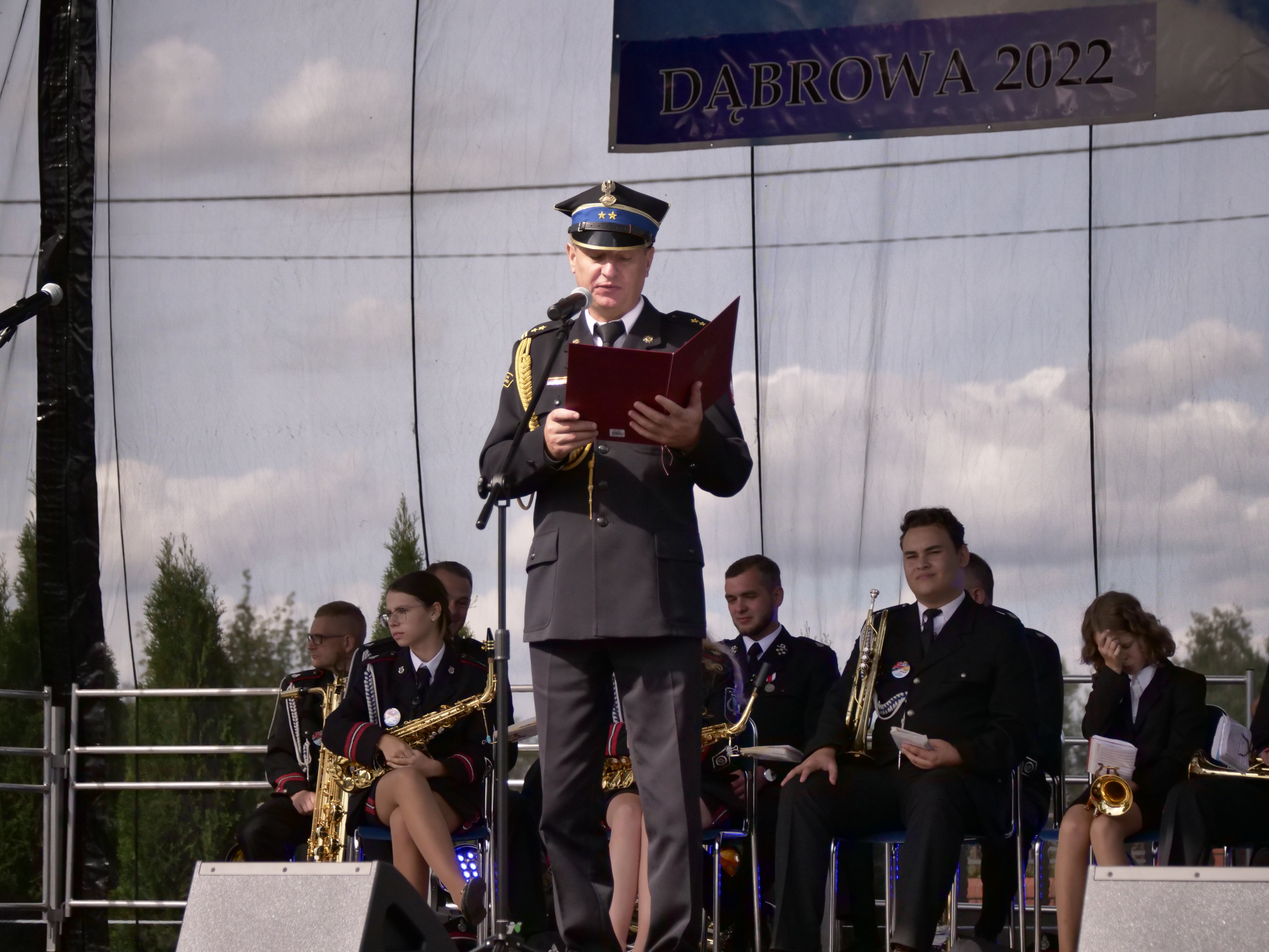 i przeglądem obecnych pododdziałów. Po podniesieniu flagi państwowej na maszt oraz odegraniu hymnu narodowego nastąpiło wręczenie medali, odznaczeń i wyróżnień druhom z OSP w Dąbrowie. Komendant Powiatowy Państwowej Straży Pożarnej w Mławie, bryg. Mirosław Wójcik odczytał,