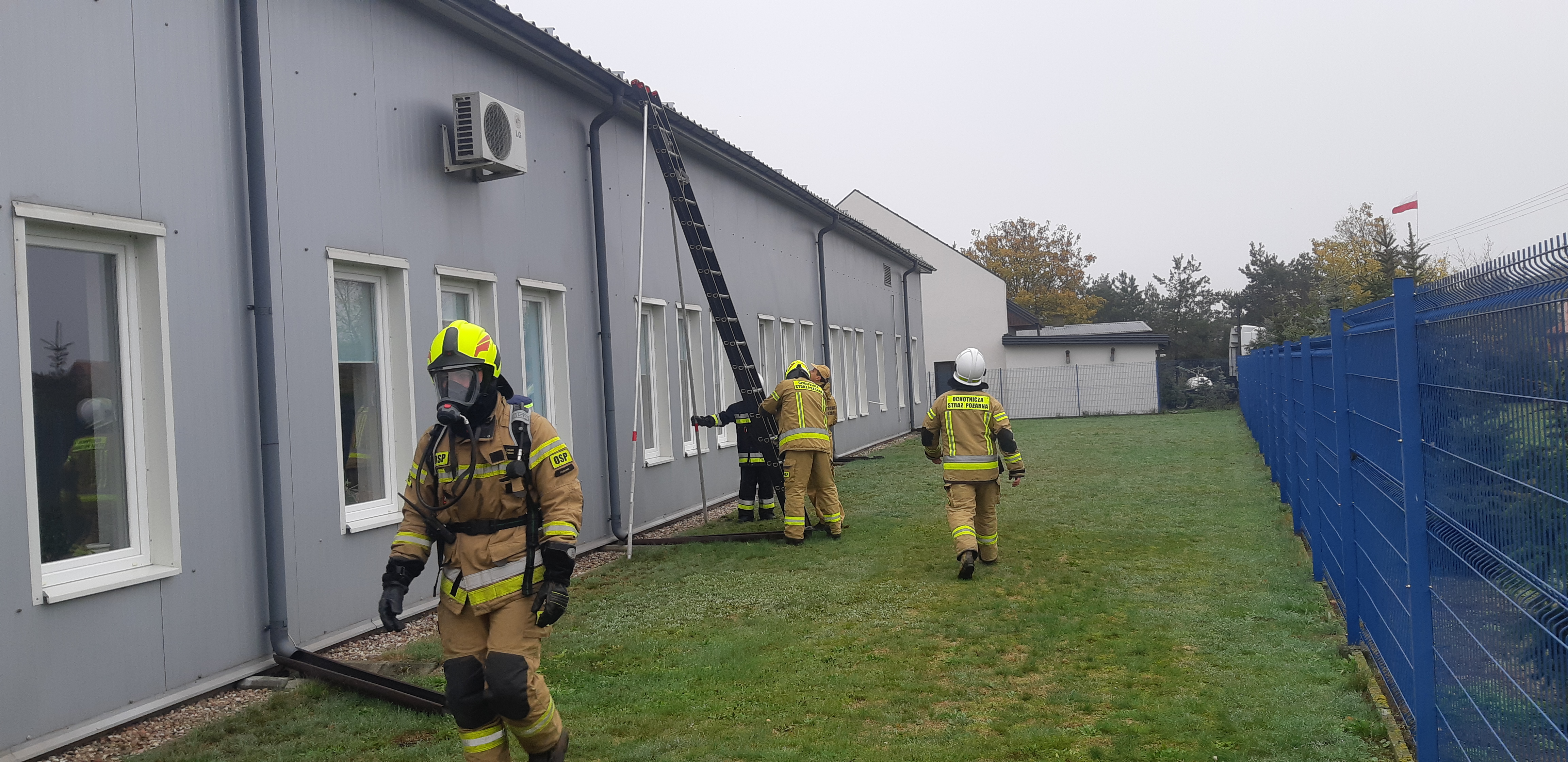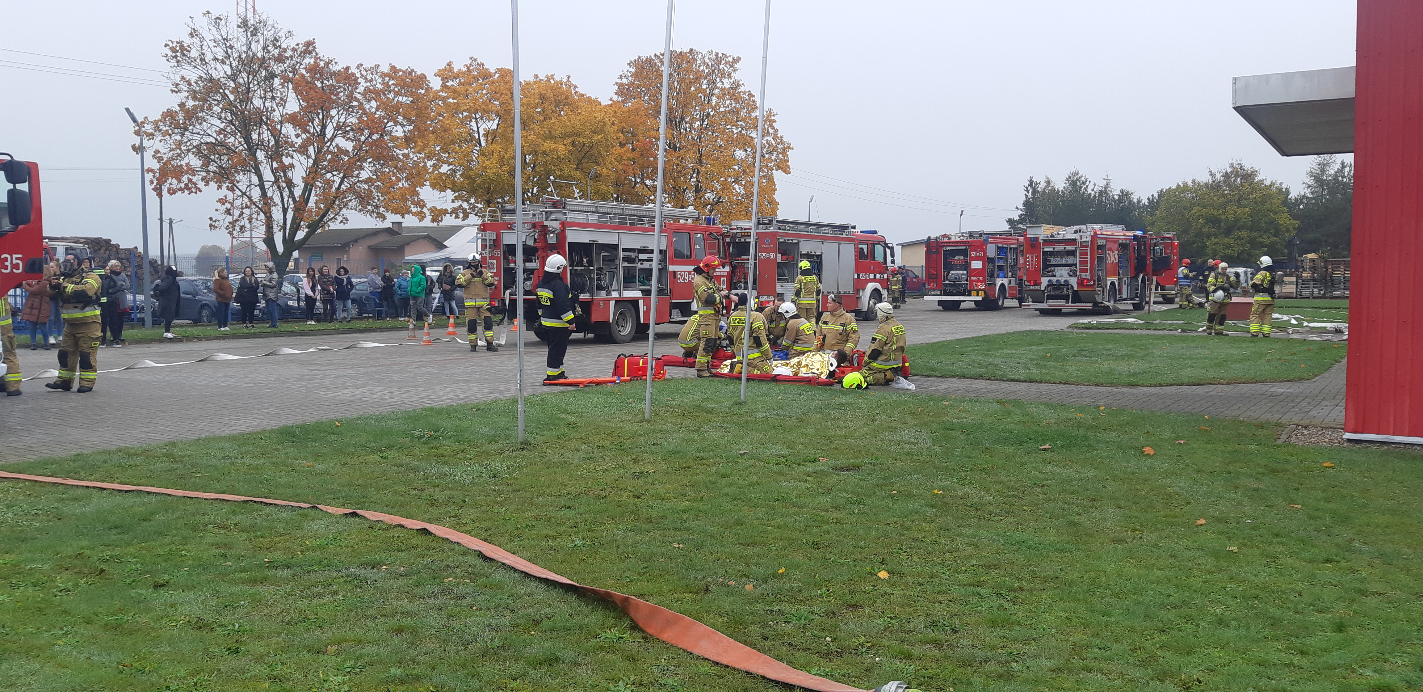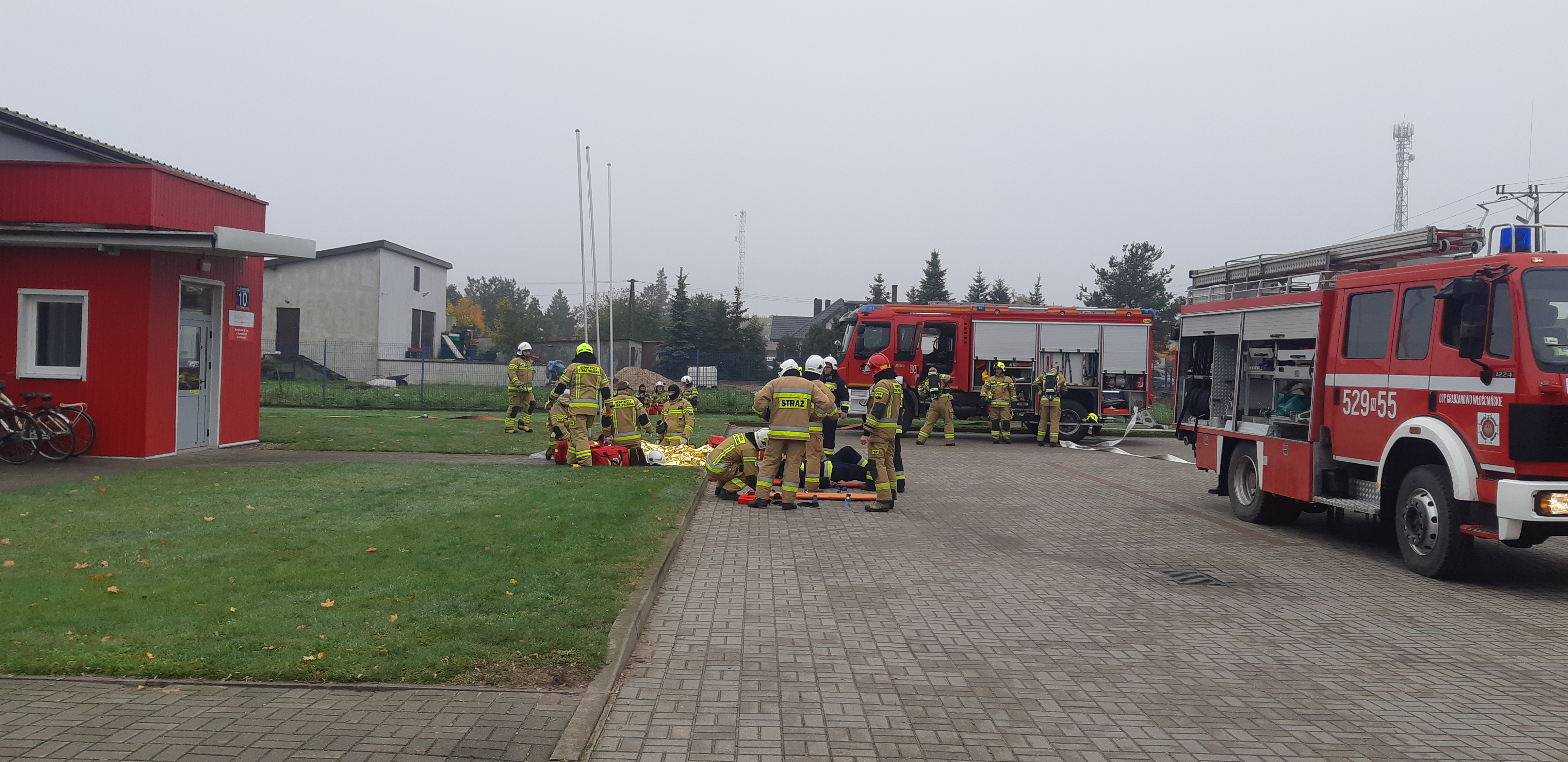 Następnie uczestnicy szkolenia w pełnym umundurowaniu i zabezpieczeniu osobistym zajęli miejsca w samochodach strażackich oczekując na dysponowanie do działań ratowniczo-gaśniczych. Scenariusz zakładał pożar i towarzyszące jemu silne zadymienie w hali produkcyjnej. Przed przybyciem na miejsce zdarzenia pierwszych jednostek ochrony przeciwpożarowej kierownictwo zakładu przeprowadziło ewakuację personelu z obiektu objętego pożarem, jednocześnie stwierdzając brak 4 pracowników.
