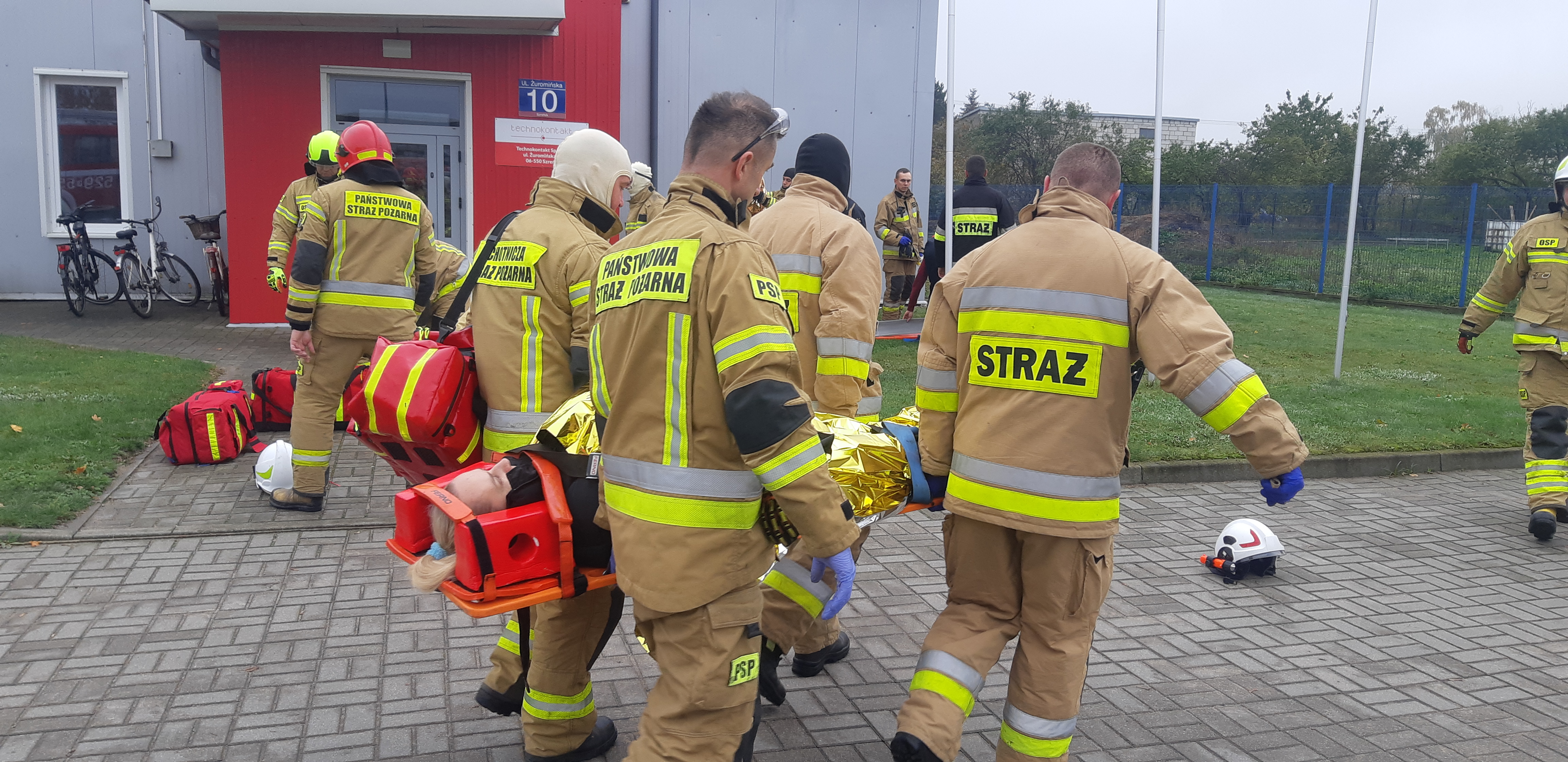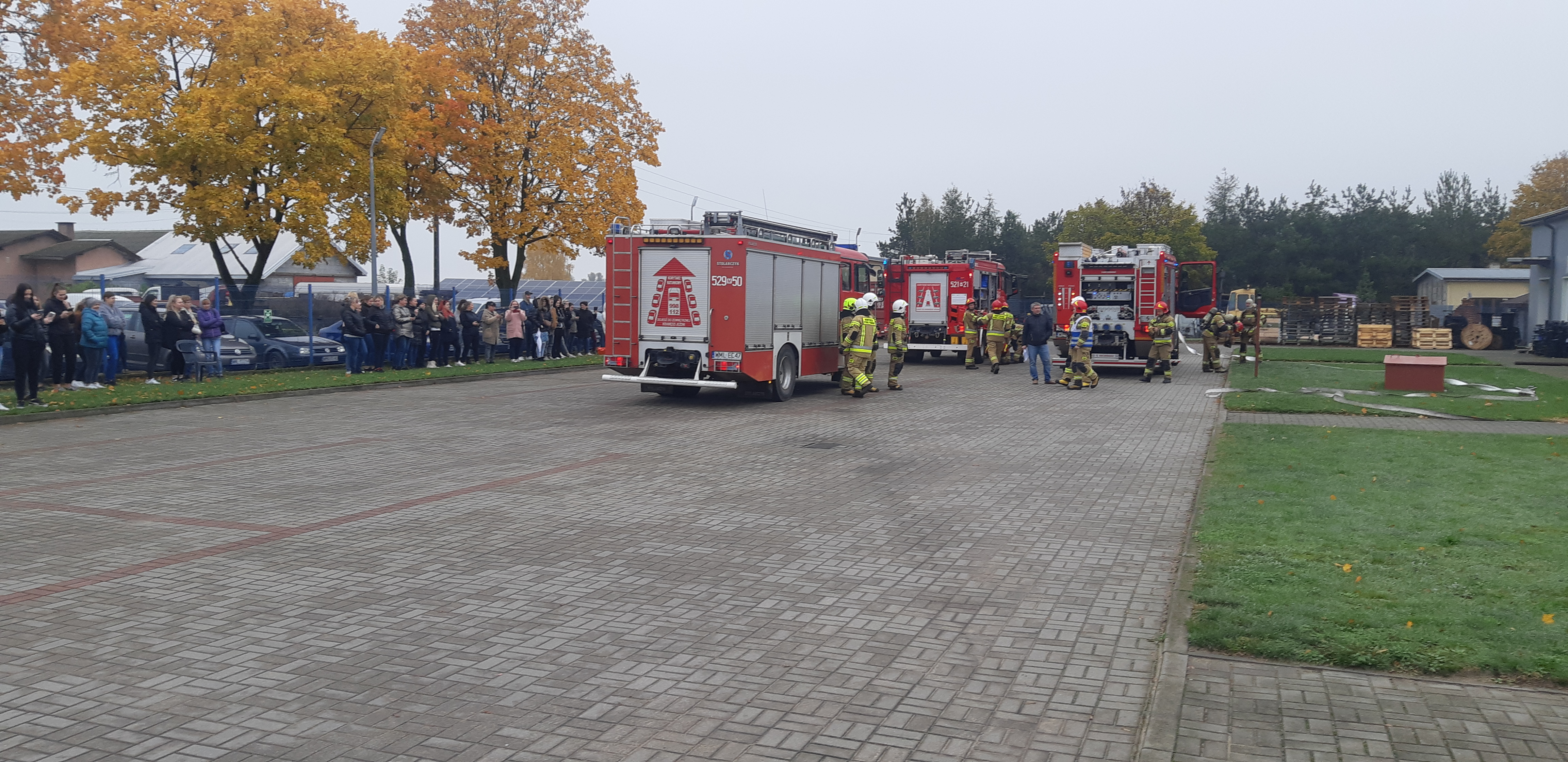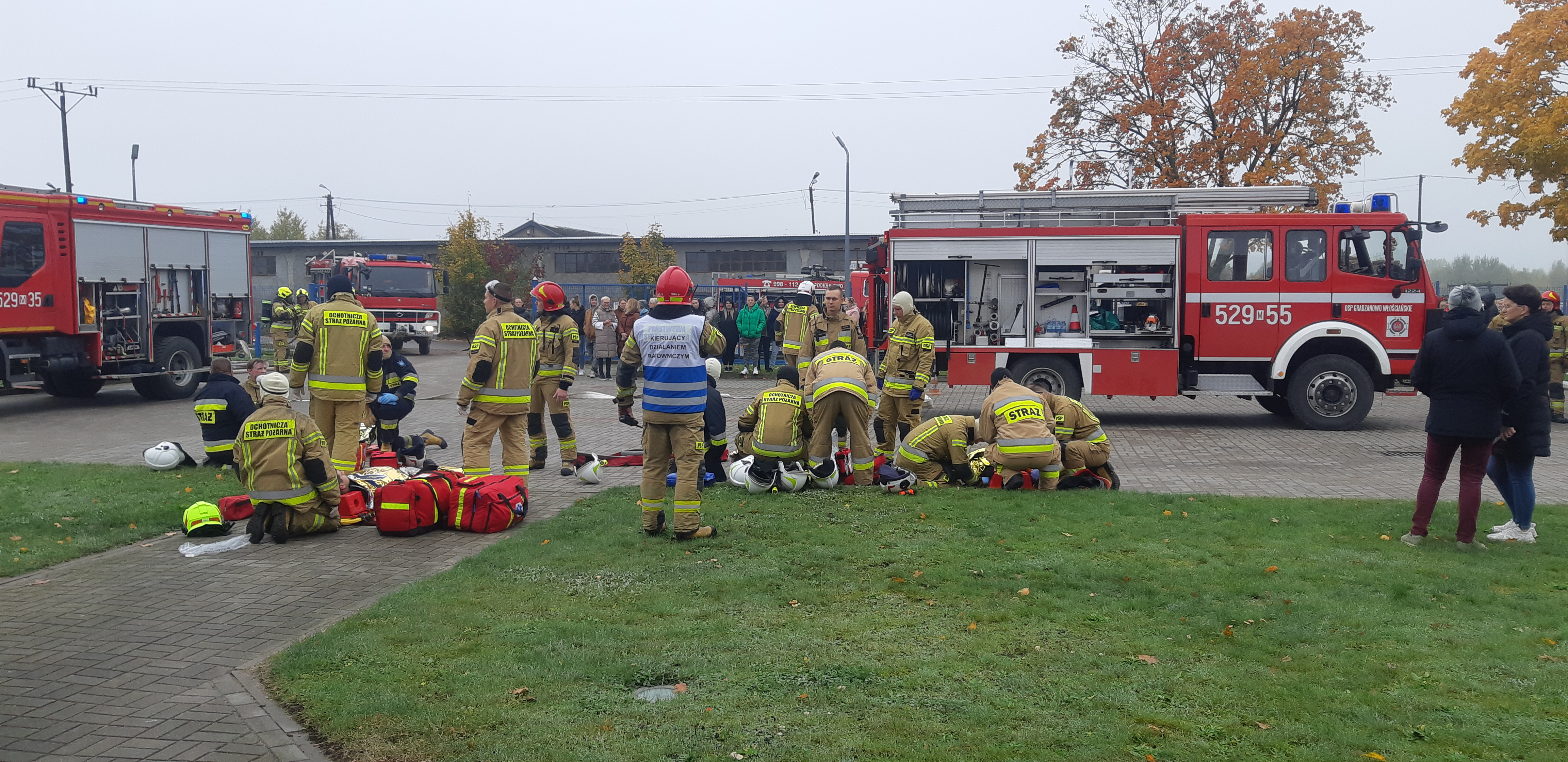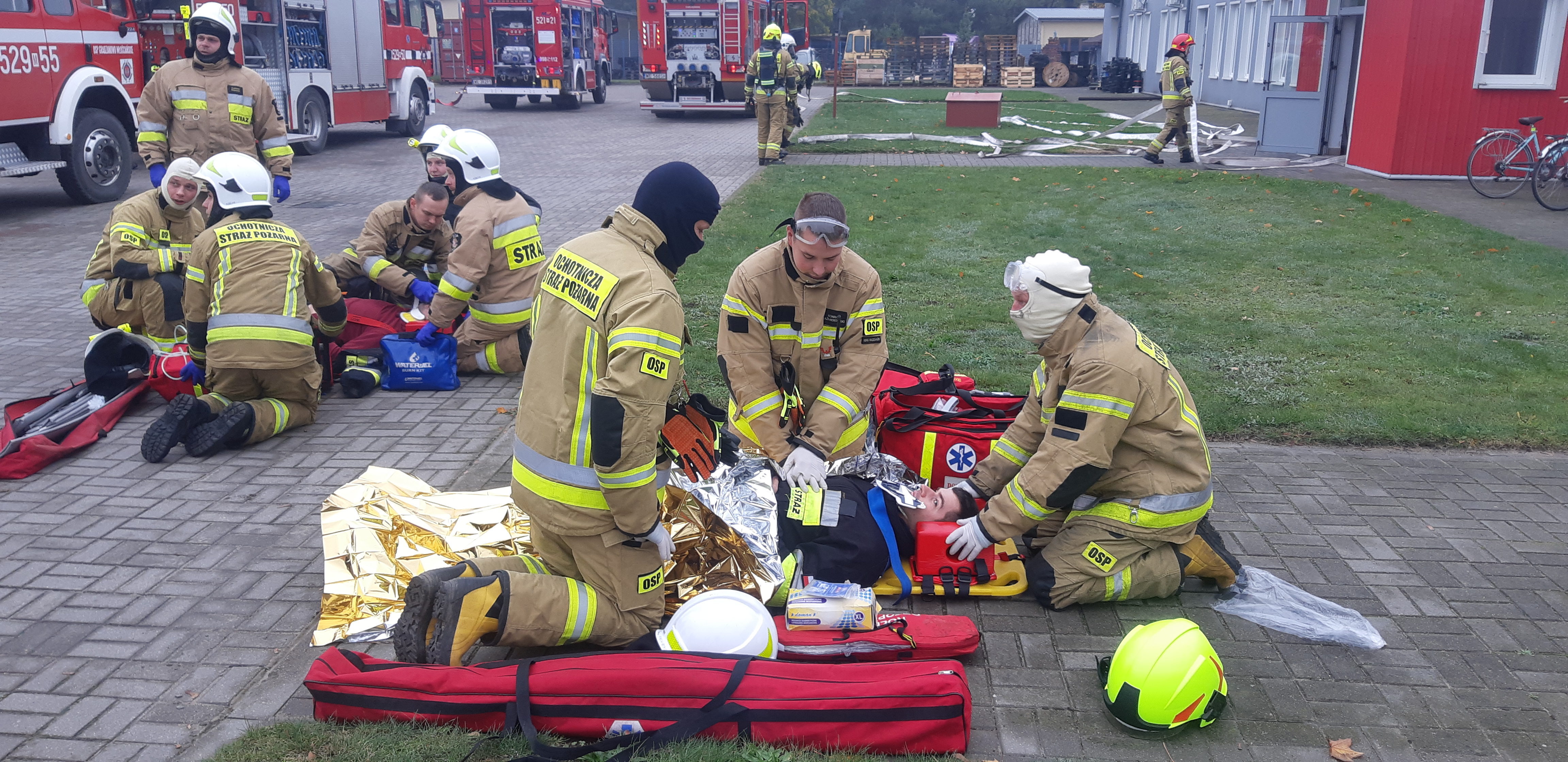 Następnie uczestnicy szkolenia w pełnym umundurowaniu i zabezpieczeniu osobistym zajęli miejsca w samochodach strażackich oczekując na dysponowanie do działań ratowniczo-gaśniczych. Scenariusz zakładał pożar i towarzyszące jemu silne zadymienie w hali produkcyjnej. Przed przybyciem na miejsce zdarzenia pierwszych jednostek ochrony przeciwpożarowej kierownictwo zakładu przeprowadziło ewakuację personelu z obiektu objętego pożarem, jednocześnie stwierdzając brak 4 pracowników.
