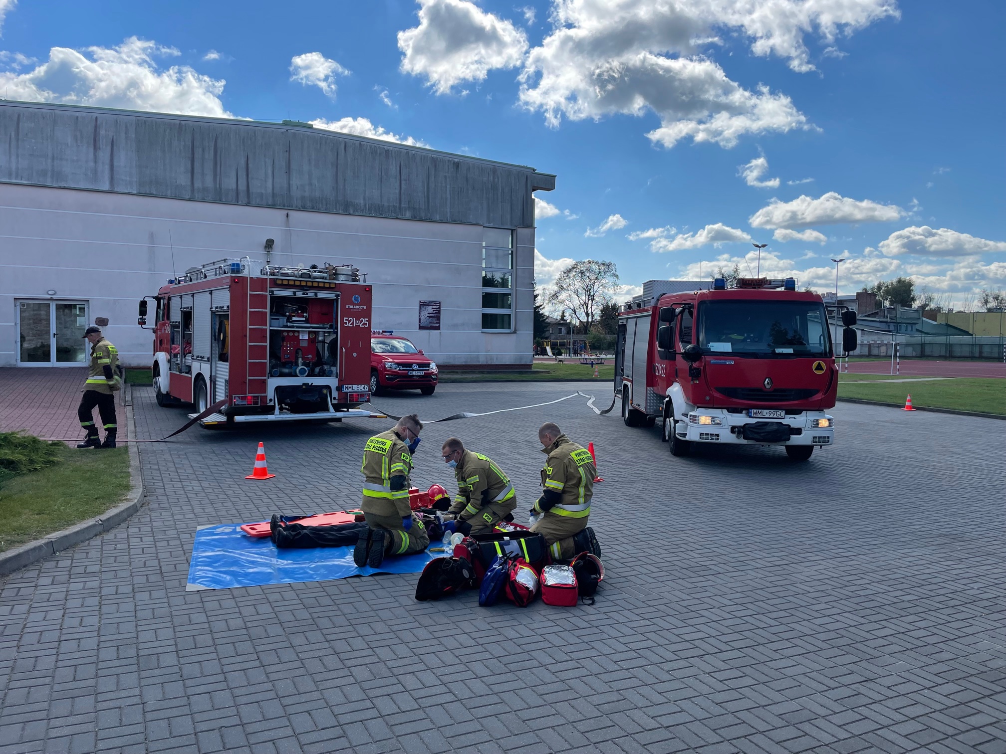 Scenariusz ćwiczeń zakładał pożar w kotłowni. Jedna osoba – konserwator kotłowni - uległa poparzeniu oraz zatruciu gazami pożarowymi. Dodatkowo przeprowadzono ewakuację personelu szkoły.