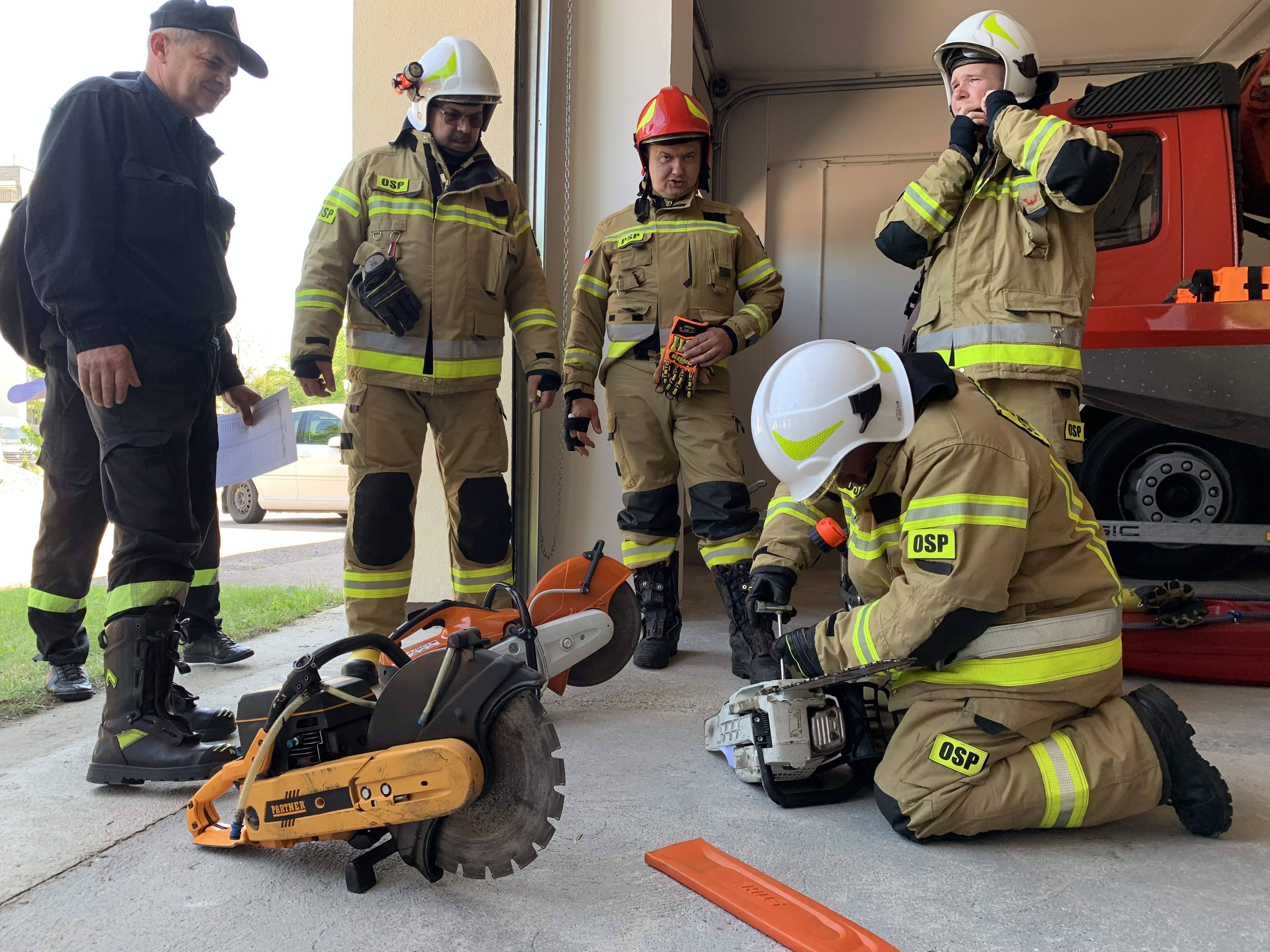 Już od godziny 9.00, w niedzielę 12 czerwca 2022 r. uczestnicy „Szkolenia kierowcy-konserwatora sprzętu ratowniczego ochotniczych straży pożarnych” przystąpili do egzaminu końcowego. Sprawdzian, w którym druhny i druhowie musieli wykazać się dużą wiedzą i umiejętnościami został podzielony na dwie części. Część teoretyczna odbyła się w formie pisemnej w sali szkoleniowo-sztabowej mławskiej komendy, natomiast część praktyczna na placu manewrowym gdzie znajdowały się 3 stanowiska egzaminacyjne, a pośród nich stanowisko autopomp i motopomp, stanowisko obsługi i konserwacji hydraulicznych i pneumatycznych zestawów ratowniczych oraz stanowisko obsługi i eksploatacji sprzętu mechanicznego, jak np. piły spalinowe do betonu i stali czy pilarki spalinowe do drewna.