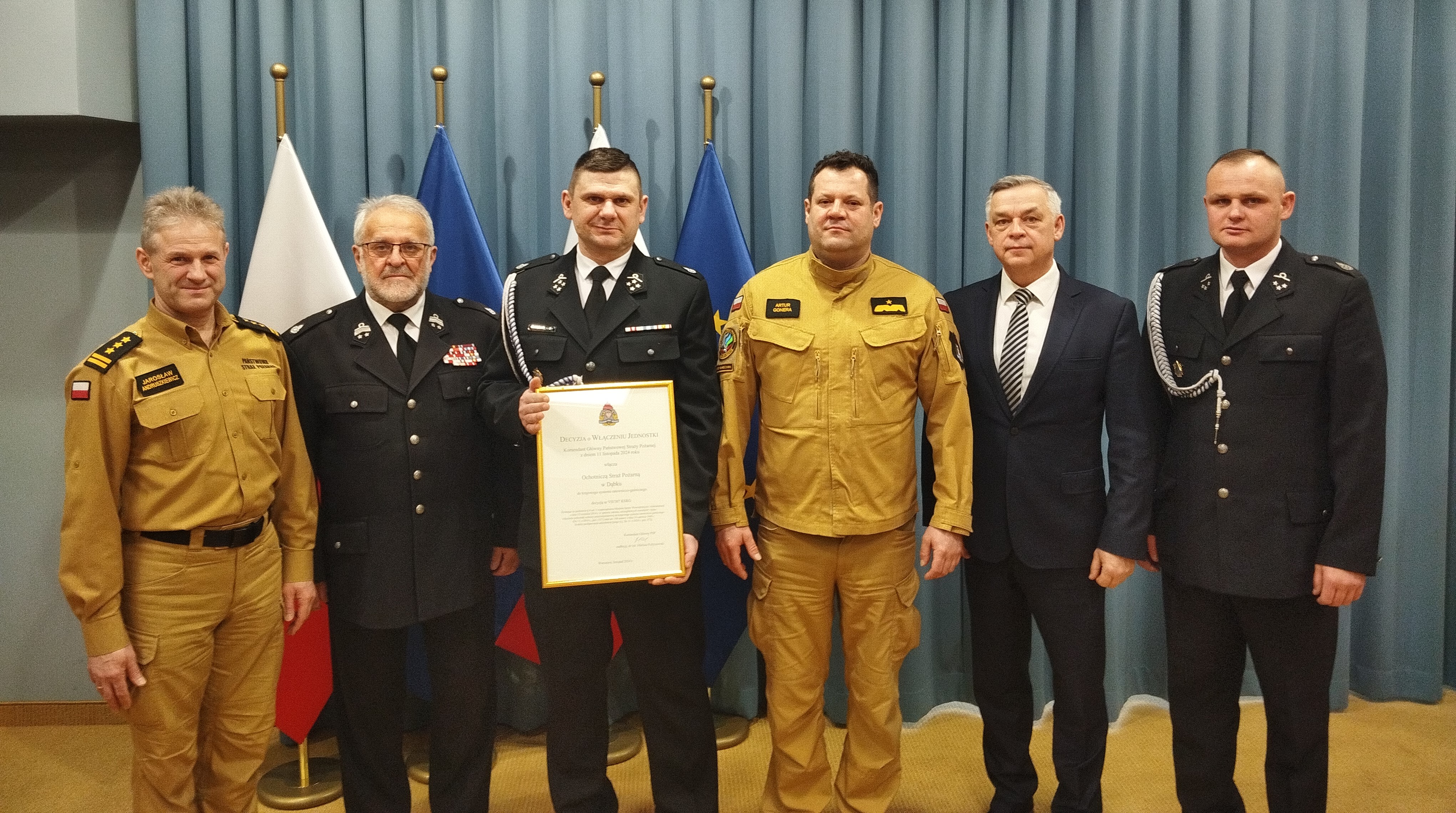W dniu 9 grudnia 2024 roku w siedzibie Komendy Wojewódzkiej Państwowej Straży Pożarnej w Warszawie odbyła się uroczystość związana z wręczeniem decyzji o włączeniu nowych jednostek Ochotniczych Straży Pożarnej w struktury Krajowego Systemu Ratowniczo-Gaśniczego. Z terenu powiatu mławskiego do systemu została właczono jednostka OSP Dąbek. Nadbryg. Artur Gonera, Mazowiecki Komendant Wojewódzki PSP, oraz druh Antoni Jan Tarczyński, Prezes Zarządu Oddziału Wojewódzkiego Związku Ochotniczych Straży Pożarnych województwa mazowieckiego, wręczyli decyzje o przystąpieniu jednostki do systemu.