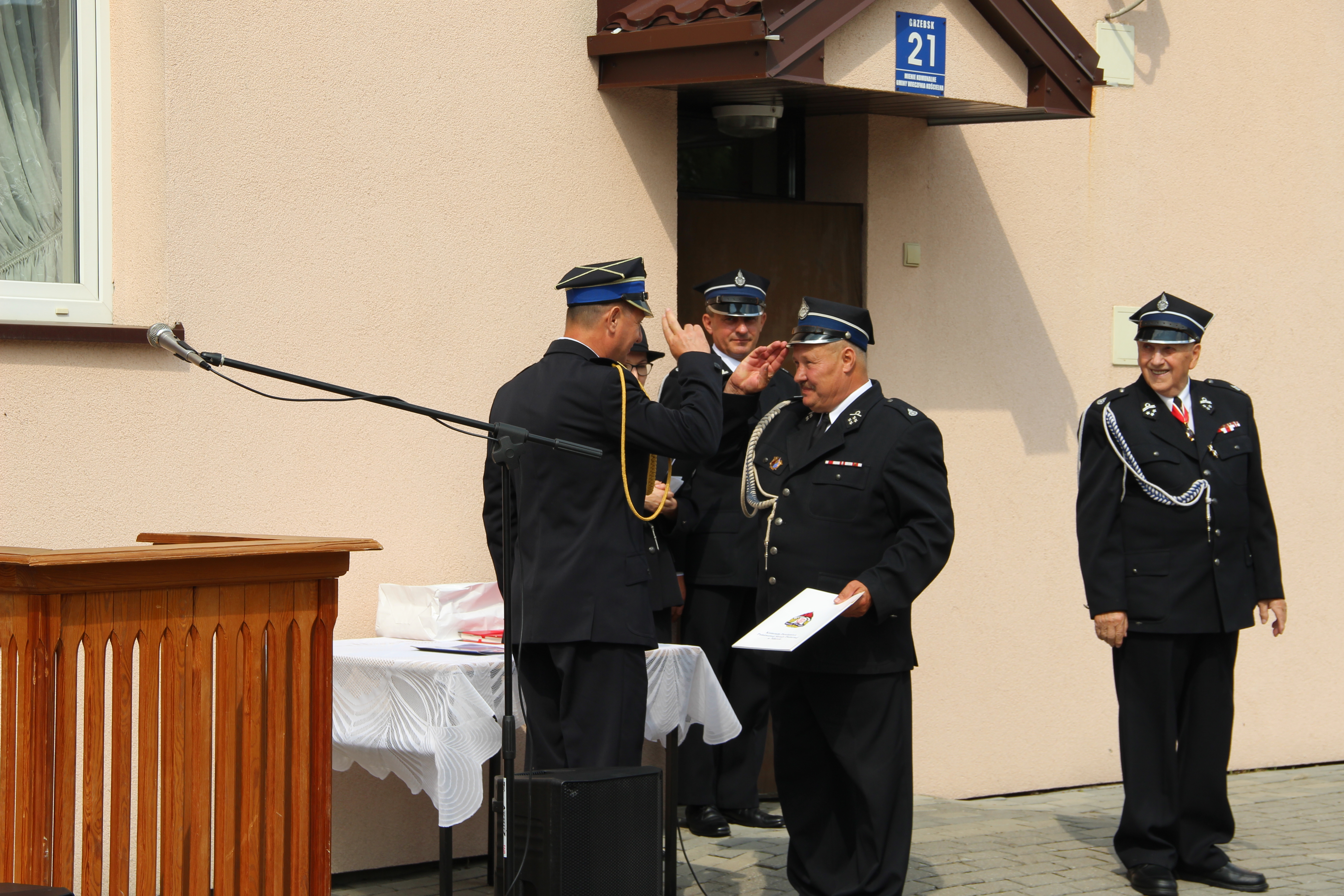 po czym przedstawił rys historyczny Ochotniczej Straży Pożarnej w Grzebsku. Następnie udekorowany został sztandar jednostki OSP Złotym Znakiem Związku. Jest to najważniejsze oznaczenie Związku OSP RP.