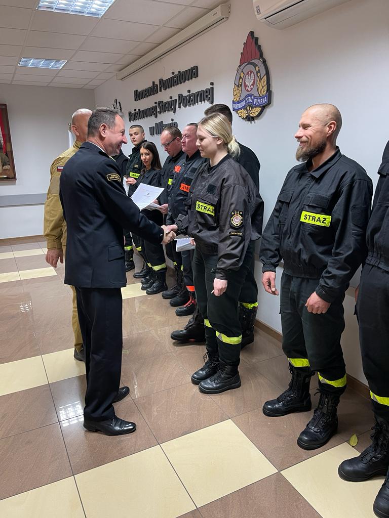Komendant Powiatowy Państwowej Straży Pożarnej w Mławie - bryg. Mirosław Wójcik osobiście pogratulował i wręczył druhnom i druhom zaświadczenia potwierdzające ukończenie szkolenia podstawowego strażaka-ratownika OSP. Potwierdzenie ukończenia szkolenia, obok ubezpieczenia oraz badań lekarskich jest podstawowym elementem dopuszczającym druha do bezpośredniego udziału w działaniach ratowniczo-gaśniczych. Po niedzielnym egzaminie szeregi ochotniczych straży pożarnych wzmocniły się o 40 nowych strażaków-ratowników OSP.