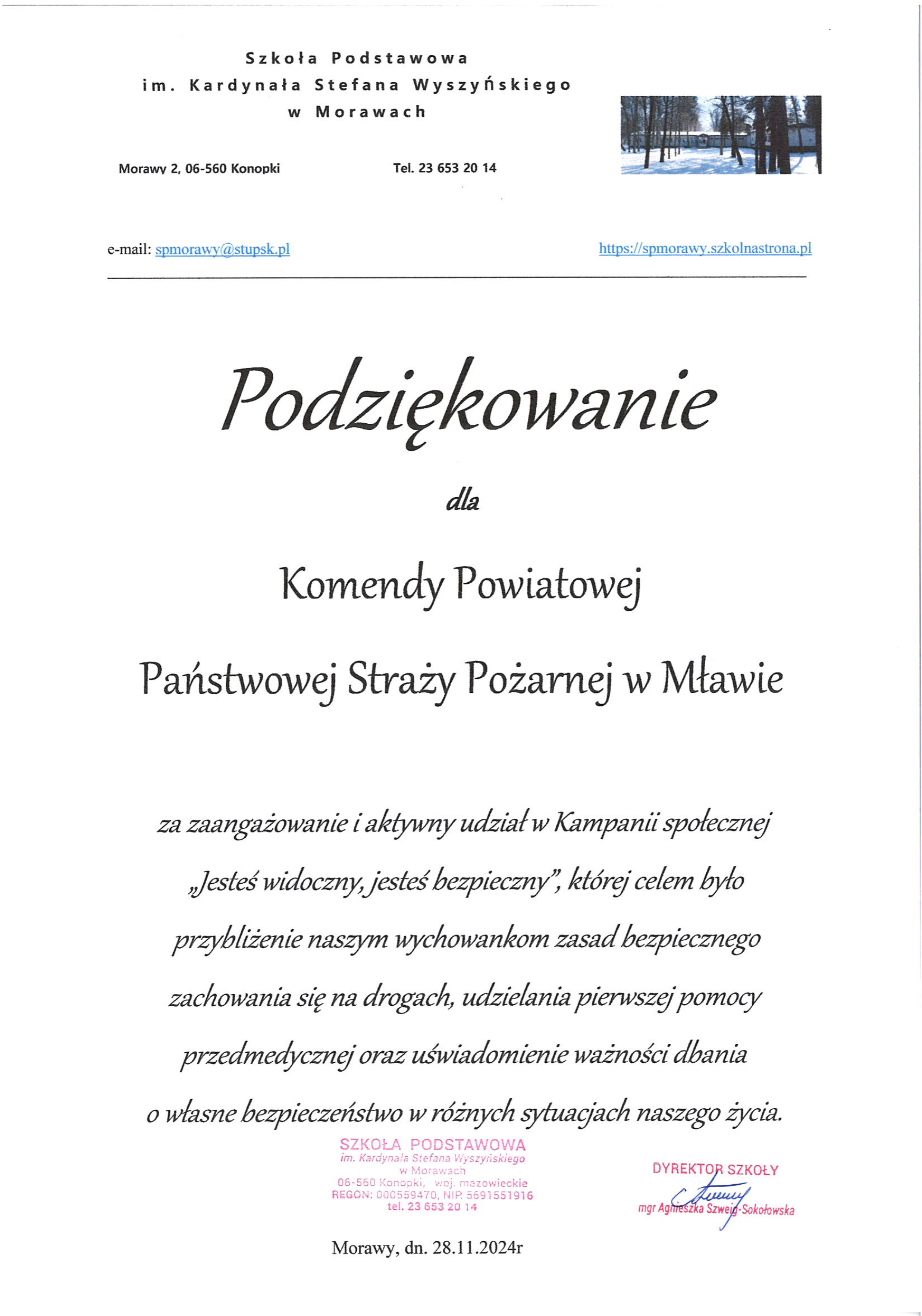 W czwartek 28 listopada 2024 r. zakończyła się kampania społeczna „Jesteś widoczny, jesteś bezpieczny” w powiecie mławskim. Spotkania, które odbyły się w szkołach podstawowych w Dębsku, Szydłowie i Morawach, miały na celu promowanie bezpieczeństwa w przestrzeni publicznej. W jednym z wydarzeń wziął udział Komendant Powiatowy PSP w Mławie, st. bryg. Jarosław Andruszkiewicz.