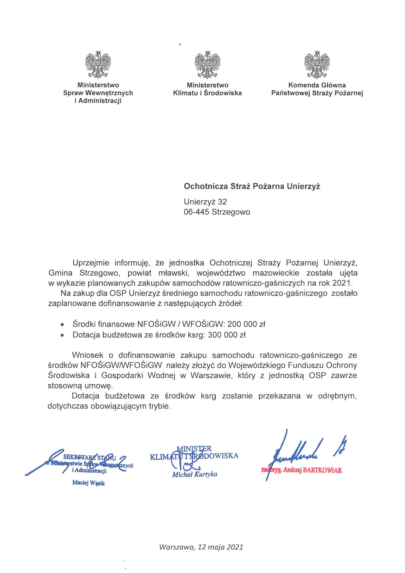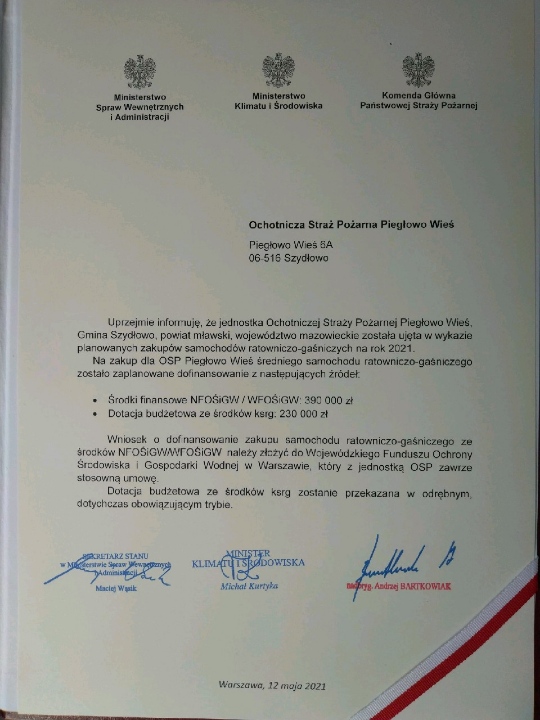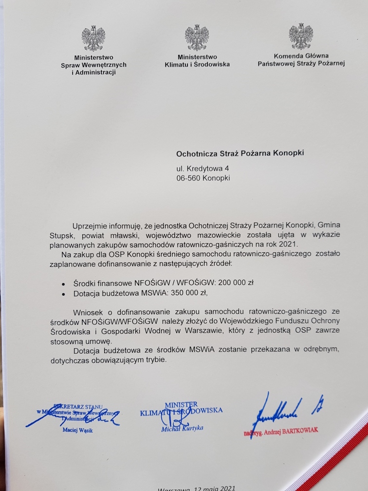 Zakup nowych samochodów ratowniczo-gaśniczych zrealizowany zostanie dzięki zaangażowaniu Ministra Spraw Wewnętrznych i Administracji Pana Mariusza Kamińskiego, Wiceministra Spraw Wewnętrznych i Administracji Pana Macieja Wąsik, Komendanta Głównego PSP nadbryg. Andrzeja Bartkowiaka oraz Mazowieckiego Komendanta Wojewódzkiego PSP nadbryg. Jarosława Nowosielskiego.