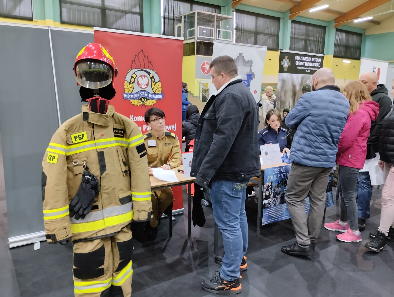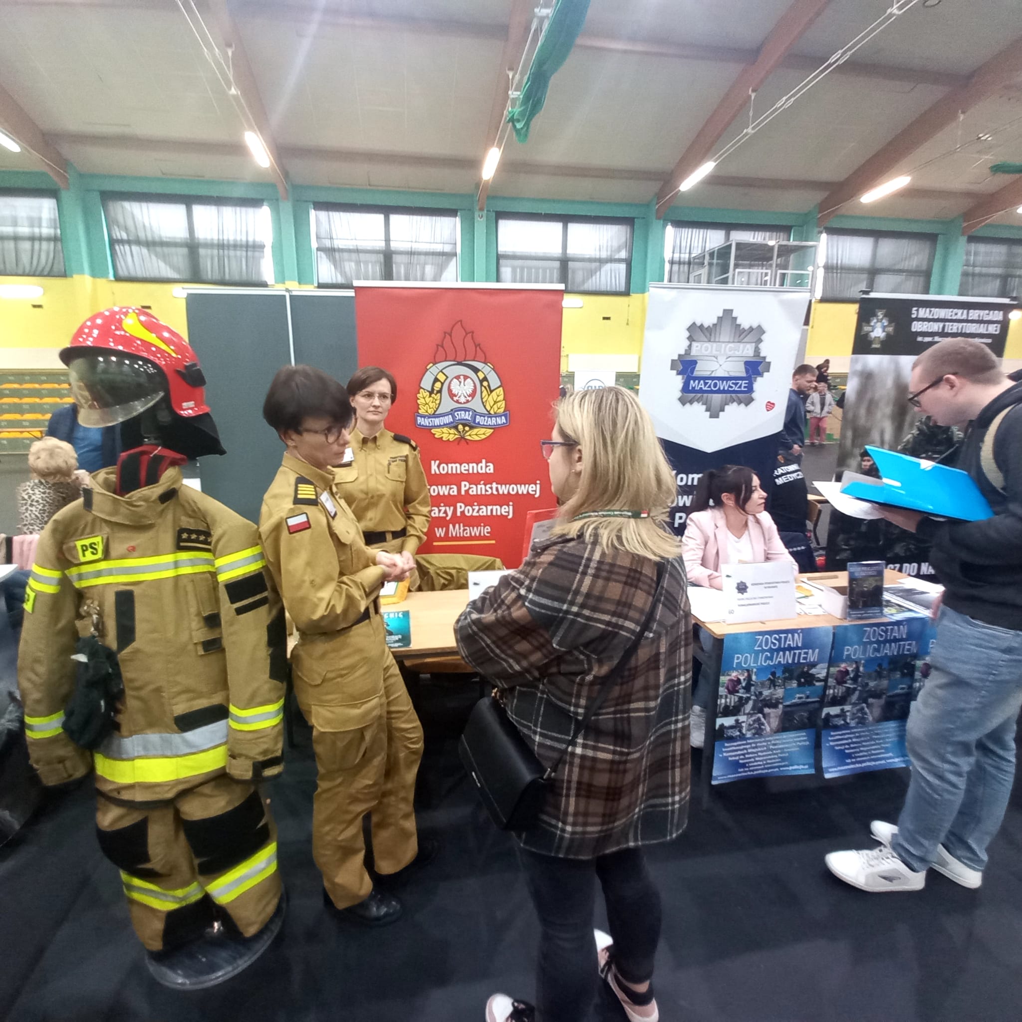 W czwartek, 4 kwietnia 2024 roku w Mławskiej Hali Sportowej odbyły się XI Powiatowe Targi Pracy. Swoje stanowisko promocyjne, obok innych służb mundurowych, takich jak Policja i Wojsko Polskie, miała także Komenda Powiatowa Państwowej Straży Pożarnej w Mławie. Funkcjonariusze przekazywali zainteresowanym informacje na temat możliwości podjęcia służby oraz określali wymagania, jakie musi spełnić potencjalny kandydat na strażaka PSP. Oprócz promocji Państwowej Straży Pożarnej funkcjonariusze uczestniczący w targach pracy informowali odwiedzających stoisko o zagrożeniach wynikających z wypalania traw, niebezpieczeństwie, które niesie ze sobą tlenek węgla oraz właściwym zachowaniu się w przypadku niebezpieczeństwa. Targi Pracy zorganizowane przez Powiatowy Urząd Pracy w Mławie były doskonałą okazją do zaprezentowania specyfiki służby w PSP.