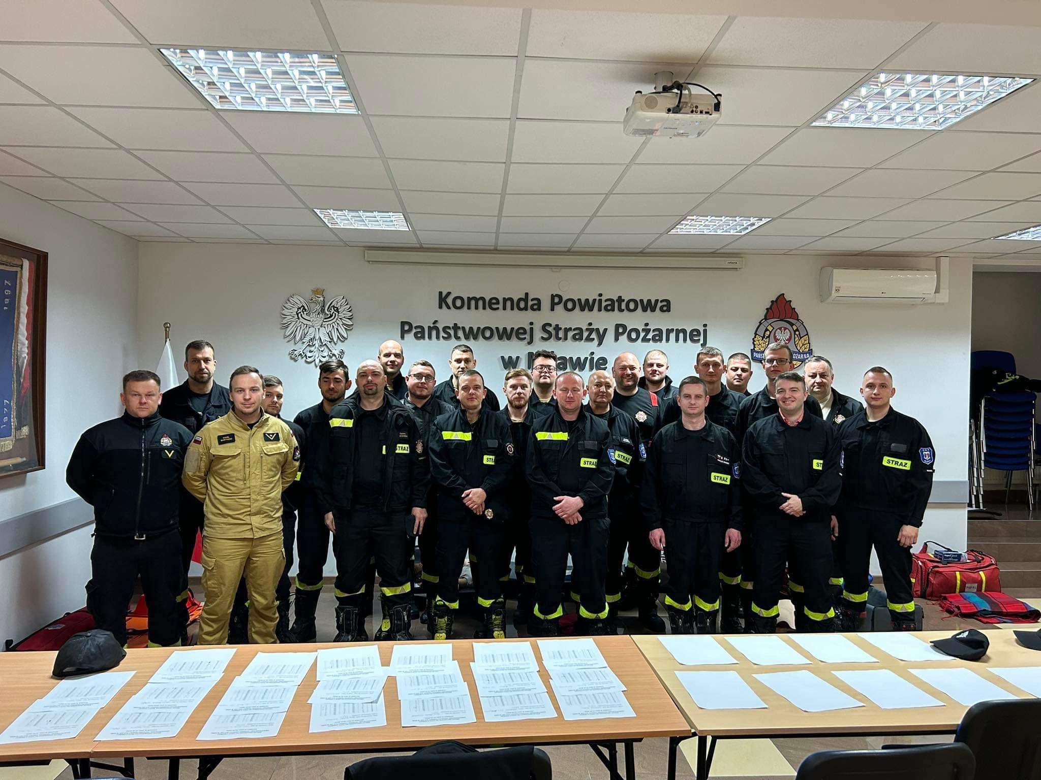 20 kwietnia 2024 r. w Komendzie Powiatowej Państwowej Straży Pożarnej w Mławie odbył się egzamin recertyfikacyjny kwalifikowanej pierwszej pomocy. Do egzaminu, który podzielony był na część teoretyczną oraz praktyczną przystąpiło 20 druhów z jednostek Ochotniczych Straży Pożarnych z terenu powiatu mławskiego. Wszyscy druhowie pozytywnie zdali egzamin. Podczas realnych działań, życzymy podejmowania samych prawidłowych decyzji.