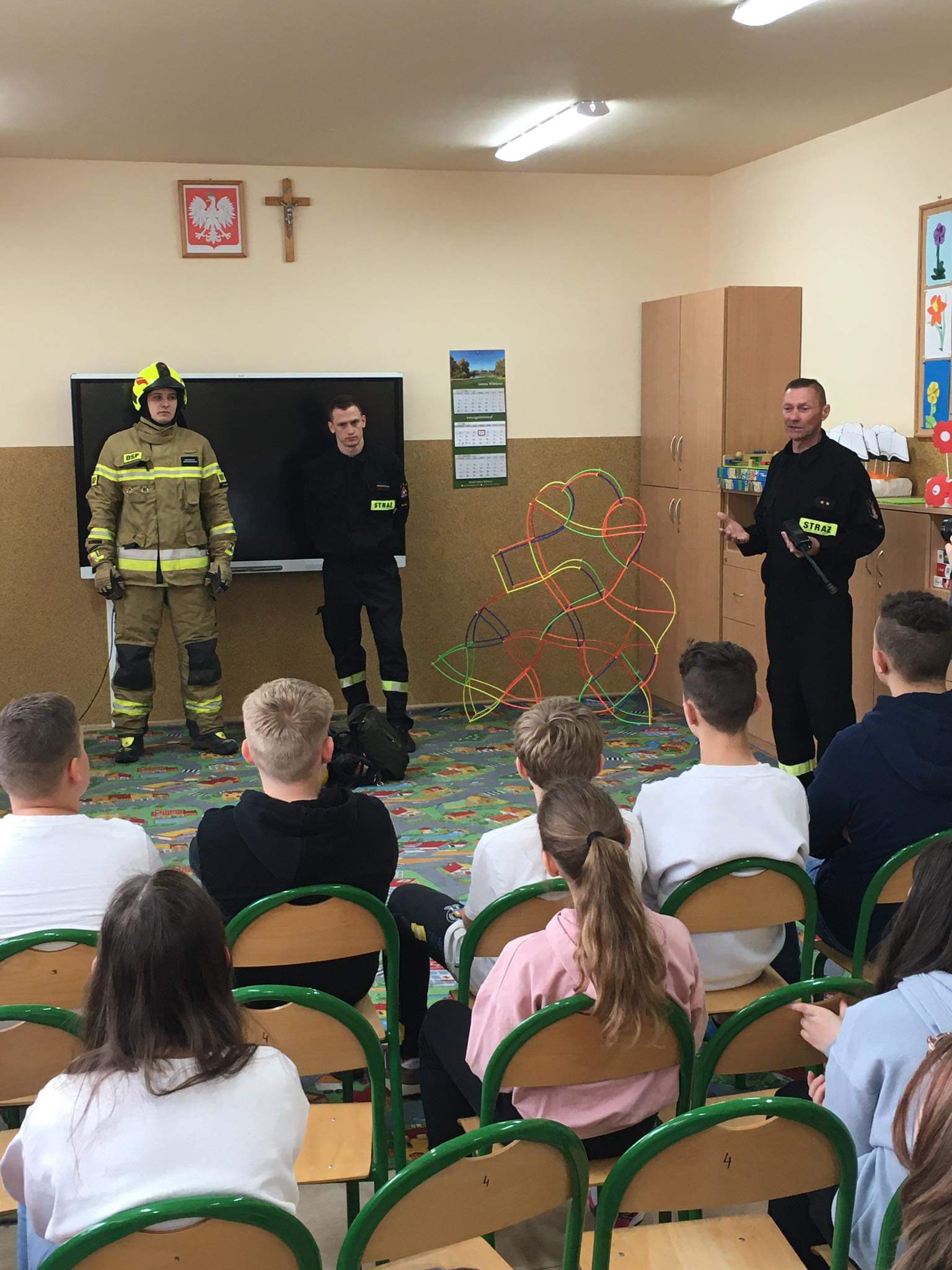 Na spotkaniu przybliżono zawód strażaka, zasady bezpieczeństwa pożarowego w szkole i w domu. Zaprezentowano także sprzęt ratowniczy będący na wyposażeniu jednostki OSP Kowalewo. Ciekawa tematyka rozmowy zachęciła dzieci i uczniów do dyskusji i dzielenia się własną wiedzą oraz spostrzeżeniami na temat ochrony przeciwpożarowej. Ponadto strażacy zorganizowali pożarniczy tor przeszkód dla uczestników spotkania.