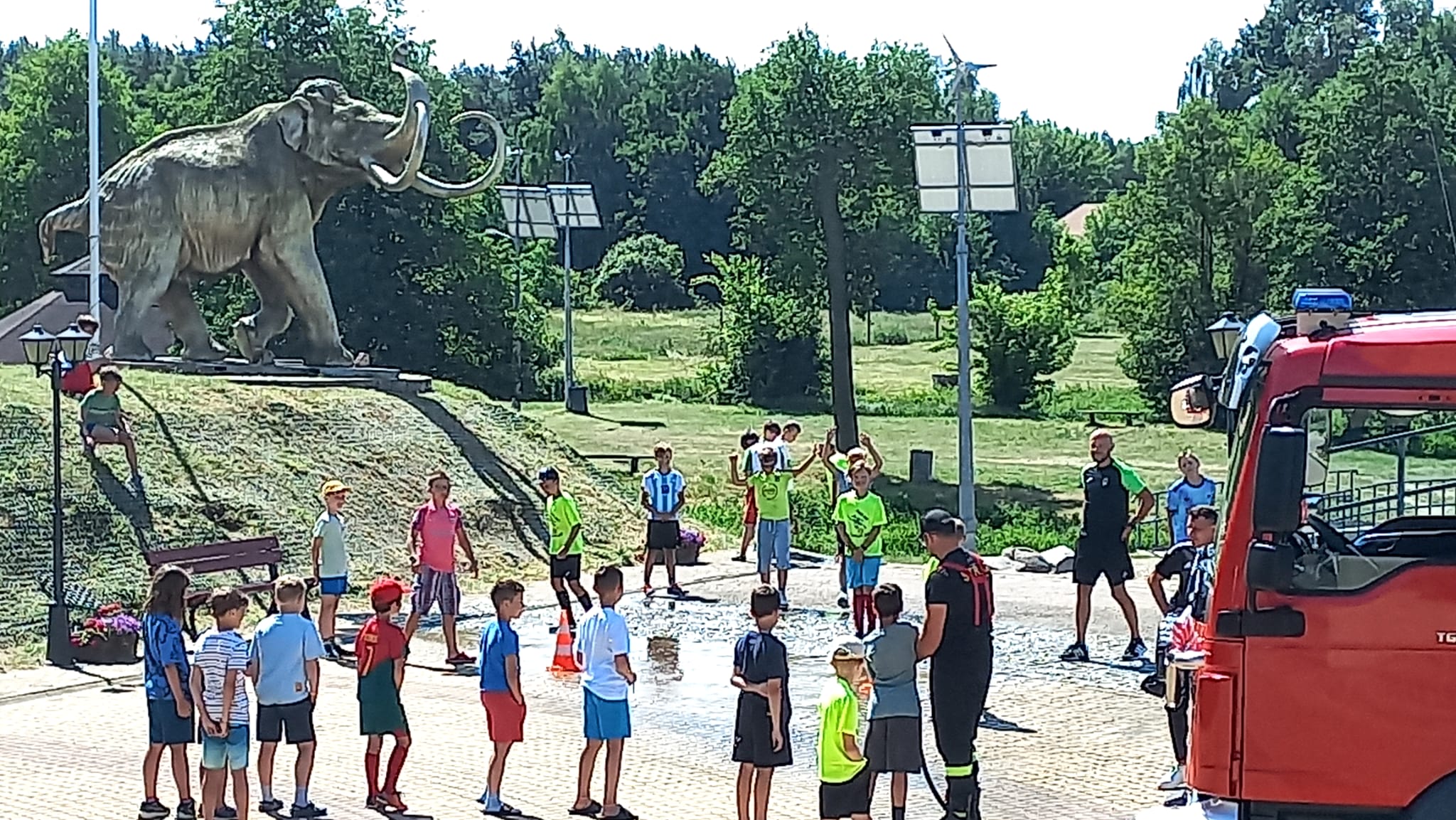 04 lipca 2025 r. mł. kpt. Marek Brodziński spotkał się z młodymi zawodnikami UKS Akademia Młodego Sportowca, którzy uczestniczyli w obozie sportowym w Akademii Aktywnego Wypoczynku Mamut Camp w Strzegowie.