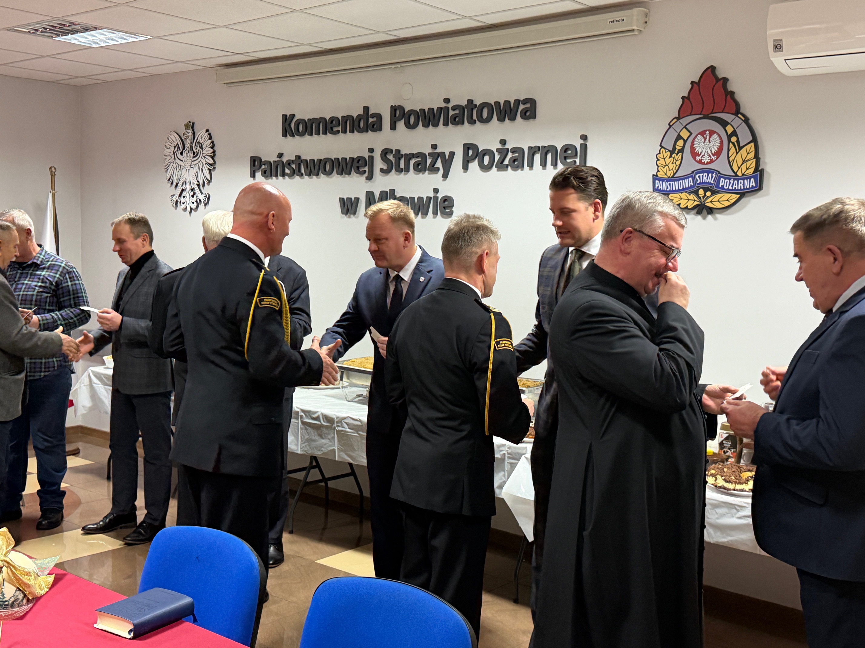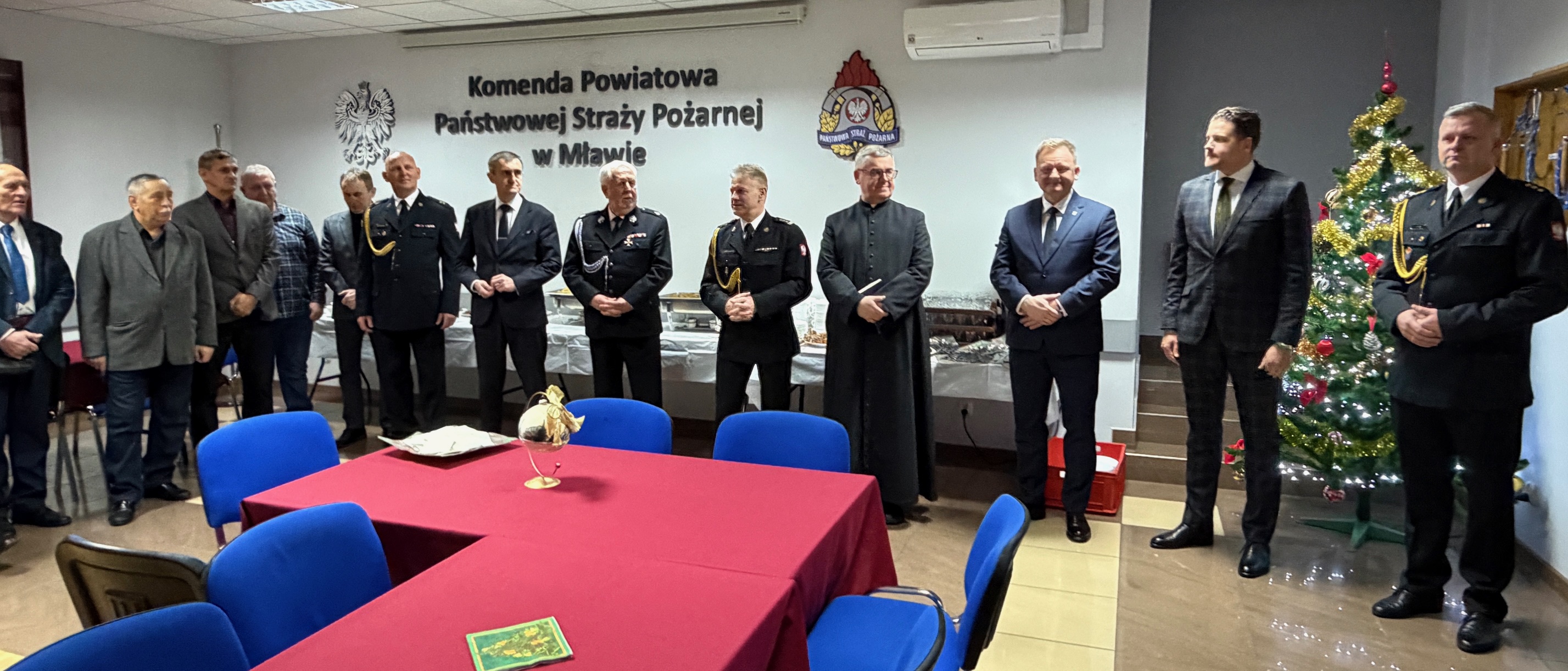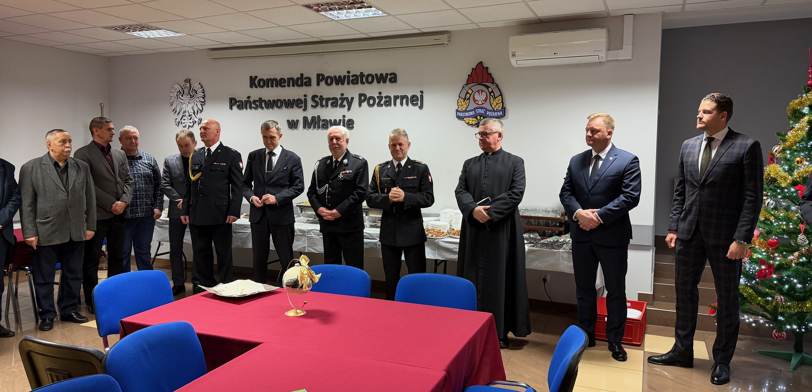 19 grudnia 2025 roku w Komendzie Powiatowej Państwowej Straży Pożarnej w Mławie odbyło się spotkanie wigilijne funkcjonariuszy oraz pracowników cywilnych. W uroczystości uczestniczyli zaproszeni goście, wśród nich emerytowani strażacy, przedstawiciele władz samorządowych oraz proboszcz parafii św. Stanisława BM w Mławie, ks. kan. Sławomir Krasiński.