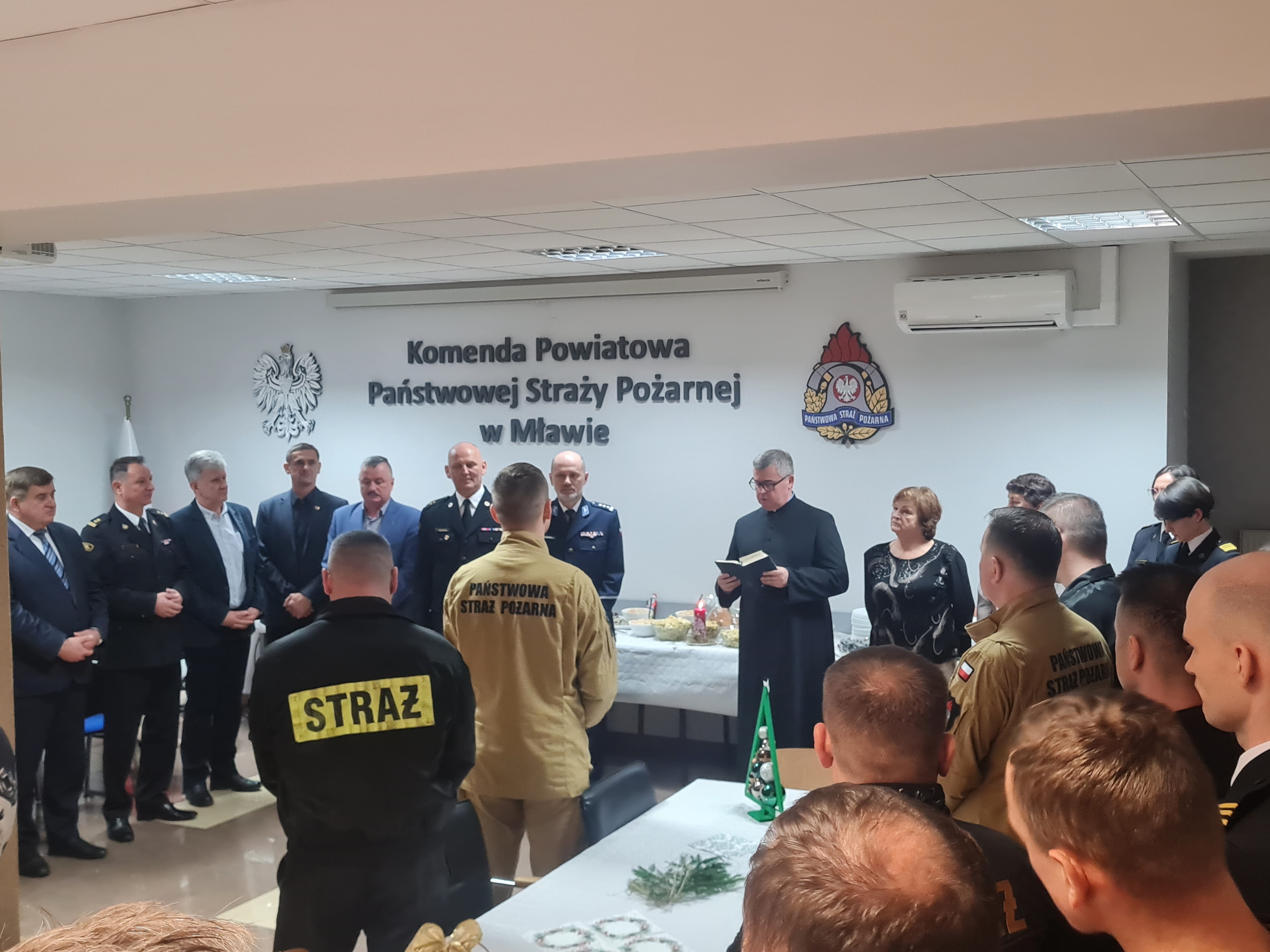 W czwartek, 19 grudnia 2024 roku, odbyło się spotkanie wigilijne funkcjonariuszy i pracowników cywilnych Komendy Powiatowej Państwowej Straży Pożarnej w Mławie. W uroczystości wzięli udział zaproszeni goście, w tym emerytowani strażacy, przedstawiciele władz samorządowych oraz Proboszcz parafii św. Stanisława BM w Mławie, ks. kan. Sławomir Krasiński.