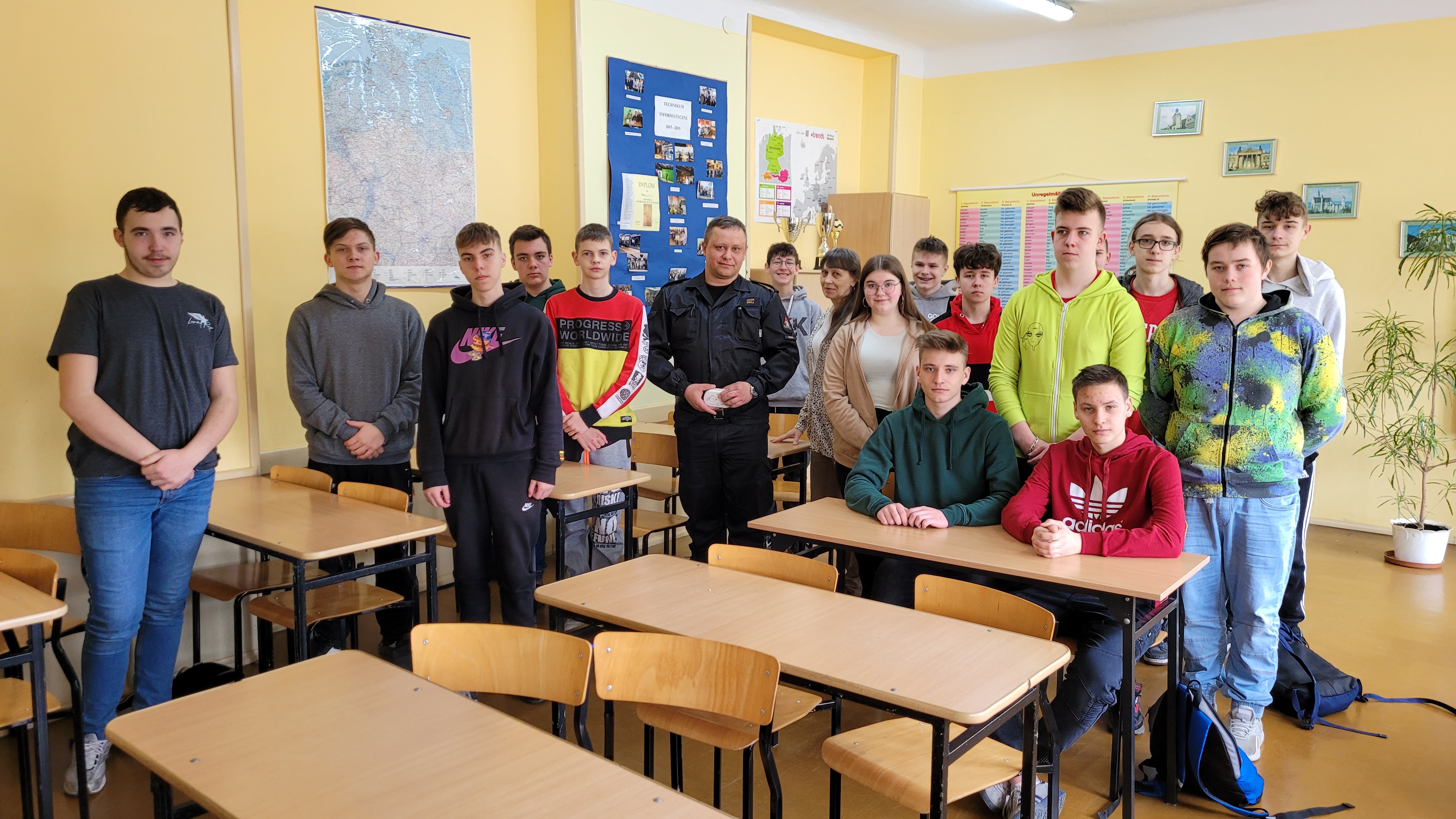 Prewencja przeciwpożarowa oraz przybliżenie zawodu strażaka były tematem spotkania młodzieży z Zespołu Szkół nr 1 im. Jerzego Ciesielskiego w Mławie ze st. kpt. Jackiem Dryll z Komendy Powiatowej Straży Pożarnej w Mławie.