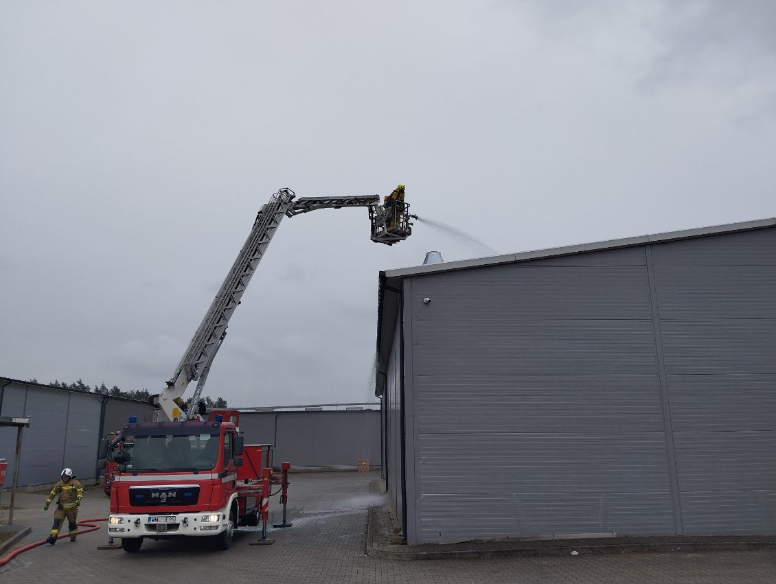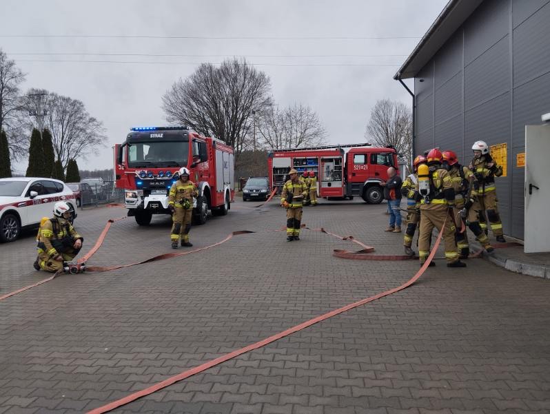 Strażackie ćwiczenia na terenie zakładu produkcyjno- magazynowego.