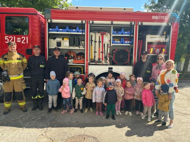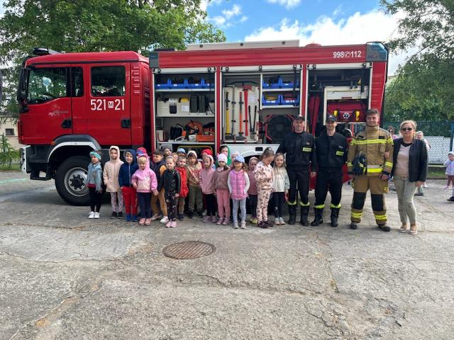 Podczas wizyty strażacy przybliżyli dzieciom zawód strażaka oraz zaprezentowali sprzęt znajdujący się na wyposażeniu samochodu ratowniczo–gaśniczego. Dodatkowo omówiono zasady bezpiecznego zachowania podczas pożaru, burzy czy pobytu nad wodą. Jak zawsze największe zainteresowanie wzbudził wóz bojowy, do którego dzieci mogły wejść. Na zakończenie każda z grup upamiętniła wizytę strażaków na wspólnym zdjęciu.
