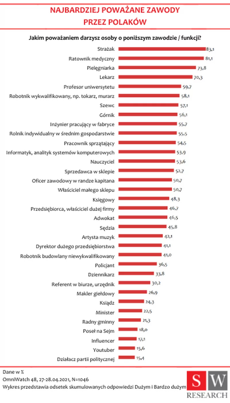 Jak wynika z analizy, najlepiej ocenianym zawodem w Polsce jest strażak (83,1 proc. wskazań), a tuż za nim ratownik medyczny (81,1 proc.). “Zdecydowana większość z nas darzy wysokim poważaniem lekarzy (70 proc.)” – czytamy.