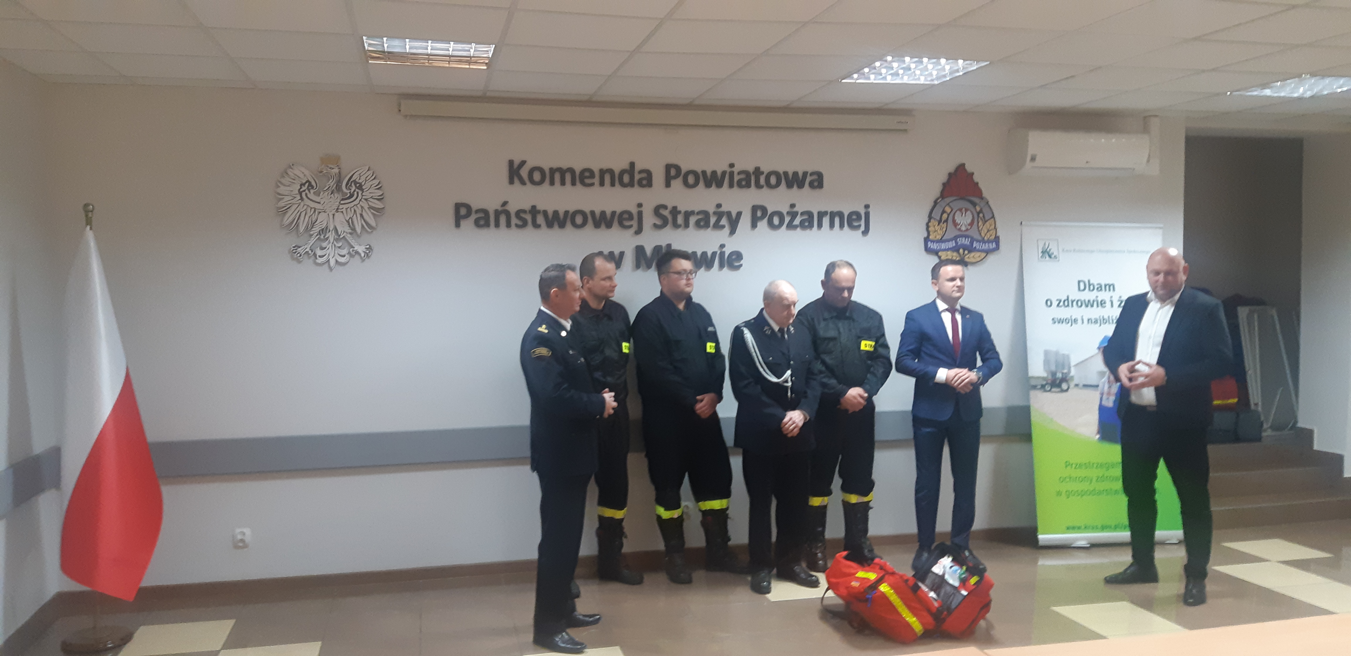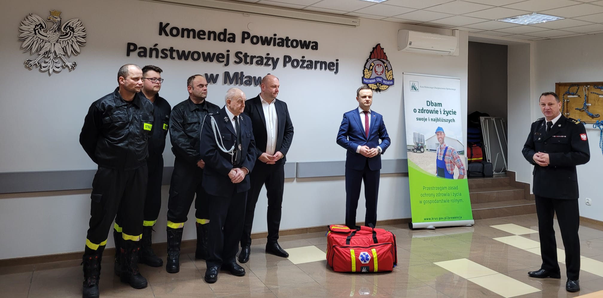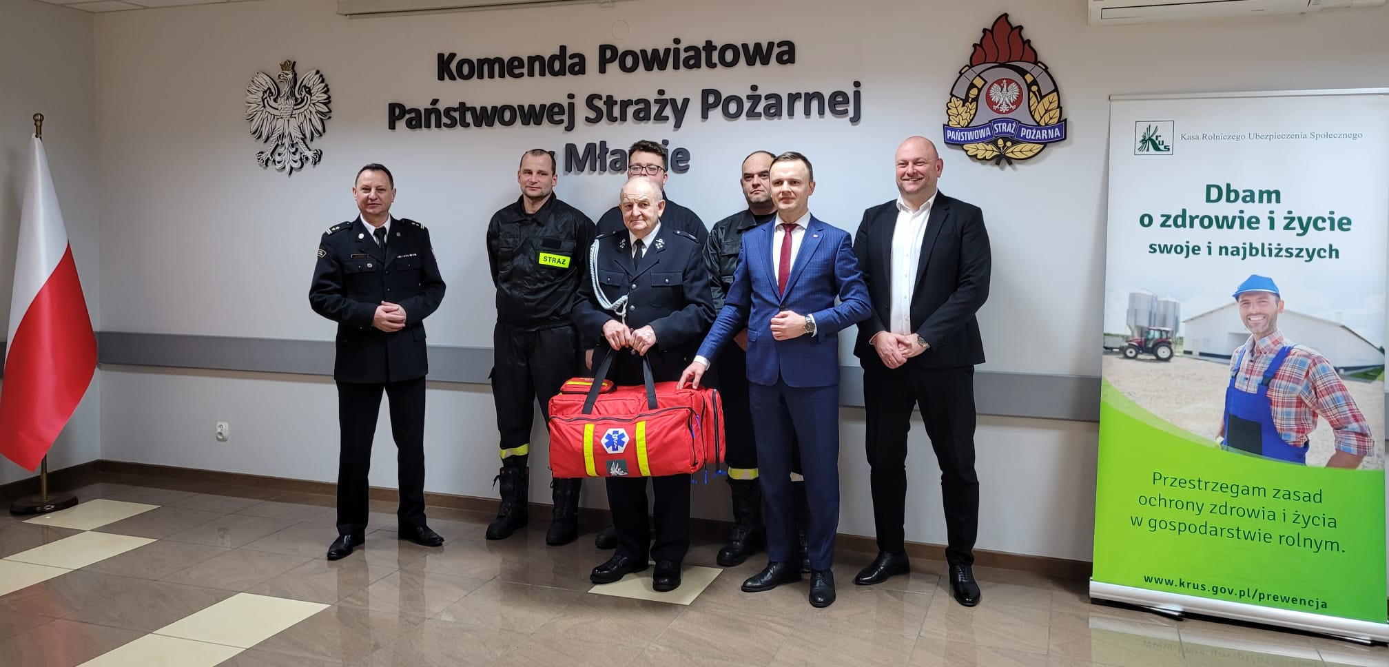 W czwartek 15 grudnia 2022 roku w siedzibie Komendy Powiatowej PSP w Mławie odbyło się spotkanie, w którym uczestniczyli Komendant Powiatowy bryg. Mirosław Wójcik, Pan Michał Pol – kierownik placówki terenowej KRUS w Mławie, Pan Przemysław Pakuszewski – Wójt Gminy Radzanów oraz druhowie z jednostki OSP w Radzanowie. W trakcie spotkania zarówno bryg. Mirosław Wójcik, jak również zaproszeni goście podsumowali dotychczasową współpracę oraz przedstawili plany jej rozwoju w najbliższej przyszłości. Na zakończenie Pan Michał Pol wspólnie z Komendantem Powiatowym PSP w Mławie przekazali druhom z Radzanowa torbę medyczną z pełnym wyposażeniem ufundowaną przez Kasę Rolniczego Ubezpieczenia Społecznego.