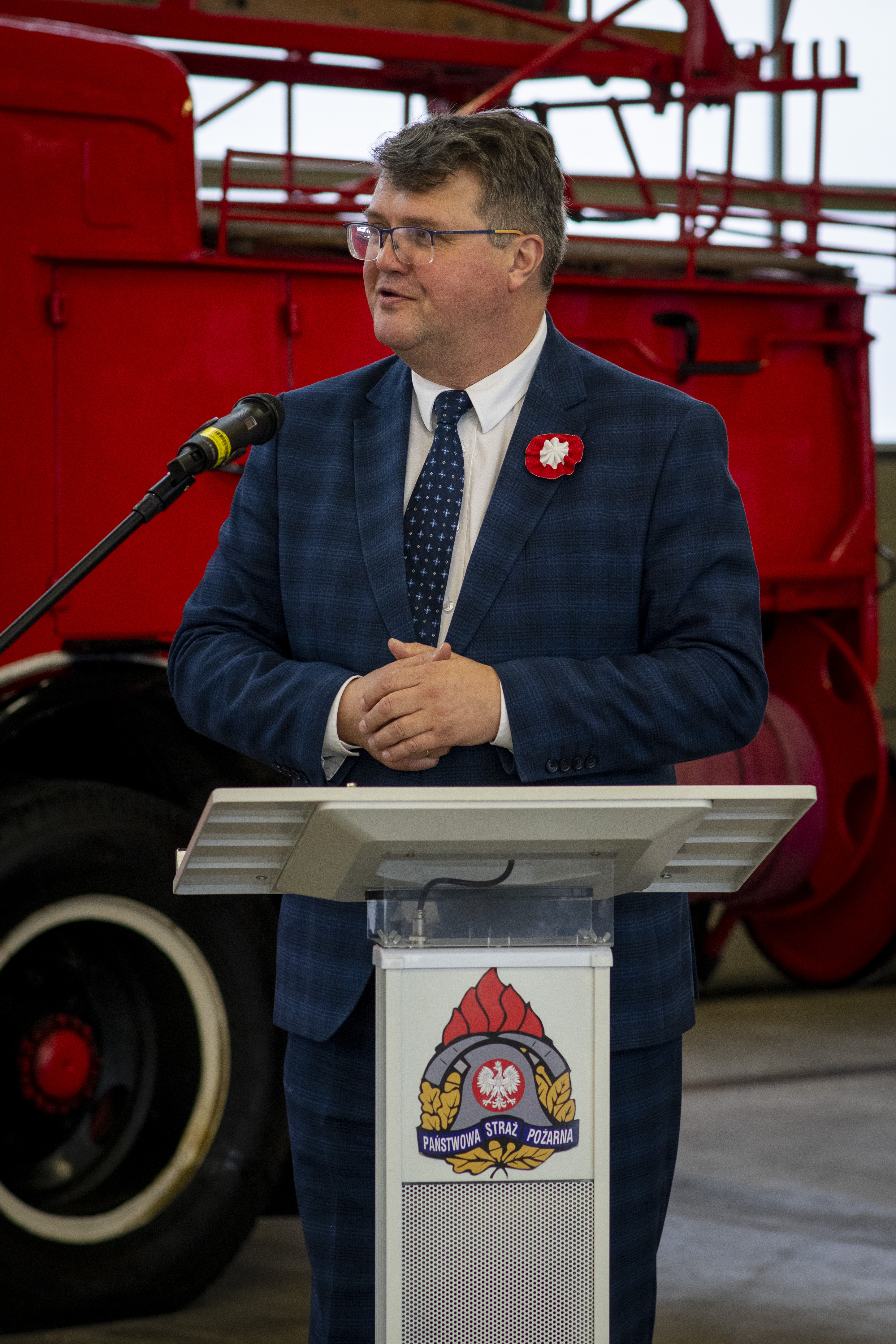 Następnie Mazowiecki Komendant Wojewódzki PSP st. bryg. Jarosław Piotrowski powitał przybyłych gości, strażaków, pracowników cywilnych oraz podczas wystąpienia powiedział: „W tym uroczystym dniu pamiętajmy, że swój udział w procesie odzyskiwania niepodległości mieli również strażacy ogniowi. To oni również dbali o zachowanie tożsamości narodu, języka, kultury i wiary podczas codziennej służby. To dzisiaj niepodległość, wolność pozwala nam stanąć na uroczystej zbiórce i podziękować, wyróżnić za codzienny trud służby. (…) Ten rok i poprzednie lata to okres w którym Polski Strażak wspierał działania związane z pandemią, niósł pomoc ludności ukraińskiej, wspierał ukraińskich strażaków, wspierał działania gaśnicze strażaków w Europy. W tym uroczystym dniu gdy wspólnie celebrujemy Narodowe Święto Niepodległości gratuluję wszystkim awansowanym, wyróżnionym, odznaczonym oraz życzę dalszych wyróżnień. Pragnę również podziękować moim strażakom i pracownikom cywilnym za codzienny trud służby oraz postawę, która daje poczucie bezpieczeństwa mieszkańcom ziemi mazowieckiej. Jestem pewien, że mieszkańcy tej ziemi, ziemi mazowieckie,j są z Was dumni za to co robicie na co dzień w służbie.”