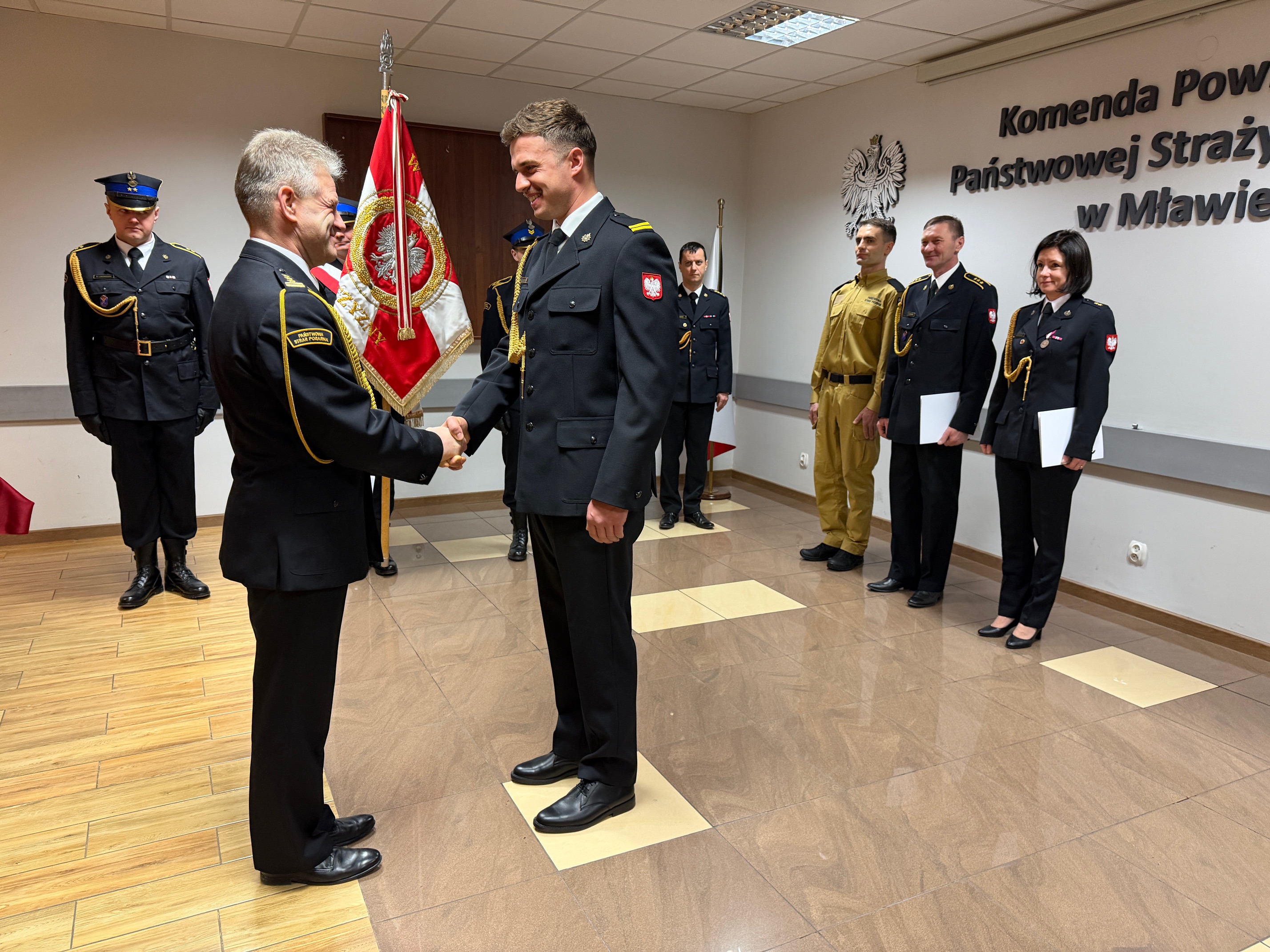 Podczas uroczystej zbiórki Komendant Powiatowy PSP w Mławie wręczył akt mianowania na wyższe stanowisko służbowe mł. kpt. Izabeli Ostrowskiej oraz decyzje o mianowaniu do służby stałej dwóm funkcjonariuszom: st. str. Piotrowi Lubańskiemu i st. str. Mateuszowi Tąporowskiemu. W trakcie zbiórki odczytano również rozkaz personalny Komendanta Głównego PSP dotyczący awansu z dniem 11 listopada 2025 r. st. asp. Dariusza Laskowskiego na stopień aspiranta sztabowego.