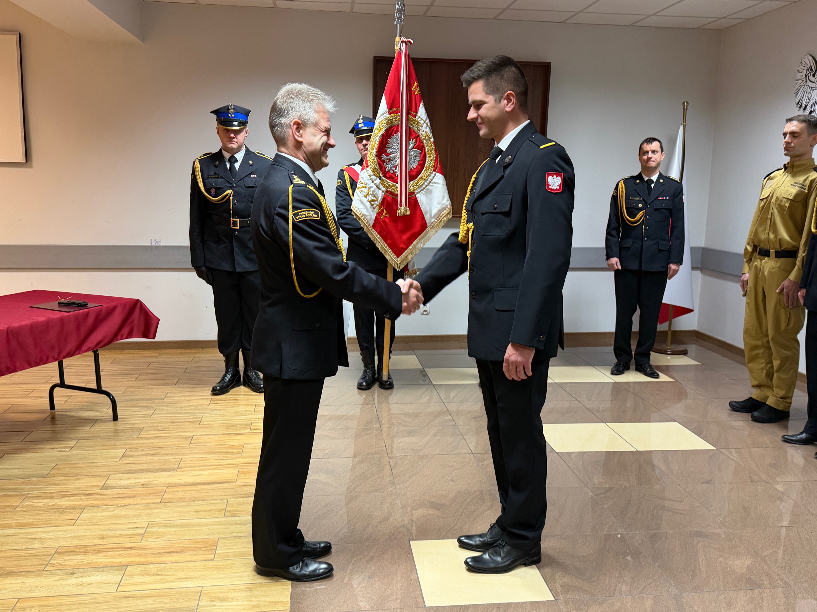 W uroczystości uczestniczył również Zastępca Komendanta Powiatowego PSP w Mławie – kpt. Łukasz Kwitek, który wraz ze st. bryg. Jarosławem Andruszkiewiczem pogratulował nowemu strażakowi wstąpienia w szeregi Państwowej Straży Pożarnej oraz złożył życzenia dalszych sukcesów awansowanym funkcjonariuszom.