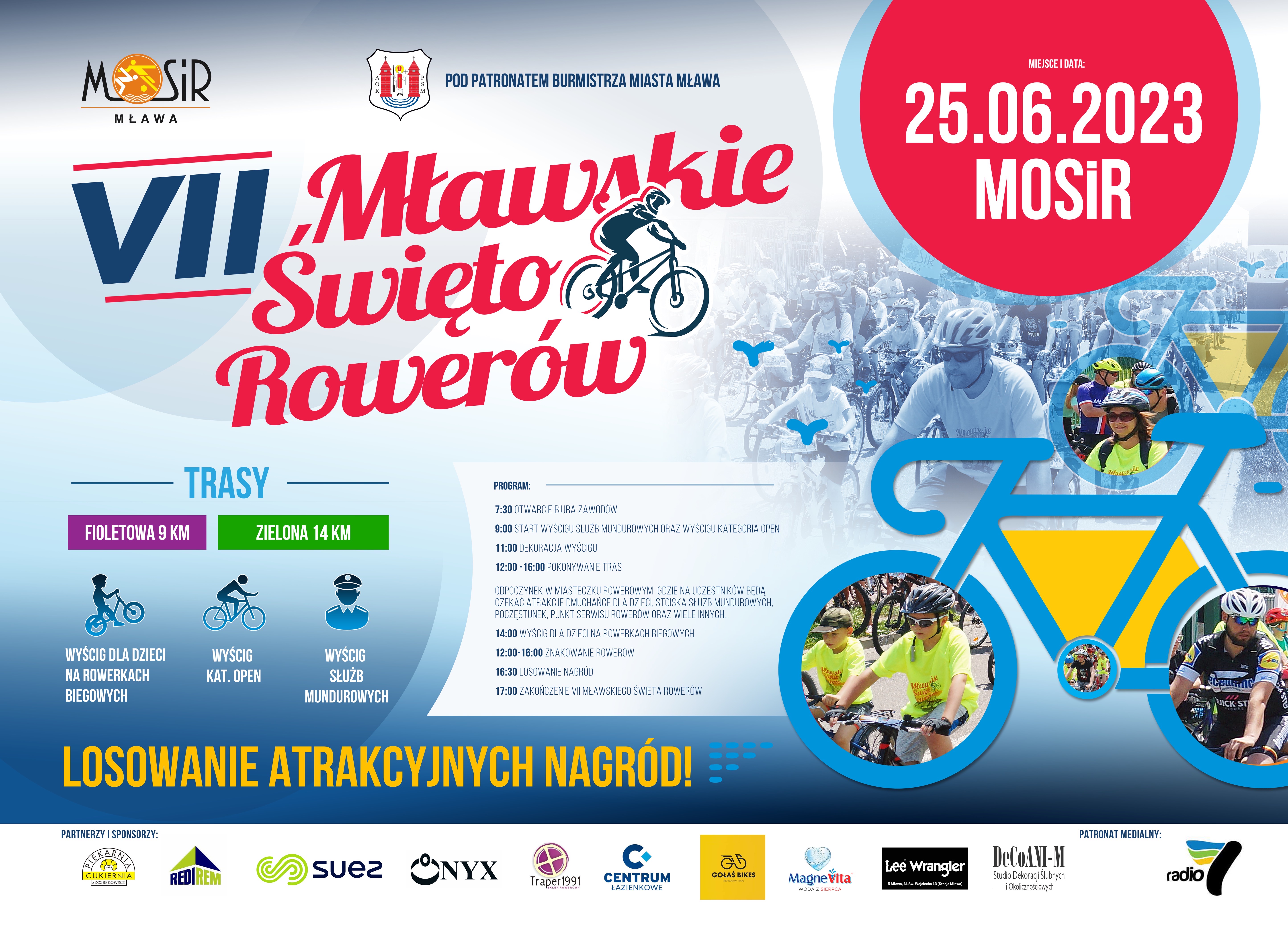 Dnia 25 czerwca 2023 roku na terenie Miejskiego Ośrodka Sportu i Rekreacji w Mławie przy ul. Kopernika 38 odbędzie sie VII Mławskie Święto Rowerów.