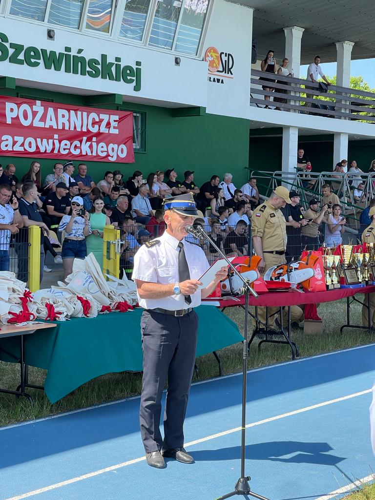 Na zakończenie uroczystości zaproszeni goście wygłosili mowy okolicznościowe. Jako pierwszy głos zabrał nadbryg. Jarosław Piotrowski, podkreślając rolę sportu pożarniczego w kształtowaniu sprawności i umiejętności druhen i druhów, które następnie wykorzystują podczas działań ratowniczo-gaśniczych. Szef Mazowieckiego Garnizonu podziękował w imieniu Sekretarza Stanu w MSWiA Pana Macieja Wąsika oraz własnym wszystkim zaproszonym gościom, organizatorom, kibicom, a przede wszystkim aktorom dzisiejszego pięknego przedstawienia za udział w zawodach wojewódzkich, zapewnienie wielu pozytywnych emocji oraz ducha sportowej rywalizacji. Następnie głos zabrał Wiceprezes Zarządu Oddziału Wojewódzkiego Związku Ochotniczych Straży Pożarnych Rzeczypospolitej Polskiej druh Włodzimierz Wojnarowski, który podkreślił wzorową współpracę Komendy Powiatowej PSP w Mławie z jednostkami OSP i również podziękował wszystkim za tak liczne przybycie i rywalizację fair play.