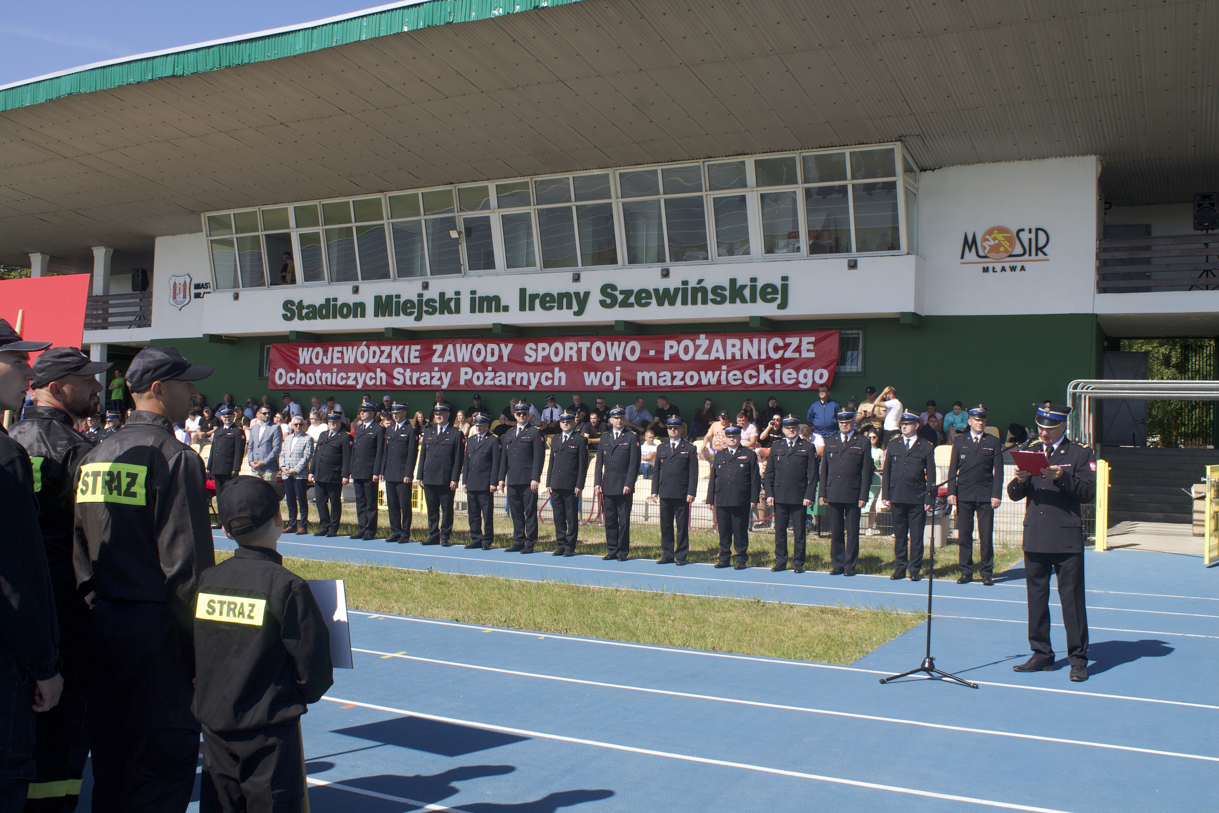 Następnie podniesiono flagę i odegrano hymn państwowy, a gospodarz zawodów bryg. Mirosław Wójcik – Komendant Powiatowy Państwowej Straży Pożarnej w Mławie odczytał list z okazji odbywających się zawodów przesłany przez gen. brygadiera Andrzeja Bartkowiaka Komendanta Głównego Państwowej Straży Pożarnej.