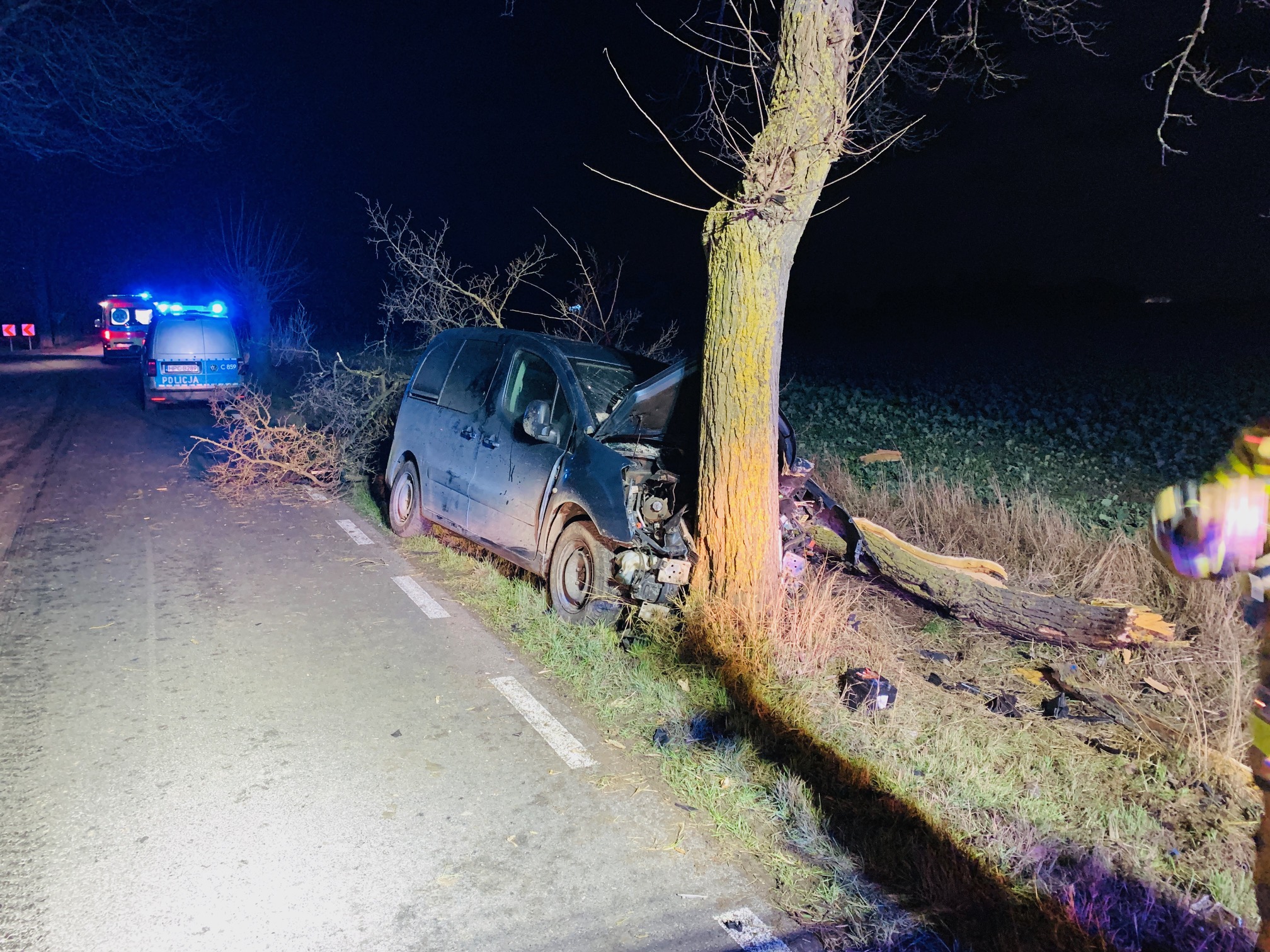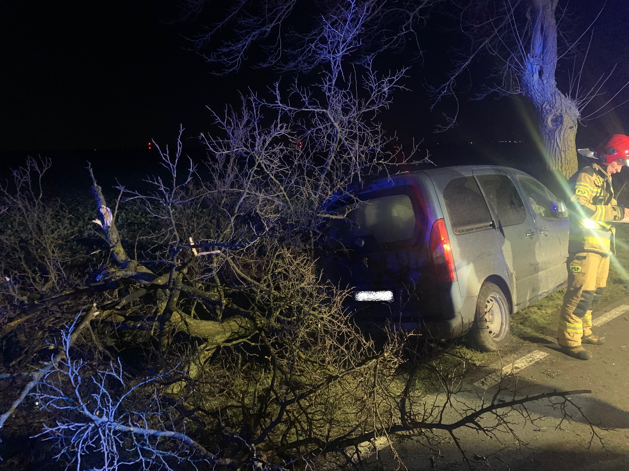 Po przybyciu na miejsce zdarzenia zastano rozbity samochód osobowy na poboczu drogi, po wcześniejszym uderzeniu w 2 drzewa (pierwsze z nich zostało złamane). Wewnątrz pojazdu znajdował się mężczyzna z urazem głowy, przytomny, kontaktowy. Równocześnie z pierwszym zastępem straży pożarnej na miejsce przybyło pogotowie ratunkowe.