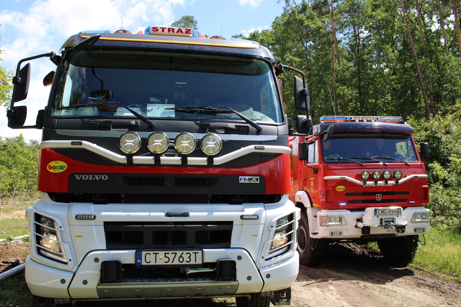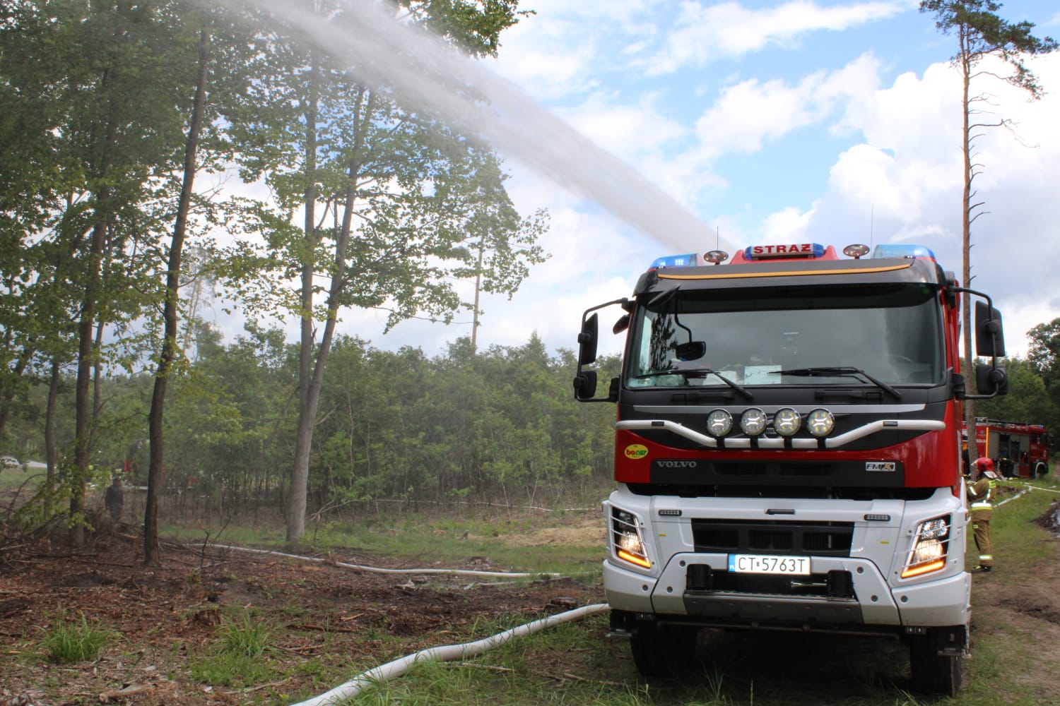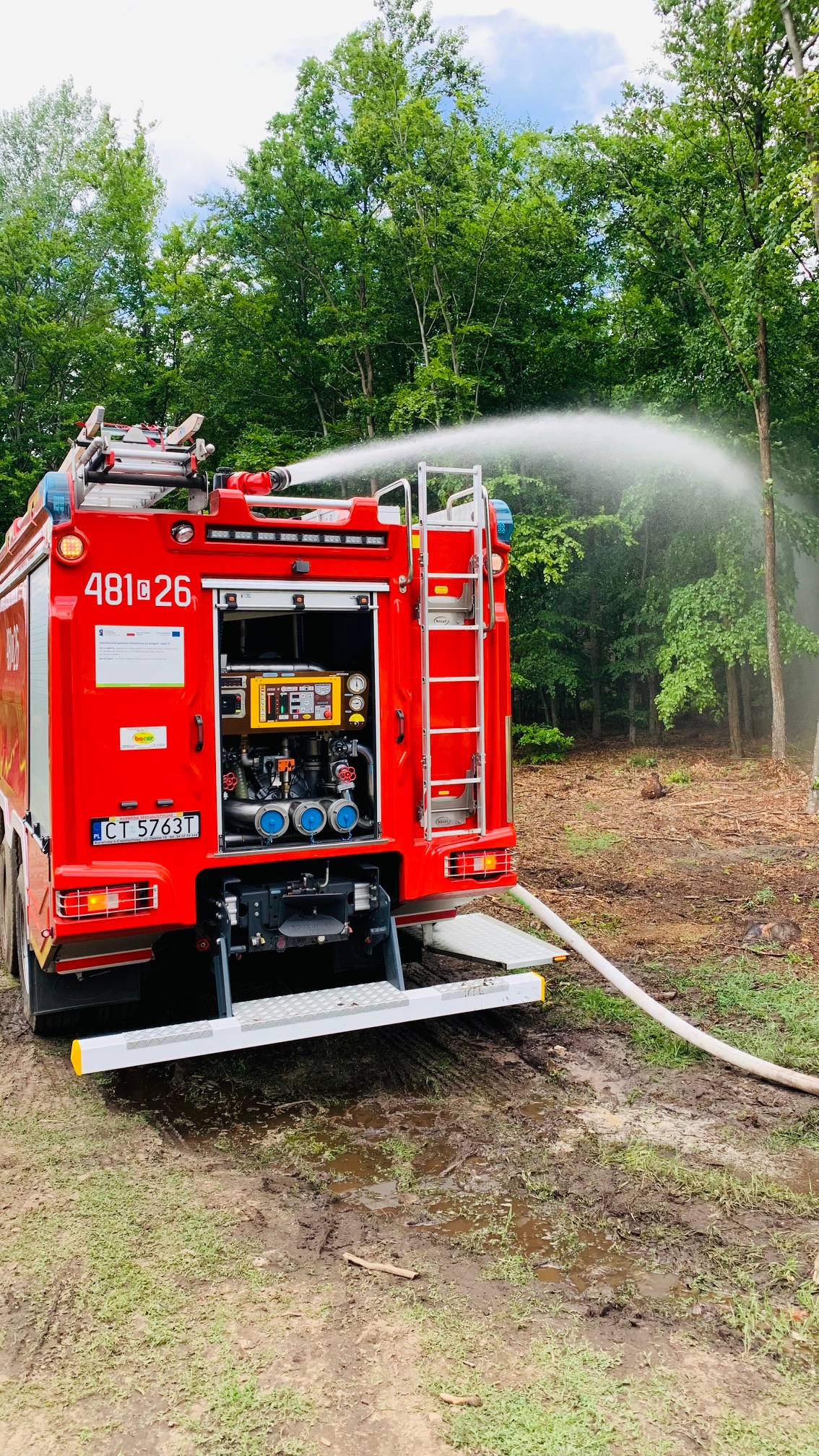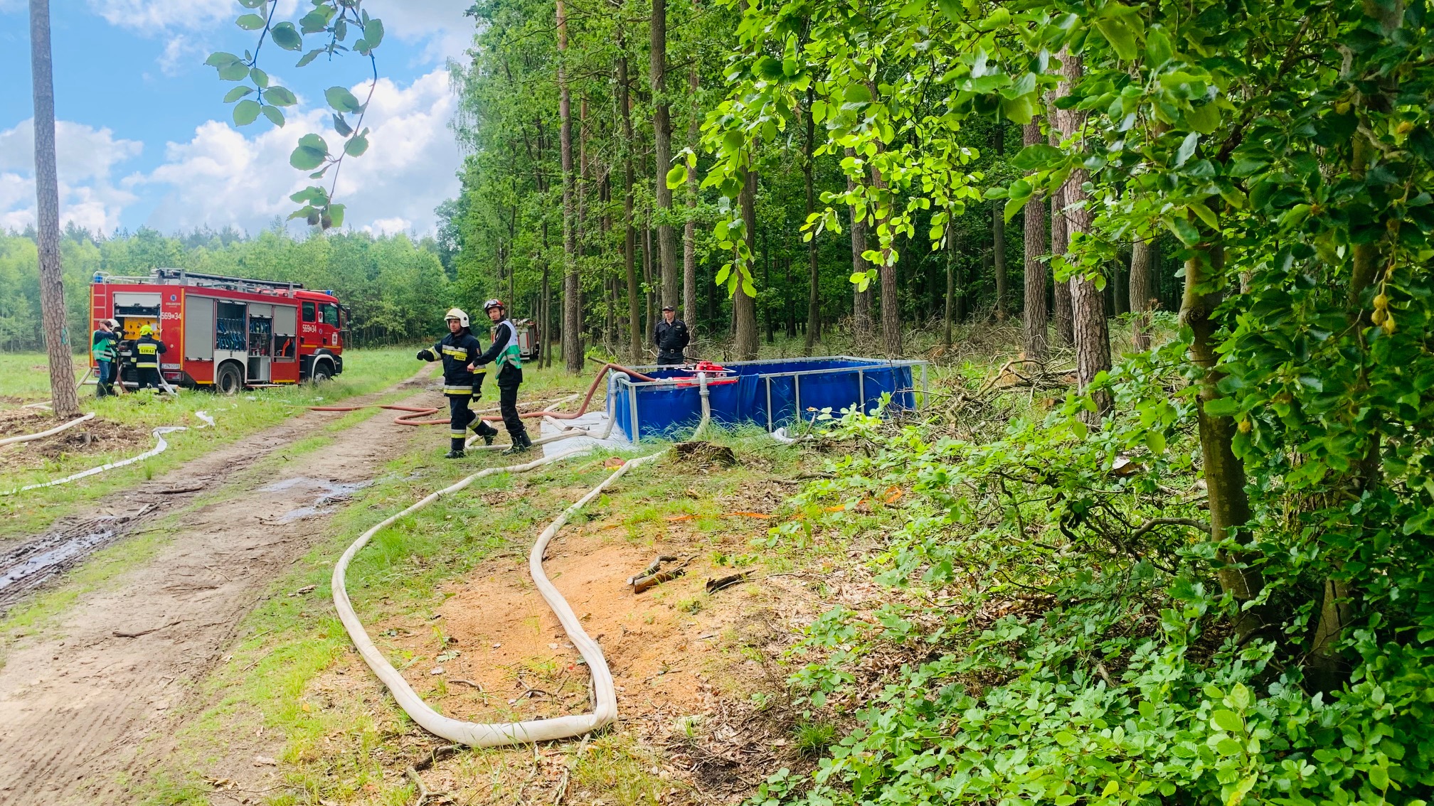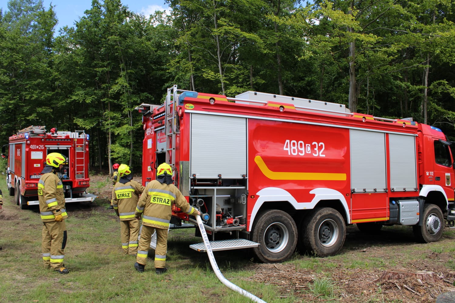 Strażacy wspólnie z przedstawicielami lasów państwowych ćwiczyli gaszenie pożaru lasu wykorzystując taktykę dostarczania wody na duże odległości.