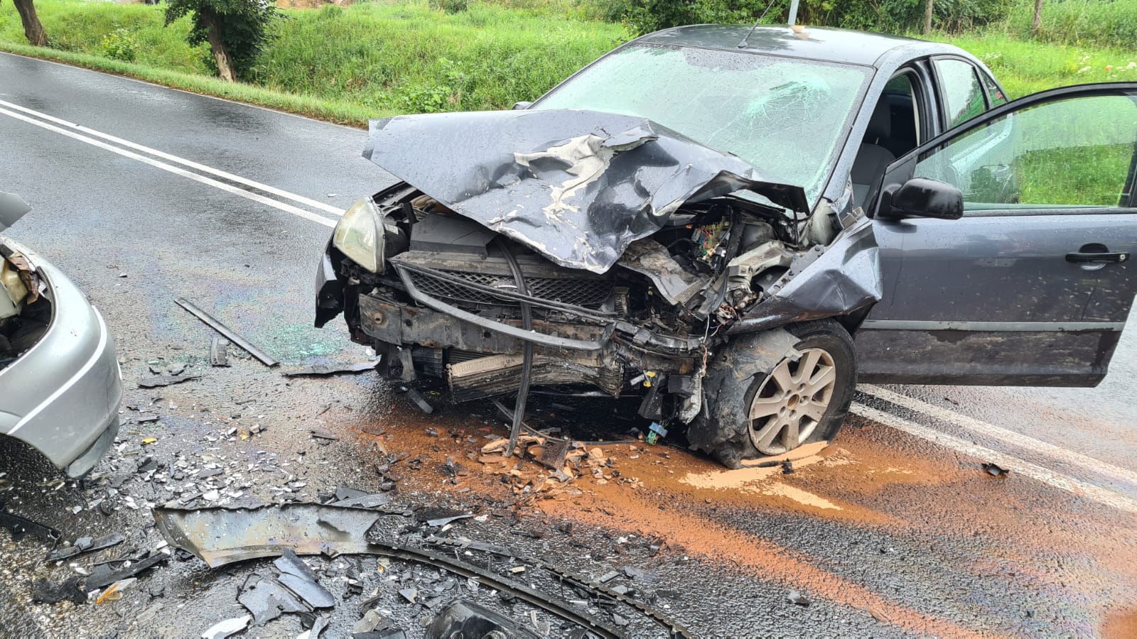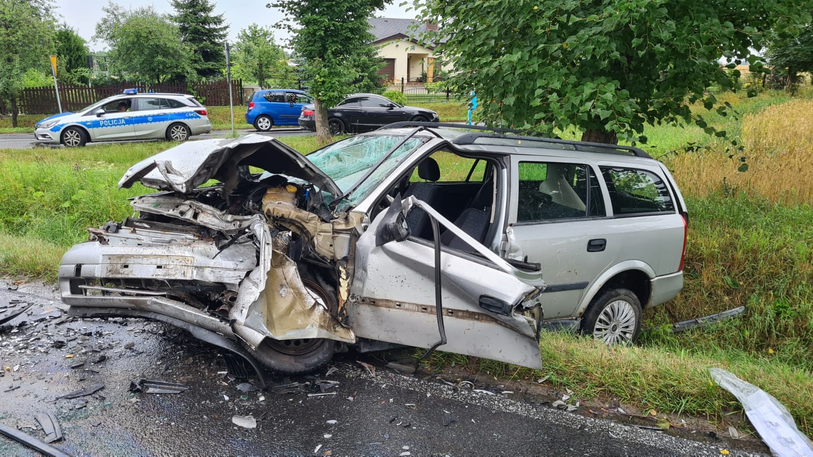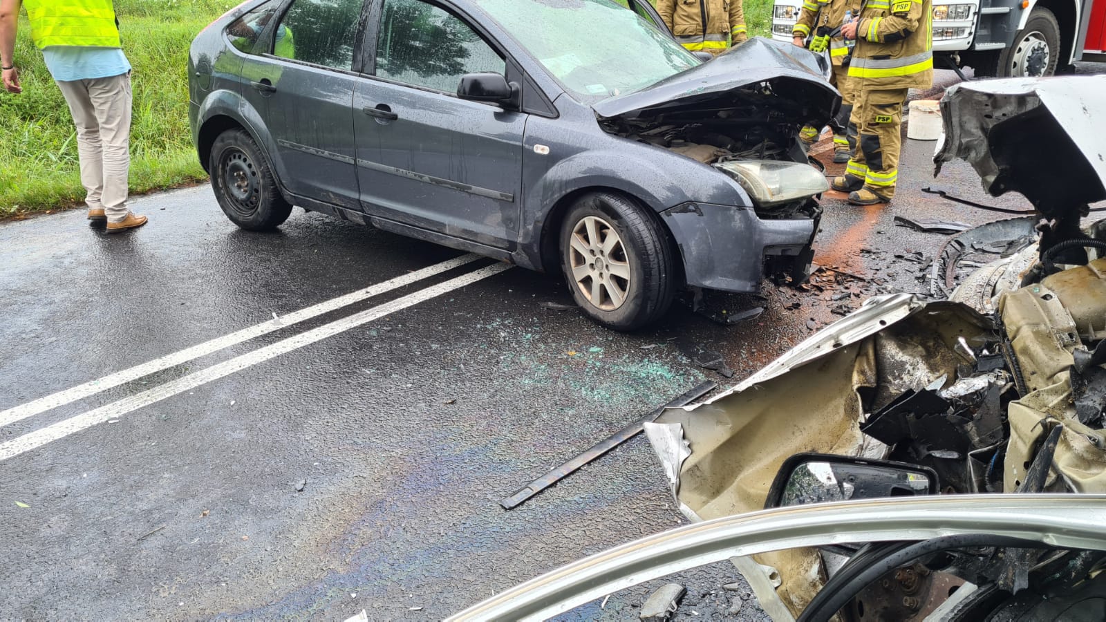 Po przybyciu na miejsce zdarzenia zastano dwa samochody znajdujące się na drodze powiatowej po wcześniejszym zderzeniu. Wewnątrz pojazdów znajdowały się osoby. Samochodem Ford Fokus podróżował mężczyzna, który siedział w samochodzie z zachowaniem świadomości - dostęp zapewniony. Po zaopatrzeniu ran kończyn górnych i dolnych o własnych siłach przeszedł do karetki pod nadzorem ratownika medycznego. Samochodem Opel Astra podróżowały dwie osoby (mężczyzna i nastolatka). Kierujący samochodem świadomy, uskarżający się na ból klatki piersiowej i kończyn dolnych - dostęp wykonano przy użyciu narzędzi hydraulicznych, a następnie wspólnie z zespołem pogotowia ratunkowego ewakuowano na nosze typu deska bezpośrednio do karetki. Pasażerka uskarżała się na ból w klatce piersiowej - dostęp zapewniony. Po wstępnym przebadaniu przemieściła się o własnych siłach do karetki pod nadzorem strażaków i ratowników medycznych.