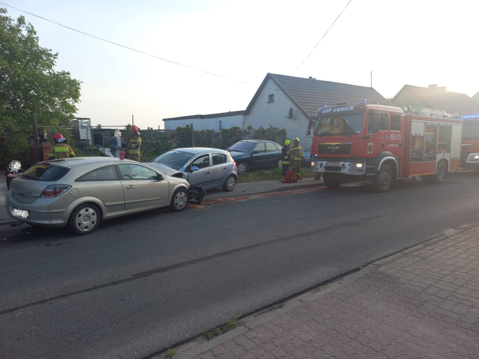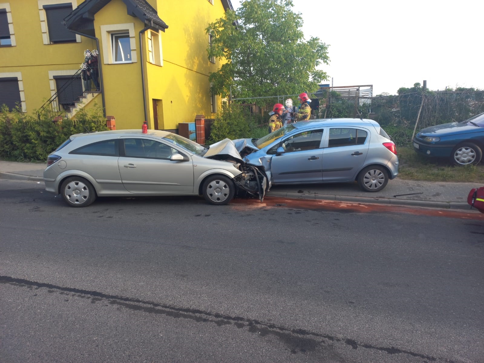 Po przybyciu na miejsce zdarzenia zastano dwa rozbite pojazdy osobowe (po zderzeniu czołowym) na jednym pasie ruchu. Pojazdami podróżowały trzy osoby (jedna osoba w samochodzie Opel Astra, dwie osoby w pojeździe Opel Corsa), które znajdowały się poza pojazdem na chodniku. Pasażer Opla Corsy z widoczną raną głowy. Kierowcy pojazdów bez widocznych obrażeń.